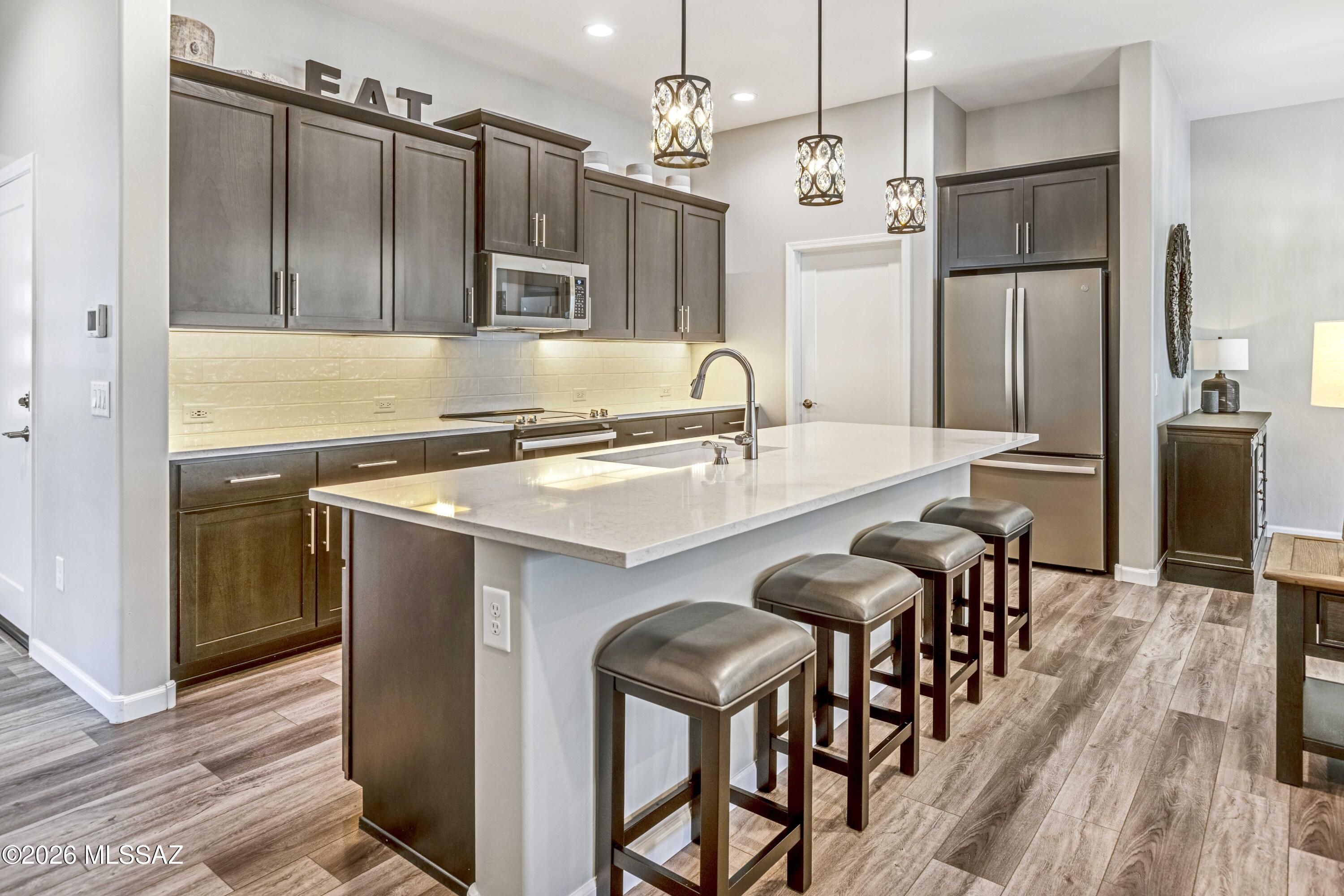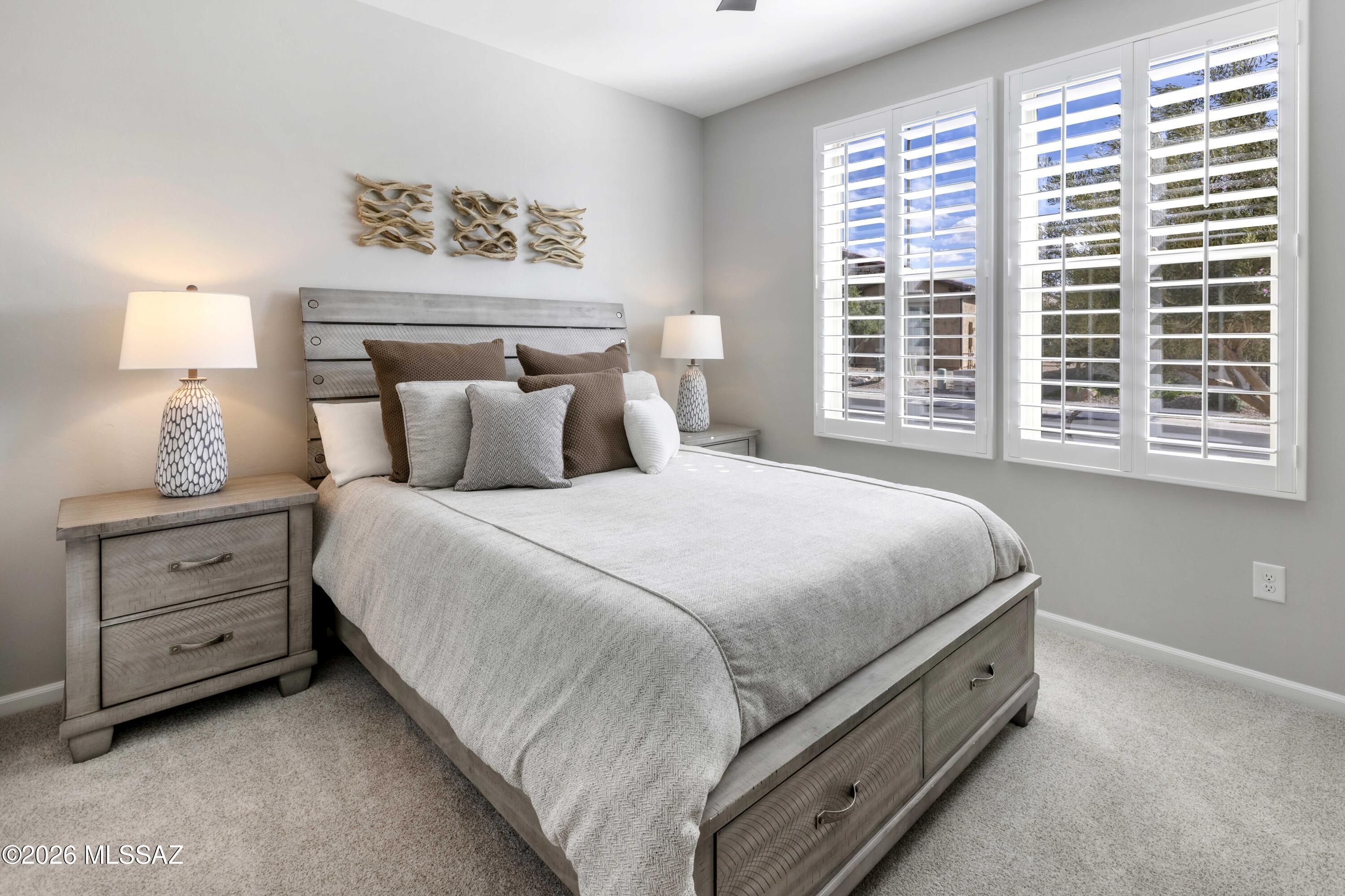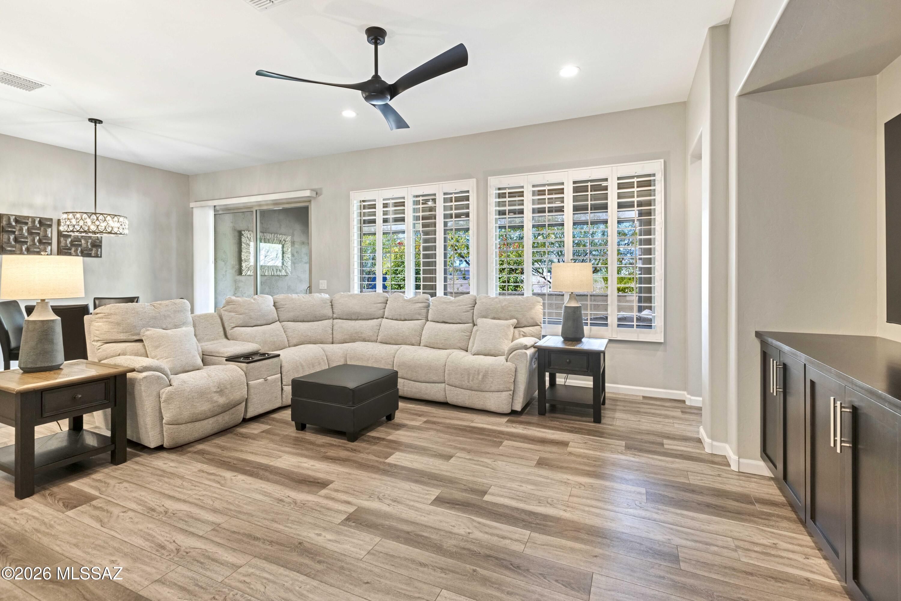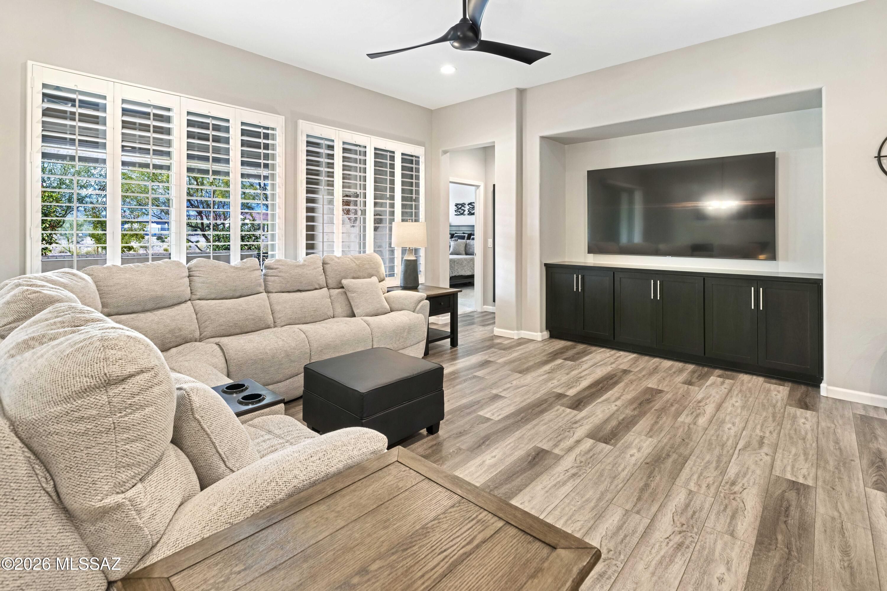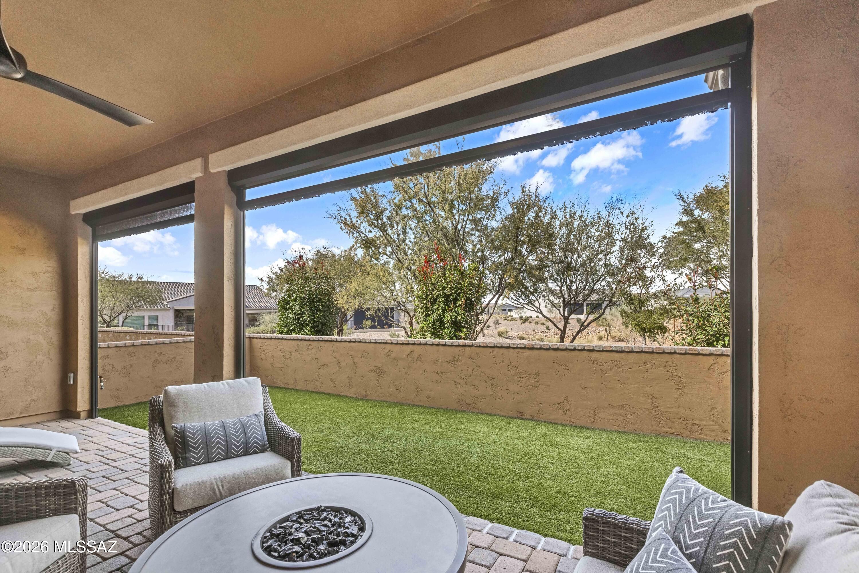 Luxurious upgraded Viva model in SaddleBrooke Ranch! 2021-built 2BR/2BA Villa with a den ! 1,655 sq ft of premium features. Chef's kitchen boasts 41'' upgraded cabinets, crown molding, quartz counters, Blanco sink, and upgraded backsplash. PARADIGM luxury vinyl flooring with plush bedroom carpet. Master suite features rain glass shower, comfort height toilets, walk-in closet with built-ins. Smart home amenities include dimmer switches, USB outlets, TV mounts. Outdoor paradise: extended arroyo (rare!), paver patio, turf courtyard, gas stub, rolling shades. Garage has Outdoor Creations coating, utility sink, custom storage, golf cart outlet. Home boasts upgraded appliances, plantation shutters, security doors. Perfect 55+ lifestyle!