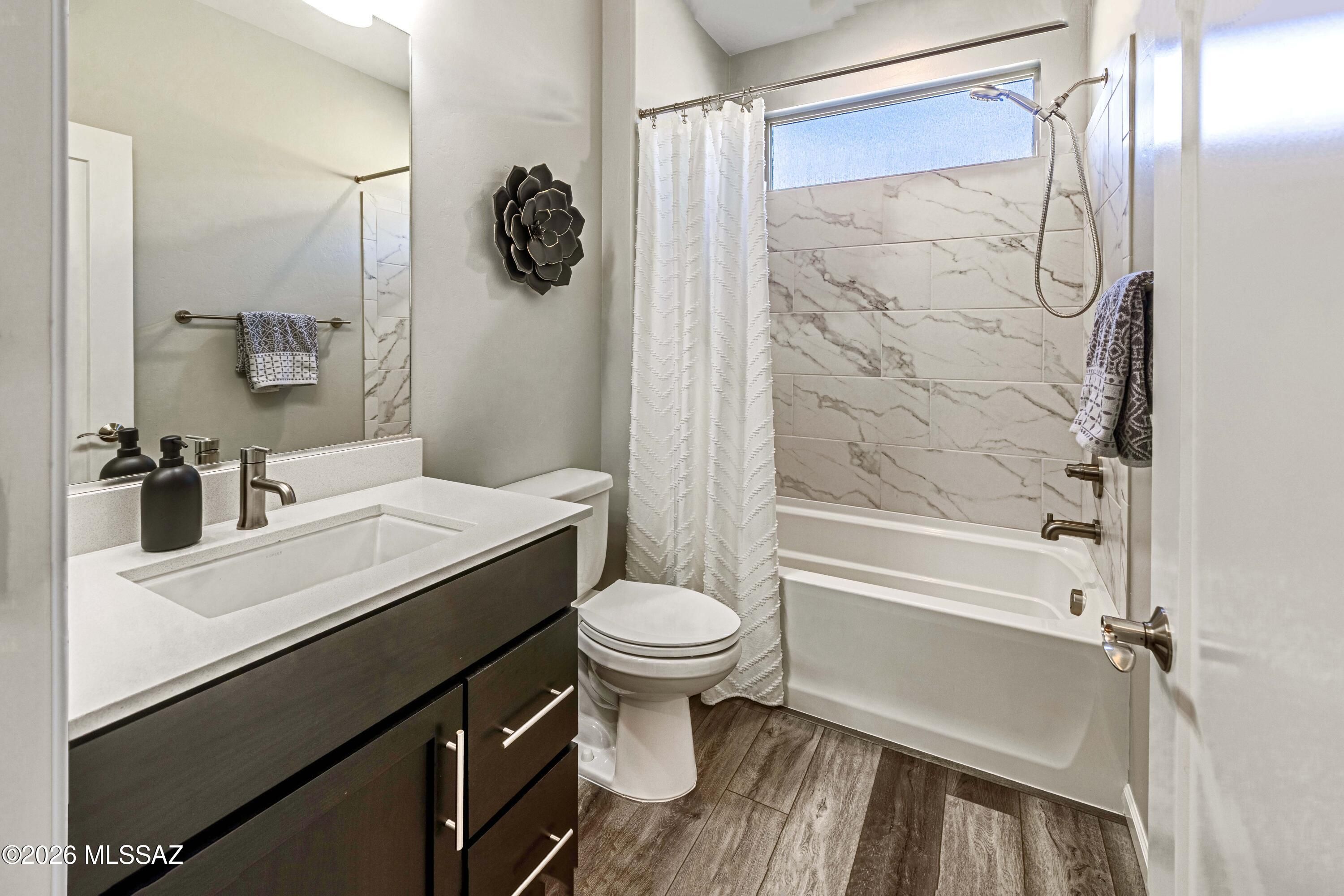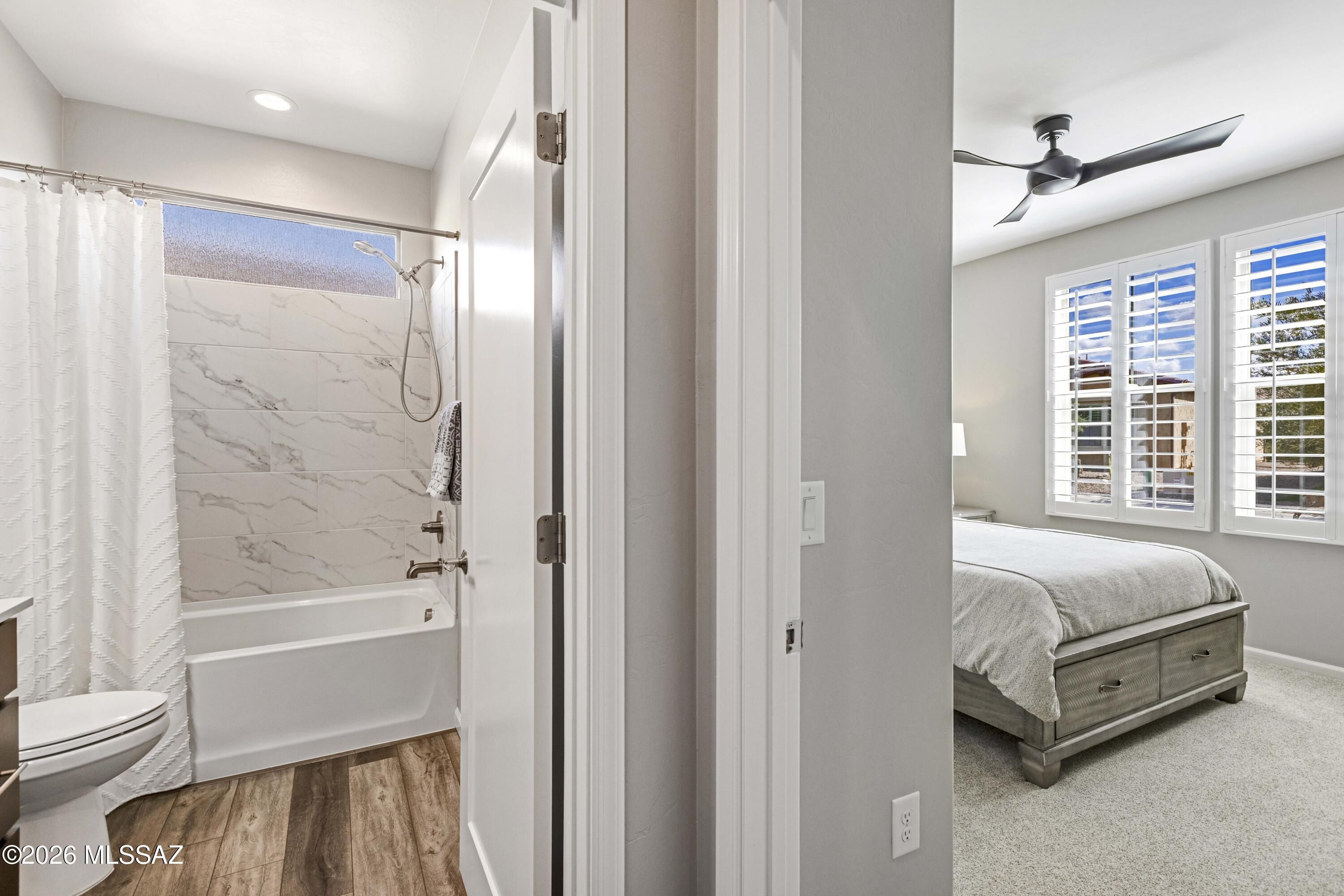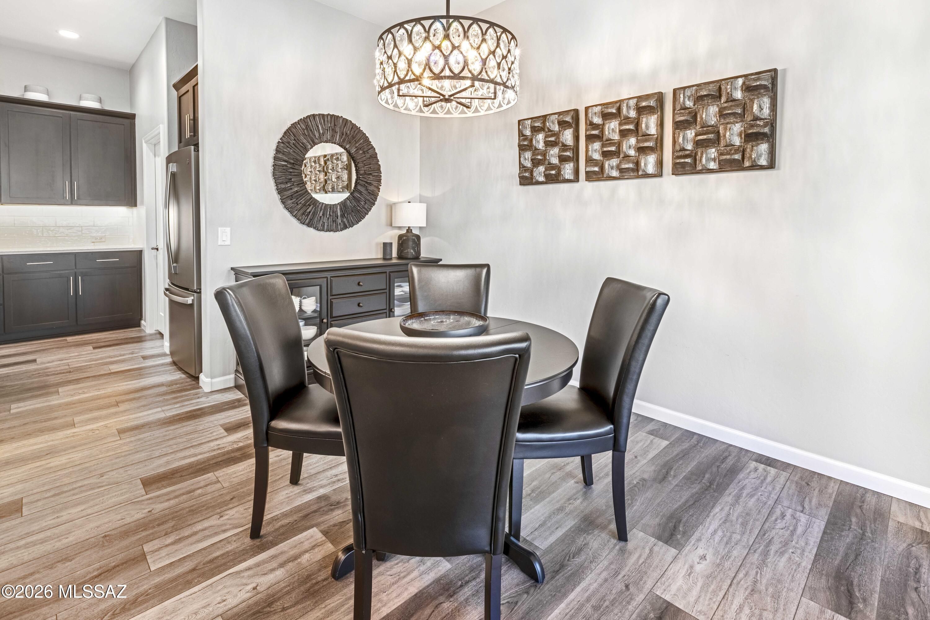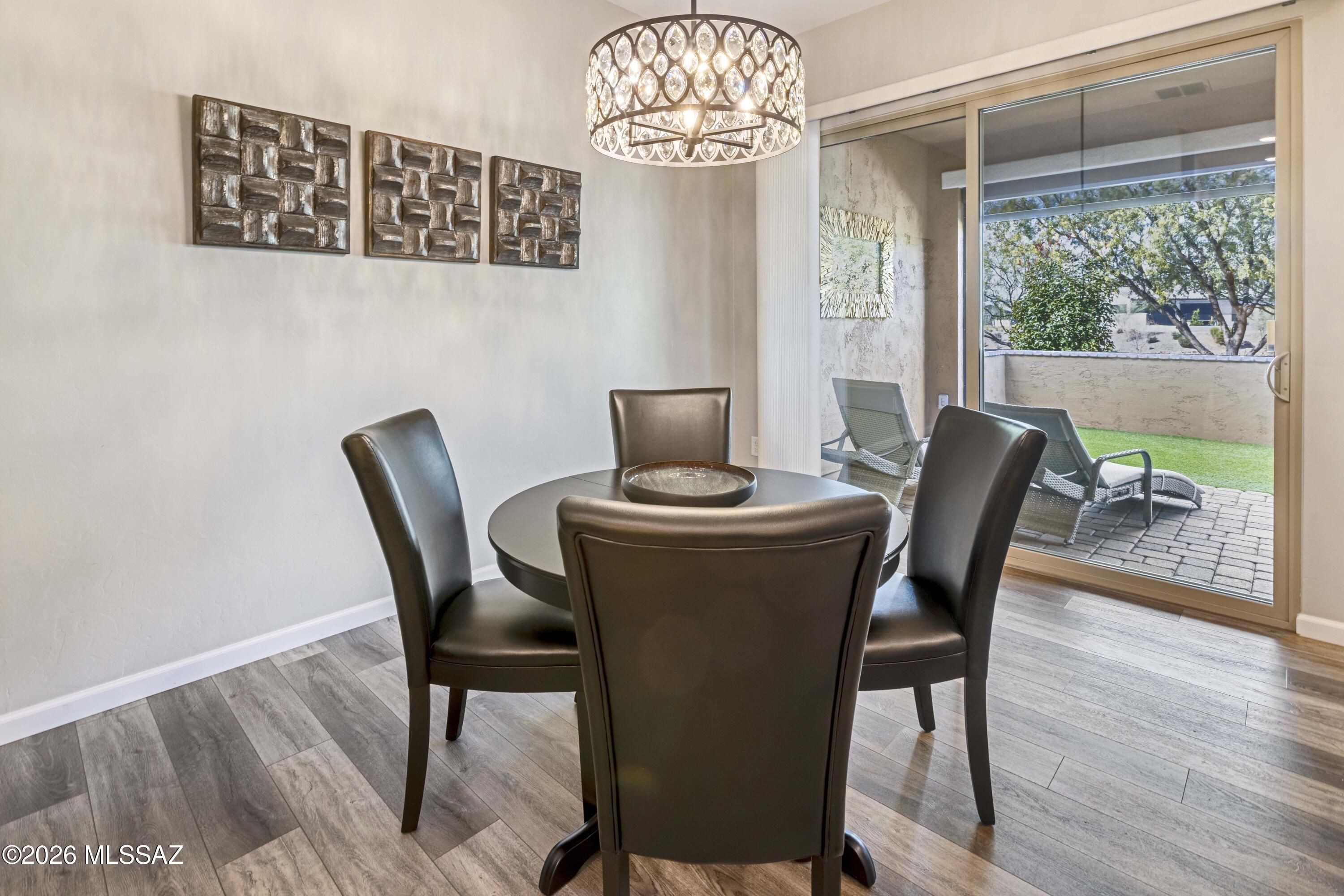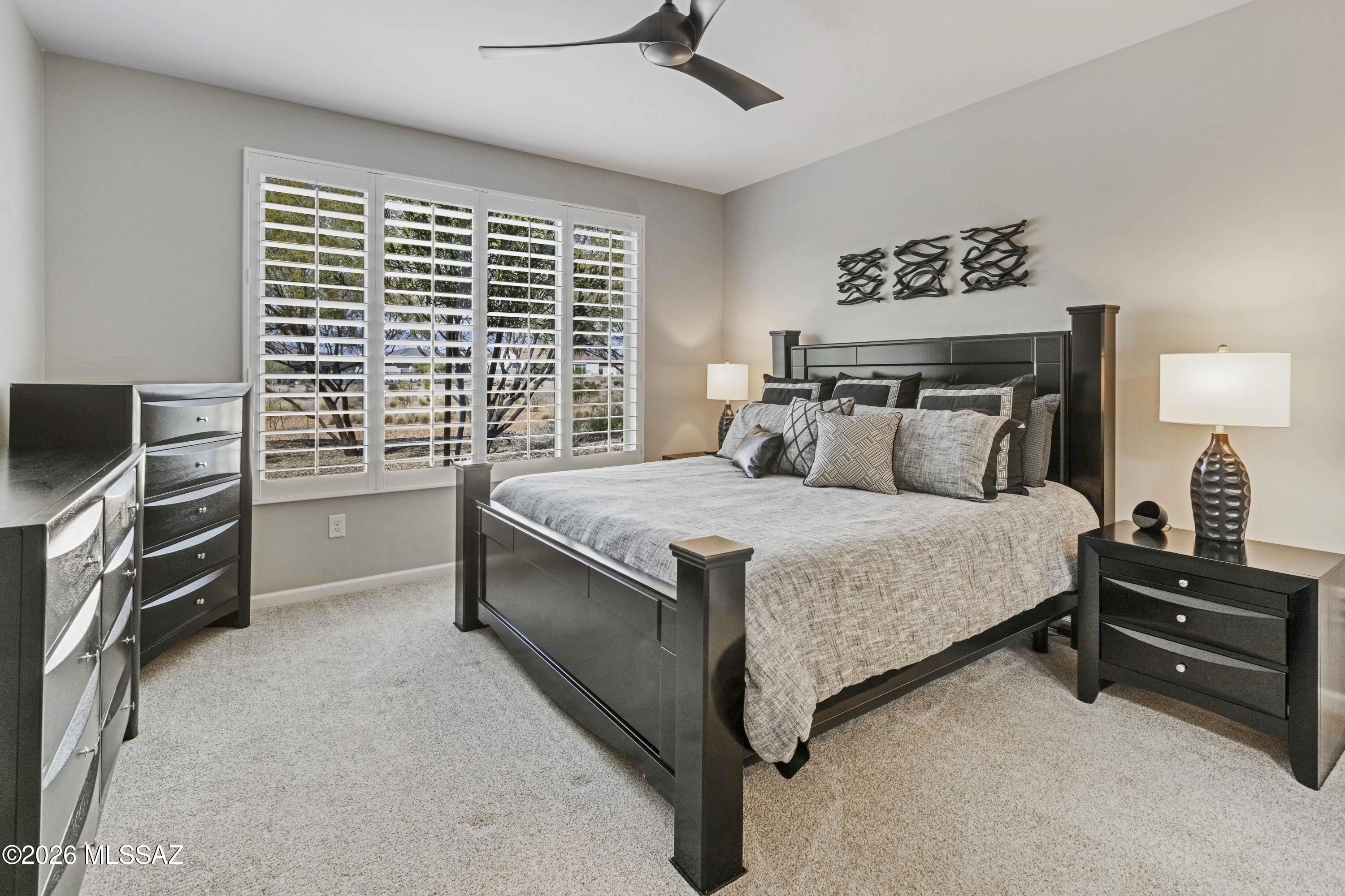 Luxurious upgraded Viva model in SaddleBrooke Ranch! 2021-built 2BR/2BA Villa with a den ! 1,655 sq ft of premium features. Chef's kitchen boasts 41'' upgraded cabinets, crown molding, quartz counters, Blanco sink, and upgraded backsplash. PARADIGM luxury vinyl flooring with plush bedroom carpet. Master suite features rain glass shower, comfort height toilets, walk-in closet with built-ins. Smart home amenities include dimmer switches, USB outlets, TV mounts. Outdoor paradise: extended arroyo (rare!), paver patio, turf courtyard, gas stub, rolling shades. Garage has Outdoor Creations coating, utility sink, custom storage, golf cart outlet. Home boasts upgraded appliances, plantation shutters, security doors. Perfect 55+ lifestyle!