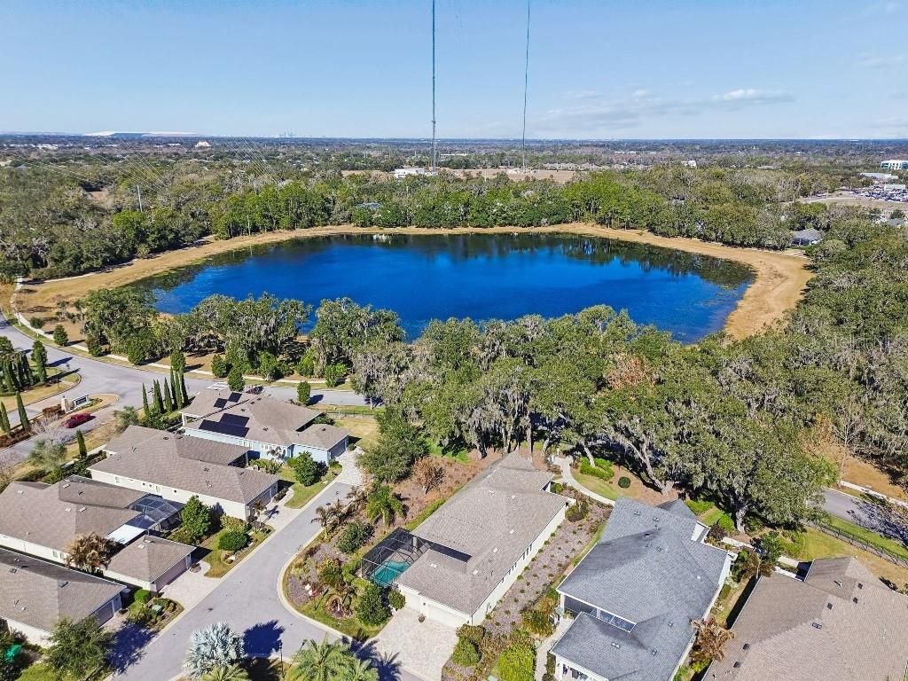 This high quality built David Weekley home is located in the 55+ gated community of Encore at Fishhawk Ranch West. The home features 2 bedrooms, 2 1/2 baths, huge open kitchen, eat-in area, great room, separate dining room and bonus room for formal living or office or fitness. The kitchen features a gas cooktop, wall convection oven with microwave, upgraded quartz countertops, backsplash, 42" painted wood cabinets with crown molding, large stainless-steel sink with accessories, and kitchen quartz island with included 6 counter stools. All flooring is upgraded ceramic tile. No carpet. Owner's suite has crown molding, tray ceiling. The Master bath has dual sinks with marble countertops, framed mirrors, arch ceiling detail, plenty of cabinets and drawers, separate walk -through shower, soaking tub with decorative tile surround, water closet and huge walk-in closet. The second bedroom includes an ensuite with marble countertops and beautiful view of Lake Hutto. The screened, paver lanai is the perfect place to entertain family, friends and neighbors. The pool/spa has a waterfall feature, lighting, Natural Gas Heater, and 8 jets with a seating ledge. The front porch offers a covered and non-covered area for a lake view through the large oak trees. The 3 car garage allows plenty of storage (pull down attic door with stairs) plus 3 parking spaces on the paver driveway. The home includes water softener, 2 separate rooms with surround sound, security system, ceiling fans in all rooms (except dining rm) and three on lanai. Entire Yard Was Upgraded With $25,000 Of Florida Friendly landscaping. Encore offers a full-time Lifestyle Team which plans and organizes community events. The HOA fee covers yard maintenance, cable & high-speed internet. Encore's state-of-the-art Oasis Clubhouse offers a resort style heated pool, spa, pickle ball courts, bocce courts, grill stations, outdoor TV, fireplace, fitness center, card & game rooms. Owners in Encore have full access to Fish Hawk Ranch West amenities including Lake House, fitness center, community pool & recreation room.
