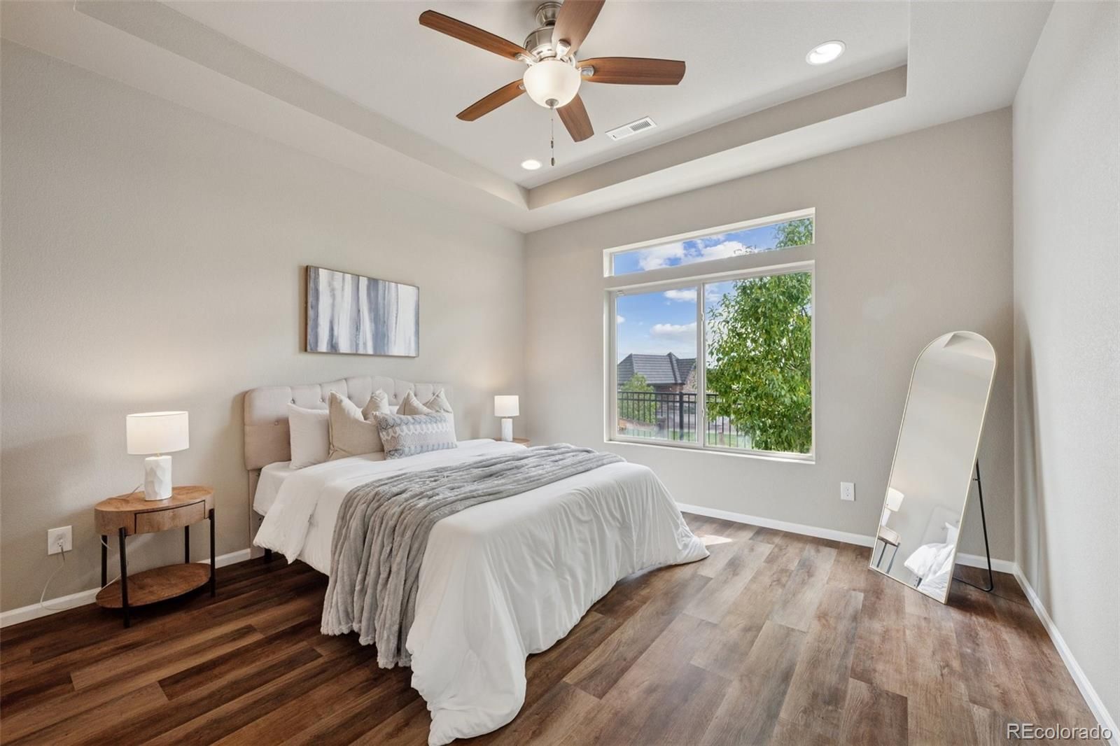 This beautiful 2-bedroom, 2-bathroom home with a flex space and attached 2-car garage offers the perfect blend of comfort, convenience, and active living. Enjoy stunning Front Range and Pikes Peak views from your southwest-facing back patio. Just a 5-minute walk to the community recreation center, you’ll have access to a pool, fitness center, pickleball courts, and a full calendar of activities—from bingo and dances to art and exercise classes. Inside, the home features LVP flooring throughout and extra windows for natural light. The kitchen shines with a large granite island, spacious pantry, and stylish black stainless steel appliances. The primary suite features an expanded walk-in closet and a luxurious bathroom featuring a zero-entry shower and double vanity. A second bedroom and full bath make an ideal guest space or hobby room, while the flex room offers the perfect spot for a home office or formal dining. This like-new, accessible home is in one of the best locations in The Retreat and is truly move-in ready. Don’t miss your chance to live in this vibrant 55+ community!