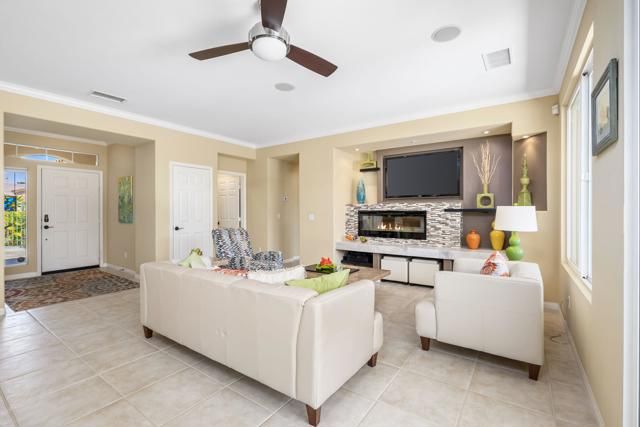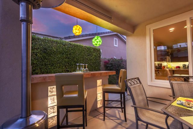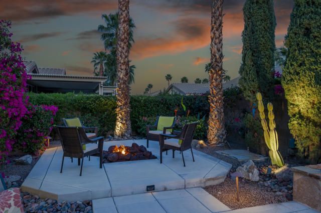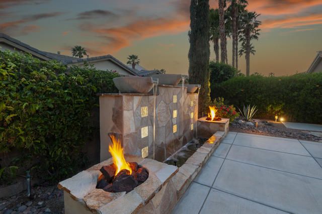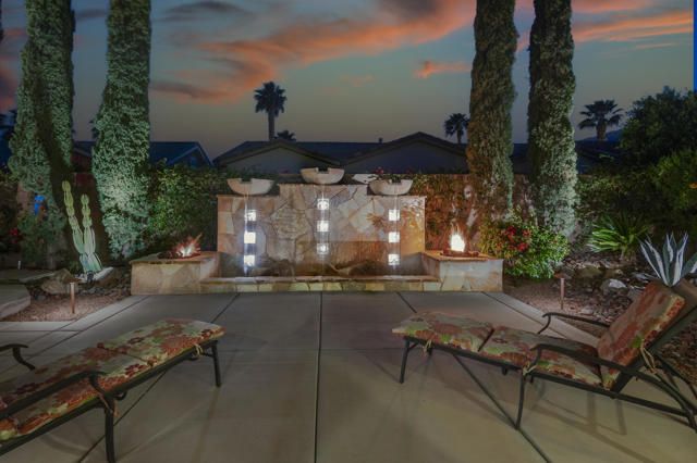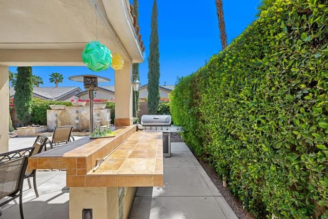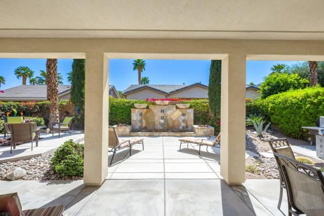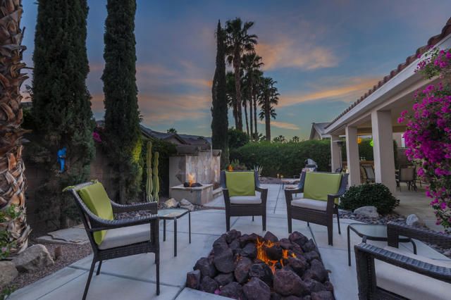 Live Life Beautifully in this bright and cheery Maurea model 1,641 SQ FT home with 3-bedrooms and 3-bathrooms including a detached Casita. Indoor, this delightful home with high ceilings and big picture windows offers exquisite contemporary built-in design elements and decor. Outdoor, the home offers the ultimate in day and night time relaxation and entertainment with peak-a-boo southern mountain views and custom features, including a luxurious cascading waterfall with built-in glass-block lighting and blazing fire bowls on either side, a built-in bar and BBQ area, and raised patio with seating around a lava stone firepit. The home is available Turnkey furnished including the beautifully curated furnishings and interior decor. The kitchen, dining, and great room flow seamlessly making the home feel much larger. The great room has crown molding and a custom crafted media center with linear fireplace, glass tile surround, and built-in big-screen TV. The kitchen meets every cook's needs, with gas cooktop and range, new microwave, dishwasher, beautiful wood cabinets and smooth slab granite on the kitchen counters. The kitchen and dining areas are open to the great room keeping you engaged with family and friends while cooking and entertaining. The primary bedroom suite is spacious and elegant, and the bathroom features dual vanities, a large walk-in shower with travertine stone surround, a linen-closet, and large walk-in closet. The guest bedroom is roomy with a mirrored closet and is located next to a full guest bath. Guests will love the privacy of the roomy detached Casita with closet and full bath. The garage has storage and fits 2-cars and a golf cart.