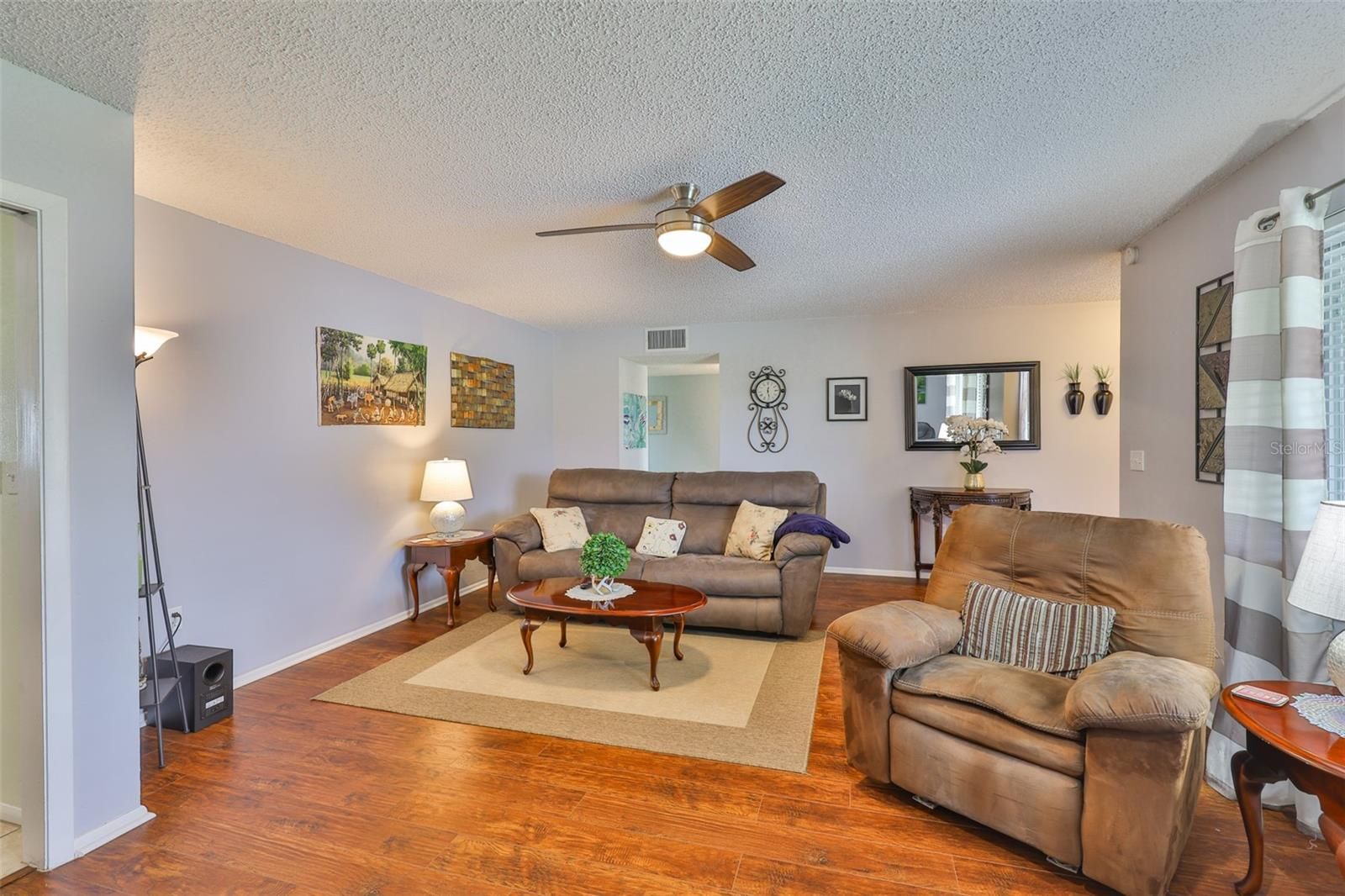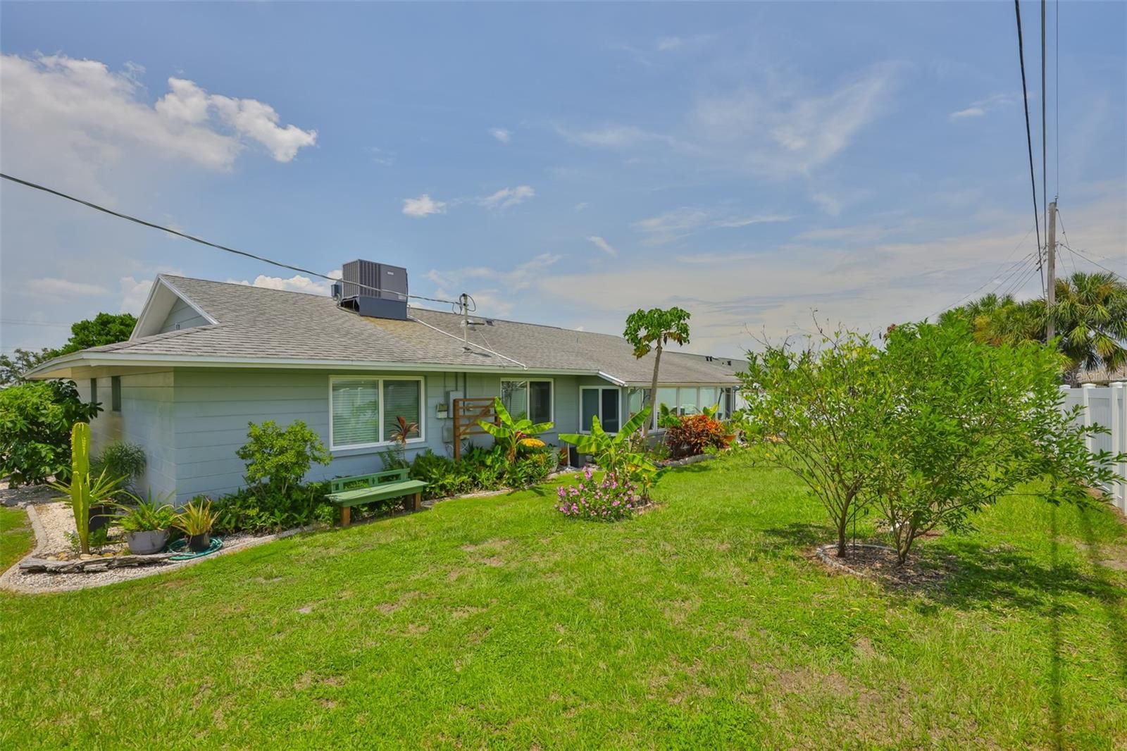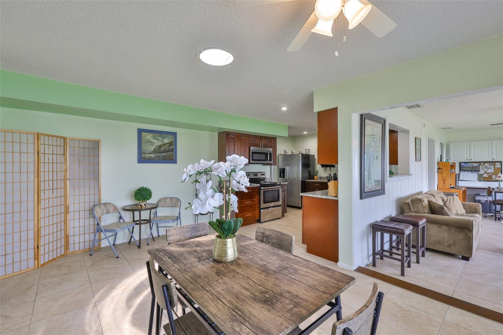 Welcome to this beautifully maintained single-story home offering just under 2,000 square feet of thoughtfully designed living space. From the moment you arrive, the charming front porch invites you in, setting the tone for the warmth and comfort you'll find inside. Step into formal living and dining areas perfect for entertaining with engineering hardwood flooring, while the updated kitchen features stylish finishes and modern conveniences. This home boasts a seamless blend of tile and laminate flooring throughout, recessed lighting, and a water softener system for added comfort. The air conditioning system was replaced just one year ago, providing peace of mind for years to come. Step outside to the extended pavered lanai perfect for relaxing evenings or weekend gatherings. A separate workshop offers space for hobbies, storage, or creative projects. Furniture can be included in the sale, making this home truly move-in ready. Golf cart? yours too! Meticulously cared for and loaded with great features, this property is a must-see. The backyard is the perfect size for your weekend BBQ's and let's not forget the Florida room perfect area for entertainment. Don't miss the opportunity to make it yours!