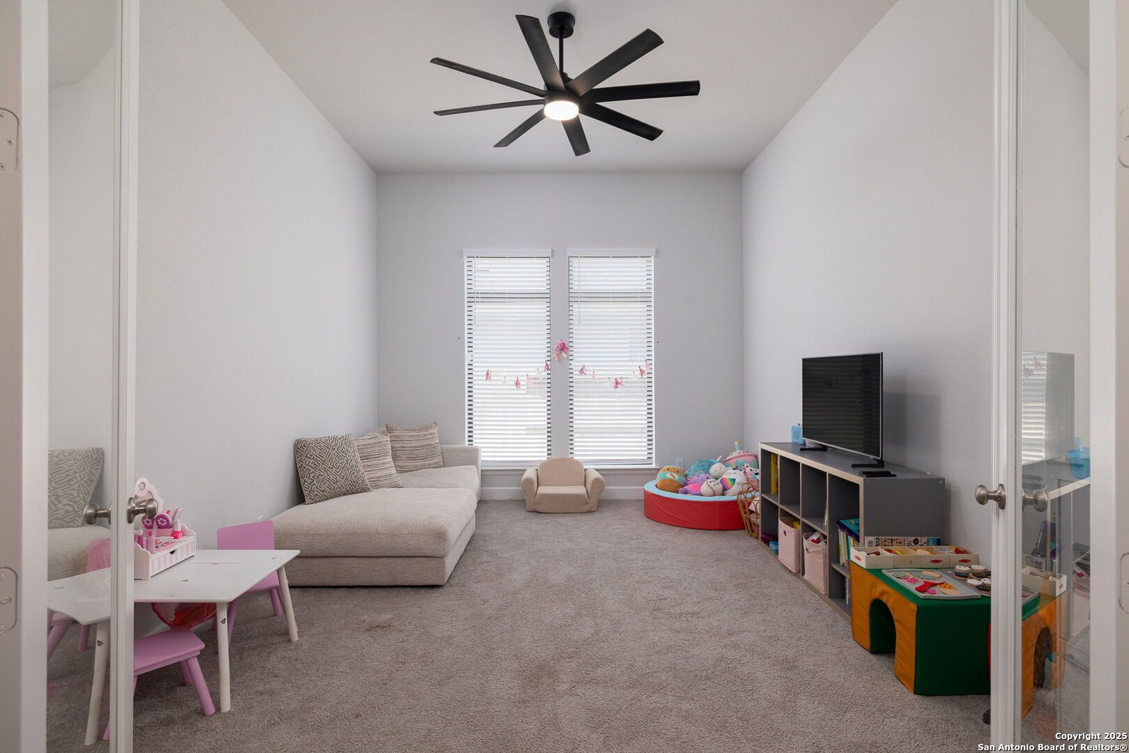Skip the wait and hassle of building-this beautifully maintained Perry Home is better than new, offering upgraded features, a flowing open layout, and thoughtful design throughout. From the moment you enter the extended hallway with soaring 12-foot ceilings, you'll notice the quality craftsmanship and spacious feel. A private home office with French doors is tucked near the entry, while a game room-also enclosed with French doors-adds flexibility for work or play. The open-concept family room, anchored by a wood mantel fireplace, seamlessly connects to the dining area and the gourmet island kitchen, featuring a 5-burner gas cooktop, reach-in pantry, and abundant counter and cabinet space. The secluded primary suite offers a relaxing retreat with French doors leading into a spa-like bath complete with dual vanities, a garden tub, a glass-enclosed shower, and a spacious walk-in closet. A guest suite with its own full bath and walk-in closet offers privacy and comfort for visitors, while the third and fourth generously sized bedrooms share a well-appointed full bathroom. Additional highlights include epoxy-coated garage floors, ceiling fans throughout the home-including one on the covered patio to help you stay cool in the Texas heat. The extended concrete driveway, and wraparound sidewalk to the side yard provide easy access to dedicated trash bin storage. The home also features a full irrigation system for easy lawn maintenance and year-round curb appeal. Located just minutes from top-rated schools, grocery stores, and major highways, this home offers an easy and convenient commute while still nestled in a peaceful community setting. A perfect blend of comfort, style, and function-this one is move-in ready and waiting for you!