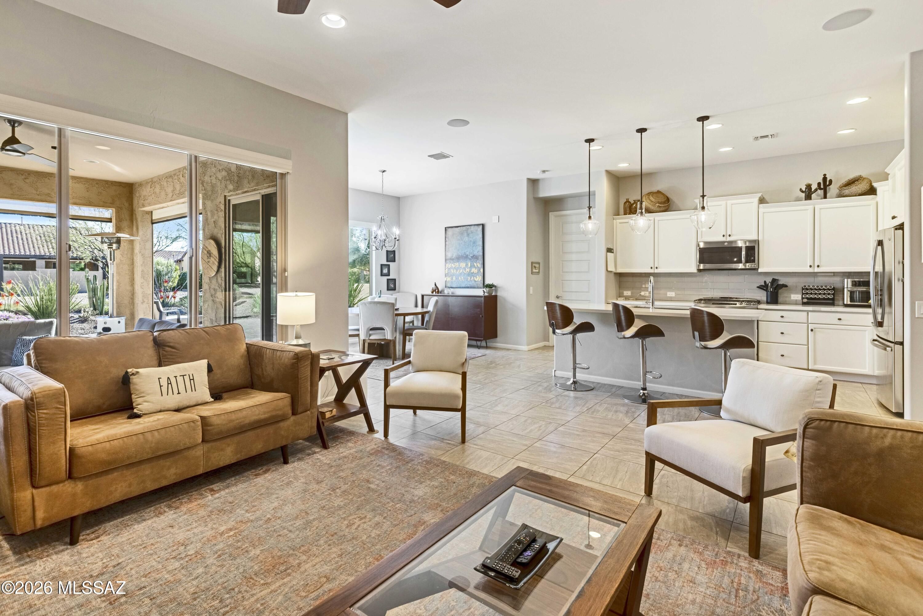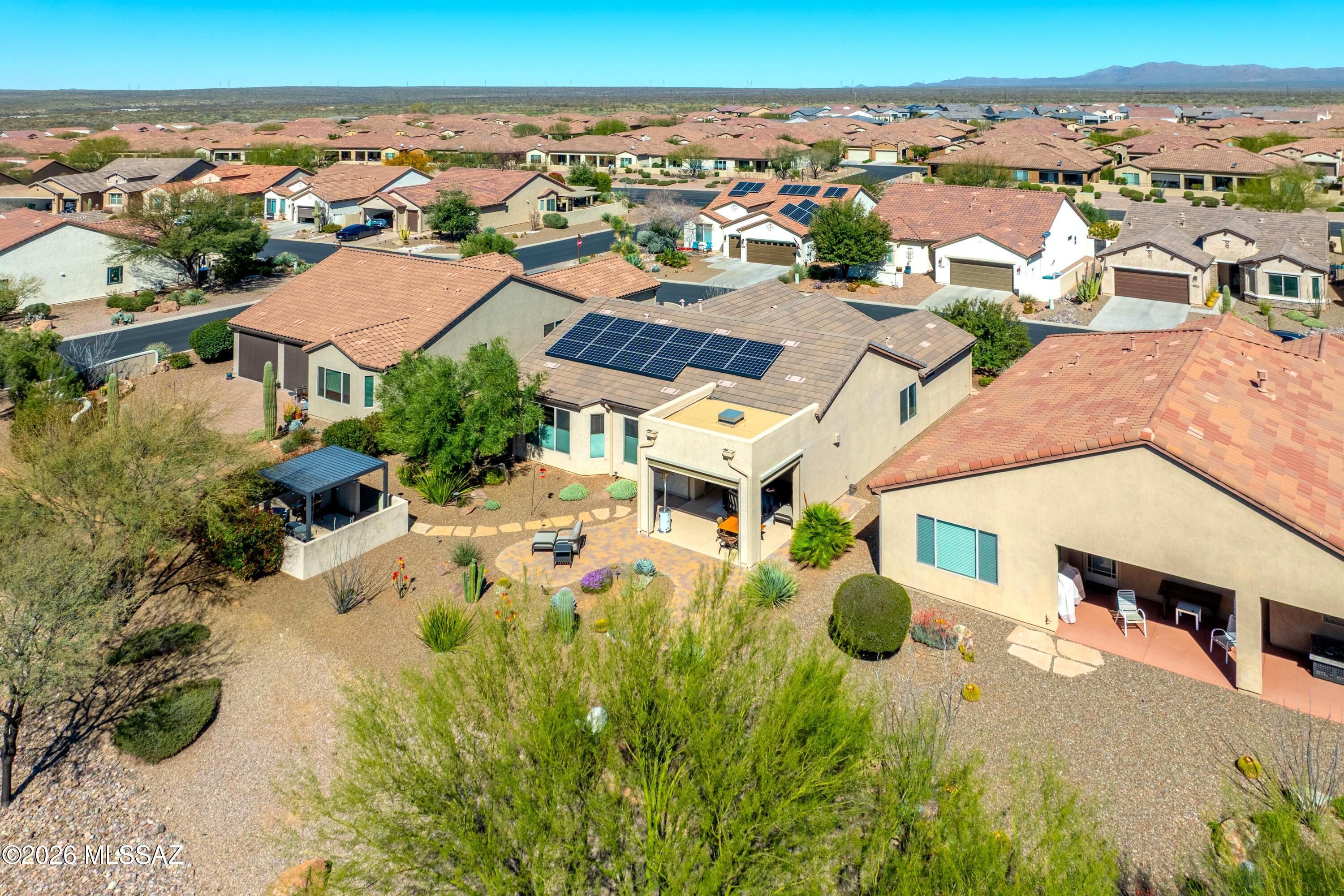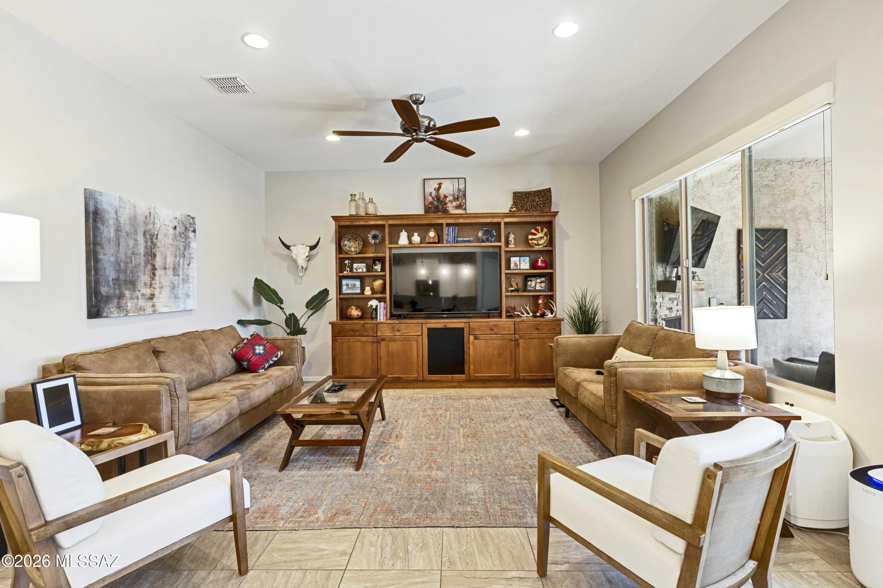 Ideally located close to the exceptional amenities of SaddleBrooke Ranch, this beautifully upgraded Hermosa plan offers bright, open living with 8' interior doors throughout and a clean, neutral palette.The light-filled kitchen features upgraded cabinetry, abundant storage, and a gas range--perfect for everyday living and entertaining. The den with double doors includes a Murphy bed that conveys, providing flexible space for guests or a home office. The spacious primary suite offers an upgraded custom closet system designed for organization and ease.Outdoor living is a true highlight with a charming back patio fireplace and mantle, rolling shades for year-round enjoyment, and a covered pergola area ideal for a future hot tub or outdoor kitchen.Additional features include: