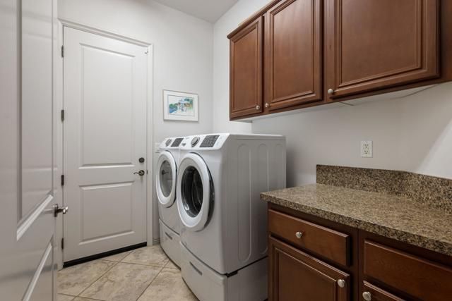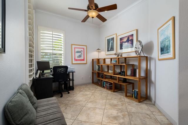 Perched on an elevated lot overlooking the iconic #3 hole at the Trilogy Golf Club at La Quinta, this impeccably maintained Caspian plan delivers 1,775 sq. ft. of stylish single-level living with two bedrooms, two baths, and a versatile den/office that easily doubles as a third bedroom. Elegantly finished with crown molding, plantation shutters, a dedicated dining room, and tile flooring throughout, the home's inviting great room showcases a cozy fireplace, surround sound, custom built-in shelving, and sweeping views of the pool/spa, mountains, and pristine fairway. The chef-inspired kitchen shines with a pendant-lit island, stainless steel appliances, double ovens, slab granite countertops, a chic glass tile backsplash, abundant cabinetry, and a walk-in pantry. Guests will appreciate their private retreat with an adjacent renovated bath. At the same time, the luxe primary suite impresses with French doors opening to the pool/spa and an en suite bath featuring dual vanities, travertine finishes, a walk-in closet, and a beautifully appointed shower. Outside, a stunning free-form pebble-tec pool with a cascading spa sets the tone for resort-style living, complemented by panoramic views, an expansive paver patio, a covered loggia with generous seating, a misting system, and a dramatic fire ring--creating the ultimate desert oasis.