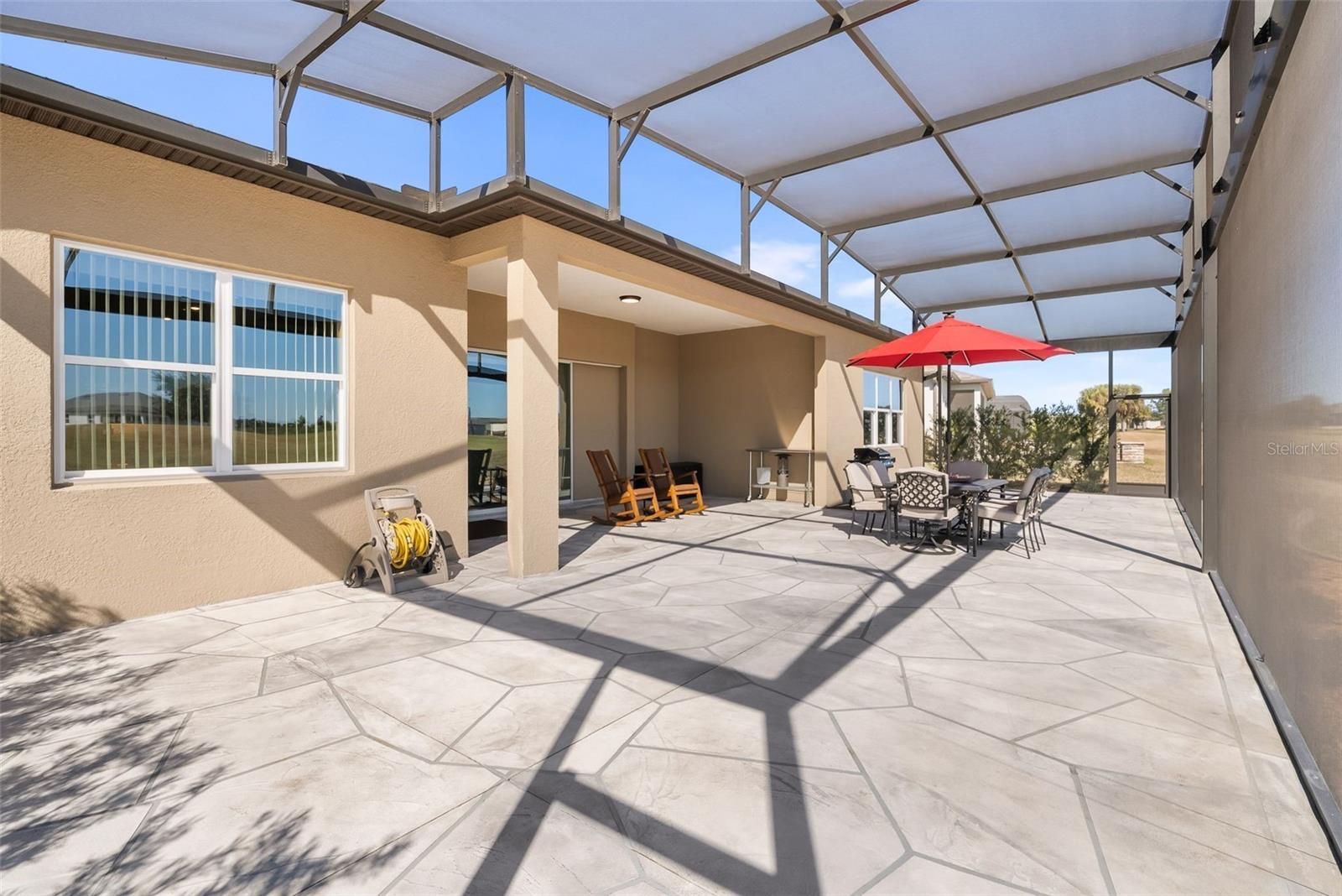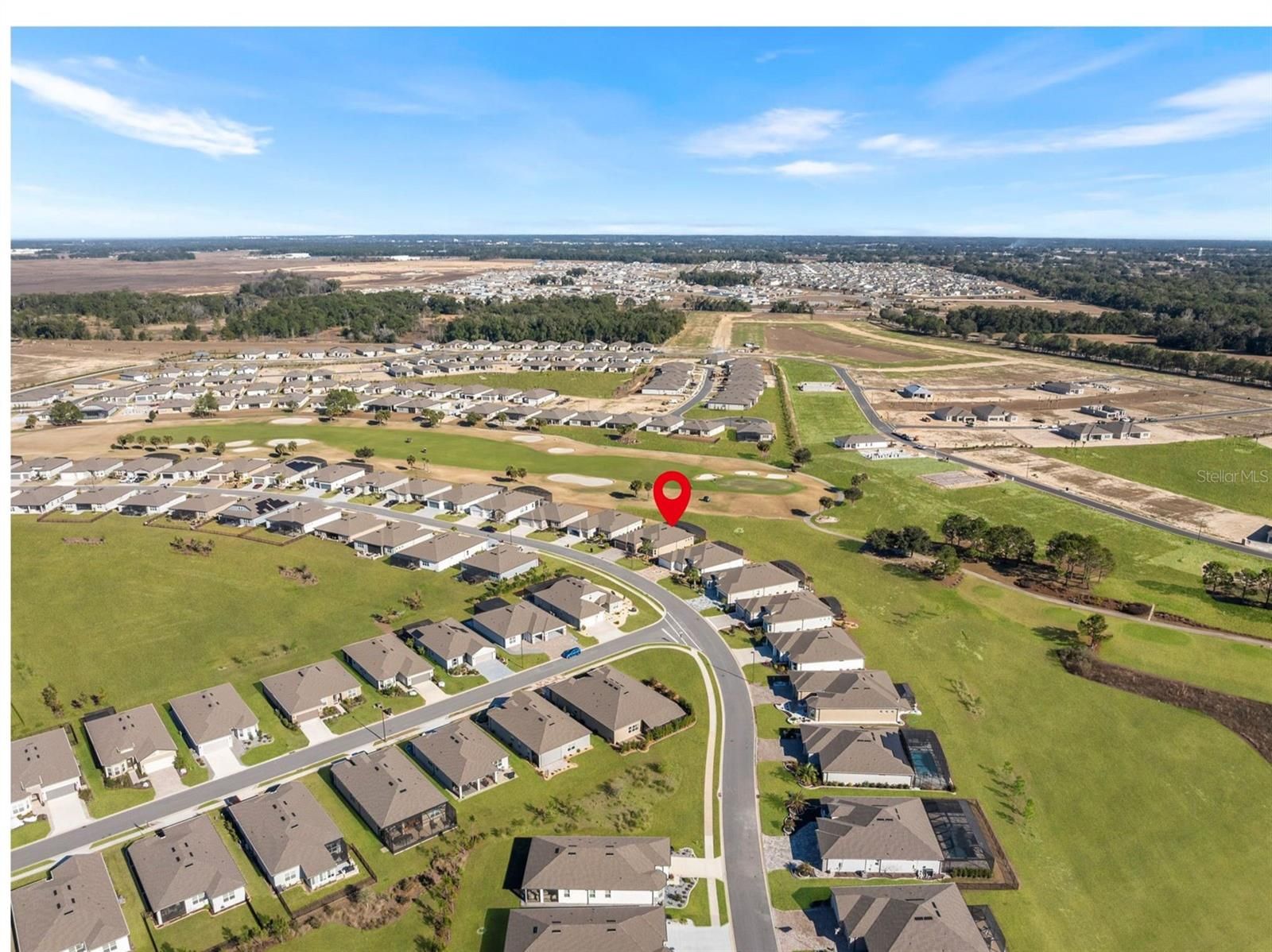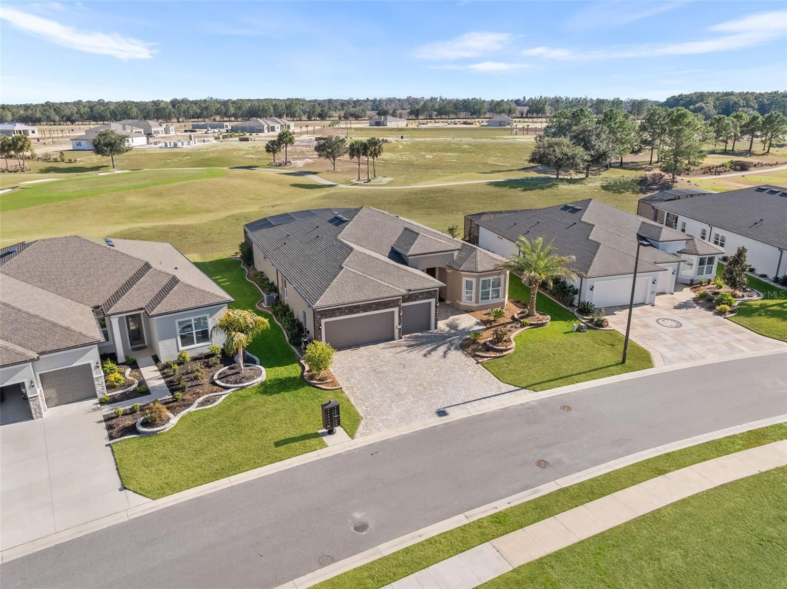 Live in one of Ocala’s premier 55+ communities, Del Webb Stone Creek, and own one of its most stunningly upgraded homes. This highly distinctive Stellar model, built in 2023, has been lightly lived in by part-time owners and feels nearly new. Perfectly positioned on a premium golf course lot, the home overlooks the 16th green, with the fairway to the left and the 17th tee to the right - beautiful views without concern for errant shots. Offering 2,512 sqft. of living space, this home features 3 bedrooms, 3 full bathrooms, and a dedicated flex room/office with French doors and a fully custom wall of built-in cabinetry and shelving. The Great Room impresses with a tray ceiling, remote-controlled fan/light, and an expansive sliding glass door that opens to a spectacular outdoor living space. The rear of the home has been enhanced with a large textured concrete patio and a custom screen enclosure spanning the full width of the home, complete with panoramic vision screens on the walls and protective sunscreen mesh across the roof. The kitchen is fully equipped with SS appliances, gorgeous granite countertops, elegant cabinetry, and hand-made imported Moroccan pendant lights. A spacious pantry features custom wooden shelving, replacing standard wire racks. Guests will enjoy a private front suite with a bay window, full bath, and a beautifully crafted custom queen-sized Murphy bed with storage. The Primary Suite offers golf course views, a tray ceiling, and remote-controlled fan/light, along with a spacious Primary Bath with dual vanities, glass frameless shower, and fully customized closet featuring a dramatic built-in three-panel dressing mirror. A lockable safe also conveys with the home. Curb appeal shines with a paver driveway, a widened and rebuilt paver entry walkway, stacked stone accents around the 3-car garage with epoxy floor, elevated stone landscape beds, mature palms, and custom exterior lighting. With its vibrant paint palette, extensive custom upgrades, and many furnishings available, this design-forward home makes a statement. Don’t miss the opportunity to own a truly special Stone Creek residence - one that you’ll be proud to call home.