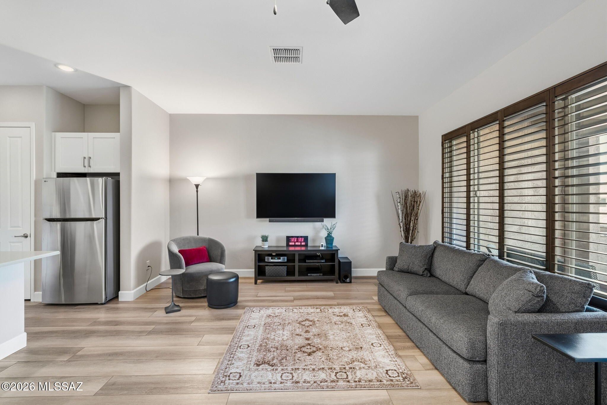 This north-south oriented Villa fills the home with natural light and helps keep it cool during the summer. Offering 2 bedrooms, 2 full baths plus 1,404 sq ft of luxury living space for your enjoyment. Recent updates include new kitchen cabinets and a remodeled master walk-in shower. The open concept interior features quartz countertops and vinyl plank (LVP) flooring throughout. It also has a surge protector and a water softener. A 65'' Sony TV and sound system are included. Security screen door. The brick-paved backyard patio has a turfed area, a snake gate, and offers a private desert view. The ''Lock and Leave'' concept is ideal for investors, seasonal residents, and frequent travelers. The Master HOA dues cover community amenities; the Villa assessment includes landscaping, painting,