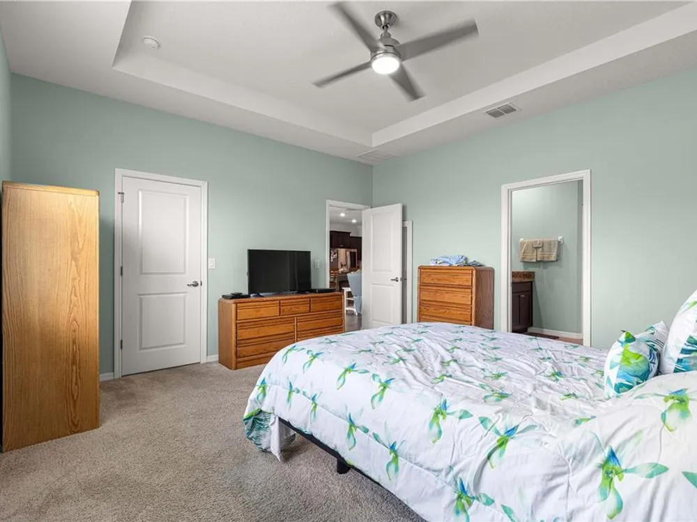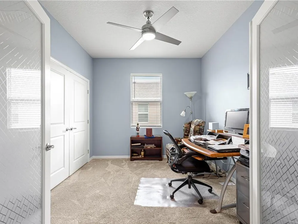 - Ceiling Fan(s), Eat-in Kitchen, High Ceilings, Kitchen/Family Room Combo, Open Floorplan, Smart Home, Solid Surface Counters, Split Bedrooms, Tray Ceiling(s), Walk-In Closet(s), Window Treatments