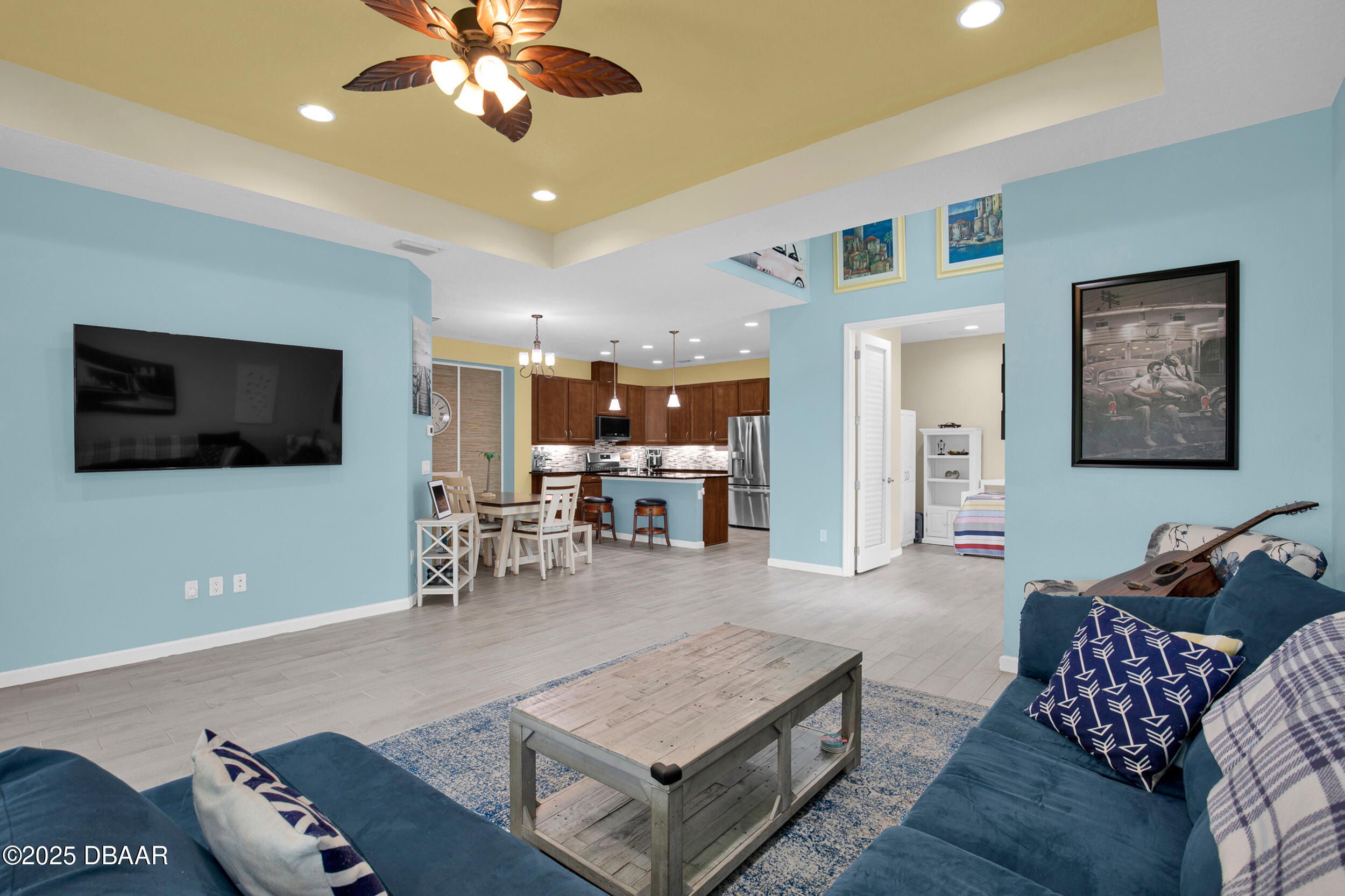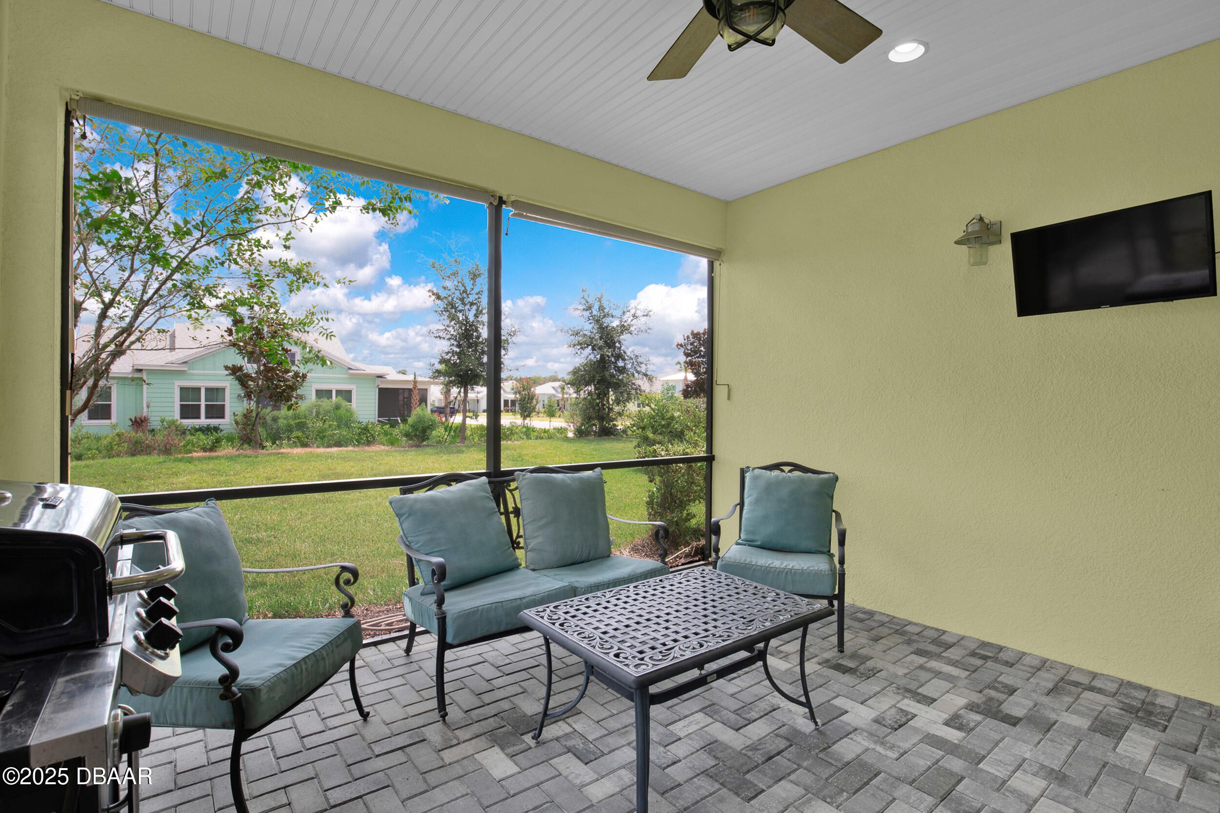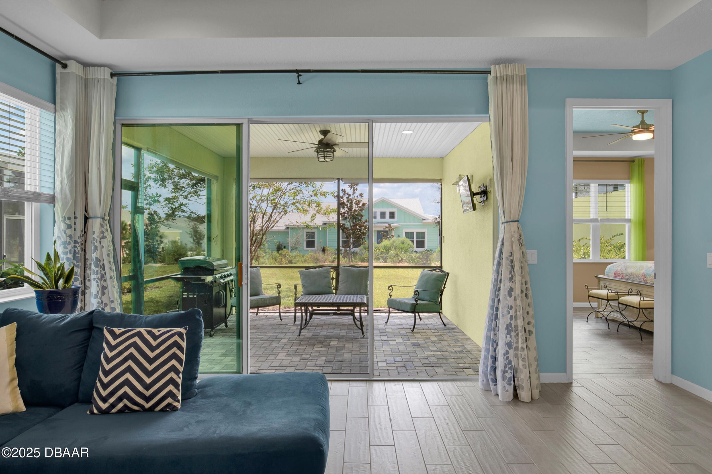 Live vibrantly in this upgraded Antigua Villa in Latitude Margaritaville—perfect for those seeking the ability to live their best life now. Enjoy light plank tile flooring, tropical designer paint, and French doors on the den for a flexible guest space or hobby room. The kitchen shines with stainless steel appliances, gas range, granite counters, glass tile backsplash, pendants over the island, and under-cabinet lighting. Tropical ceiling fans, 8' interior doors, recessed lighting in all rooms add comfort and style. Primary and Guest bathrooms have walk in shower. Guest area has pocket door for additional privacy. Relax on the screened lanai with privacy shades with friends & family. Just minutes from the beach and packed with amenities—fitness center, pools, pickleball, live music, and more—this home is your gateway to an active, carefree lifestyle. Furniture is available . Garage freezer and refrigerator convey.