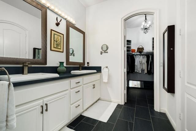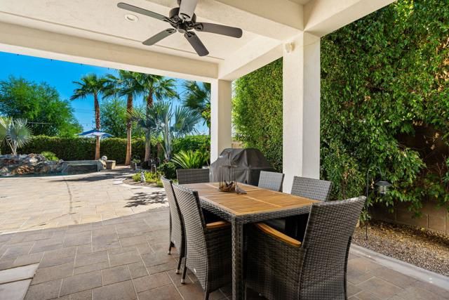 Exquisitely furnished Monarch plan with 10' ceilings situated on a spacious 12,623 sq. ft. lot within the resort-style 55+ community of Trilogy La Quinta. This single-level residence offers ample square footage of refined interior living space, featuring 3 bedrooms and 2 bathrooms. The home welcomes guests with an extended driveway, wrought-iron entry gate, and an elegant front courtyard enhanced with pavers to enjoy the 180-degree mountain sunset views, an expanded entry area, and ambient landscape lighting. The great room impresses with a granite-encased fireplace, designer chandeliers in the entry and dining areas, an entertainment niche, surround sound, crown molding, arched doorways, and custom window coverings. Additional upgrades include LED recessed lighting throughout and upgraded ceiling fans and light fixtures. The dining area flows seamlessly into the chef's kitchen, beautifully appointed with quartz countertops, a glass tile backsplash, breakfast bar, reverse osmosis drinking water system, upgraded KitchenAid stainless steel appliances, built-in double ovens, microwave, refrigerator, waterfall-edge prep island, 5-burner gas cooktop, pantry, and abundant cabinetry with brushed nickel hardware. The generous primary suite offers a bay window with plantation shutters, high-grade tile flooring, French door access to the backyard, newer countertops, sinks, faucets, and valves, dual vanities, a walk-in closet, and a large floor-to-ceiling tiled shower with glass enclosure. Guest accommodations are conveniently located near a full bath featuring quartz counters and a tile-enclosed tub/shower combination. The resort-style backyard is an entertainer's dream, showcasing a free-form Pebble-Tec pool, cascading spa, dramatic rock waterfall, paver decking, misting system, covered patio, fire pit, backyard up-lighting, and lush professional landscaping--all enhanced by a Pentair pool control system with Wi-Fi capability. Additional highlights include fresh interior and exterior paint, and a finished two-car garage featuring a 25,000 BTU mini-split A/C unit, insulated Wi-Fi-enabled garage door, upgraded motor and track system, premium roof-mounted storage, and an extended four-foot bay. This stunning property offers the epitome of luxury desert resort living--schedule your private showing today.