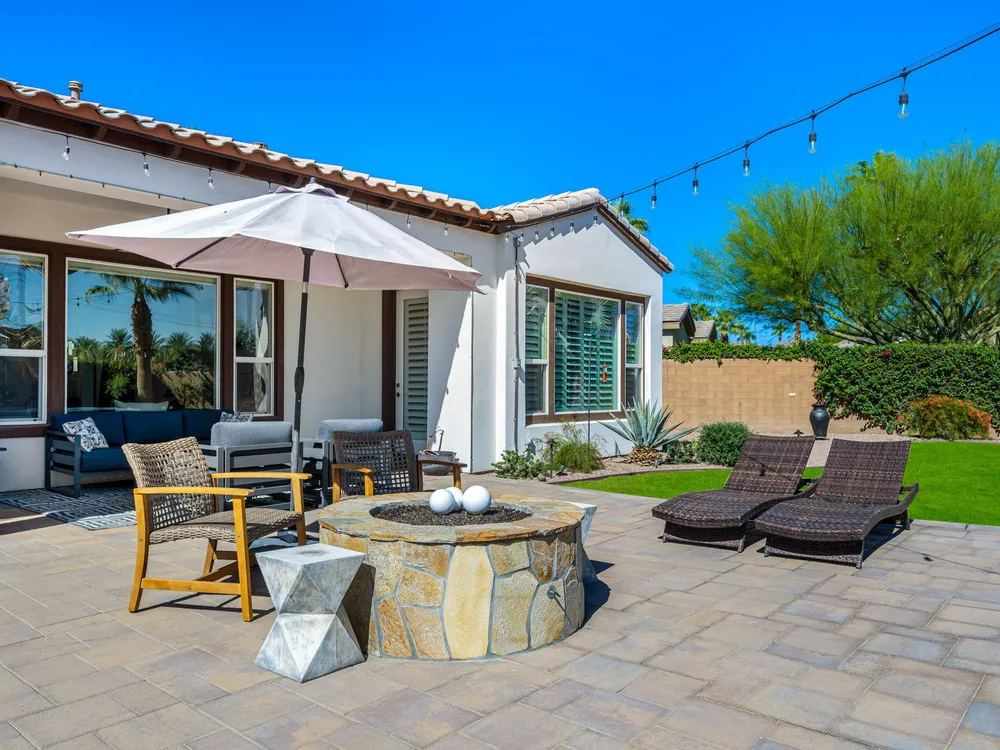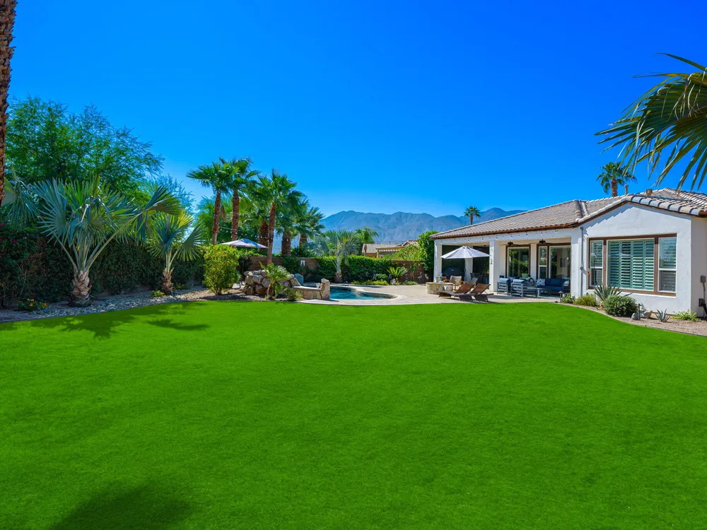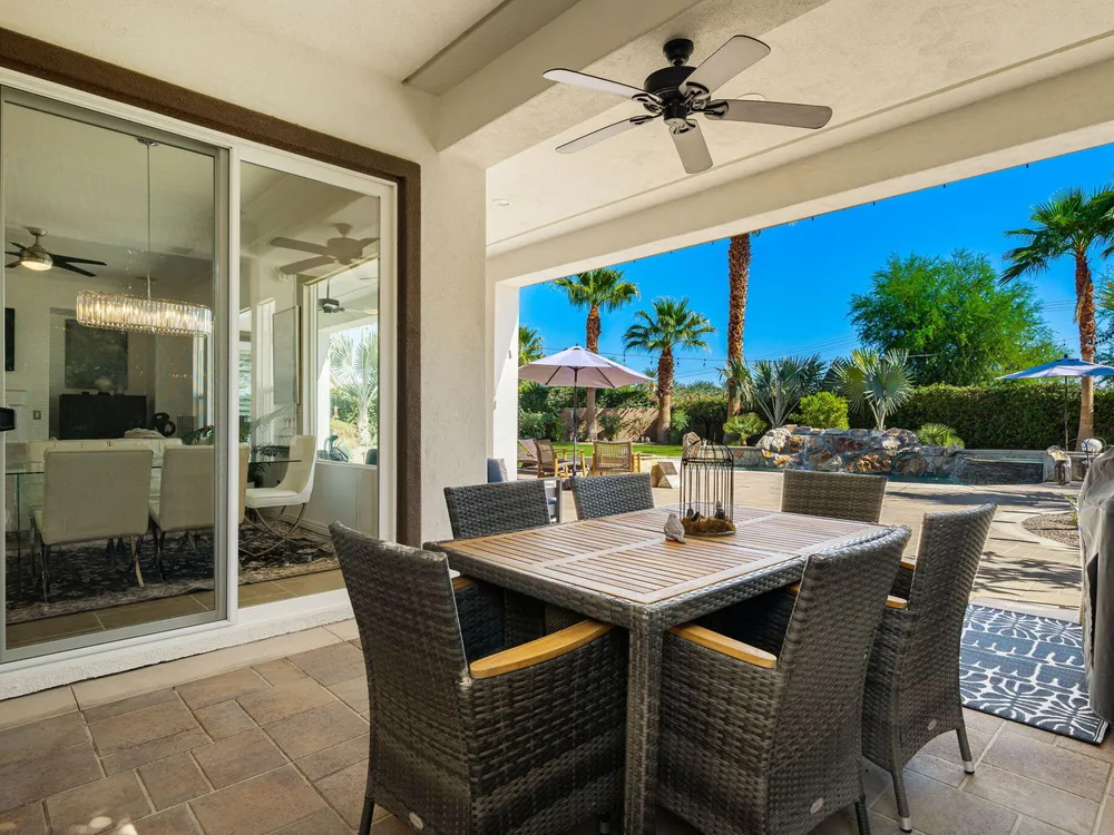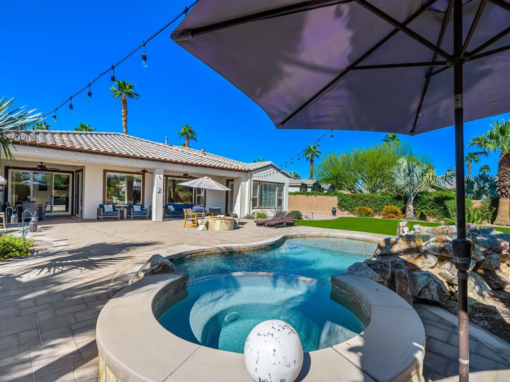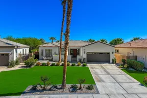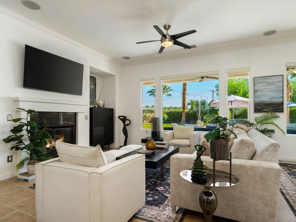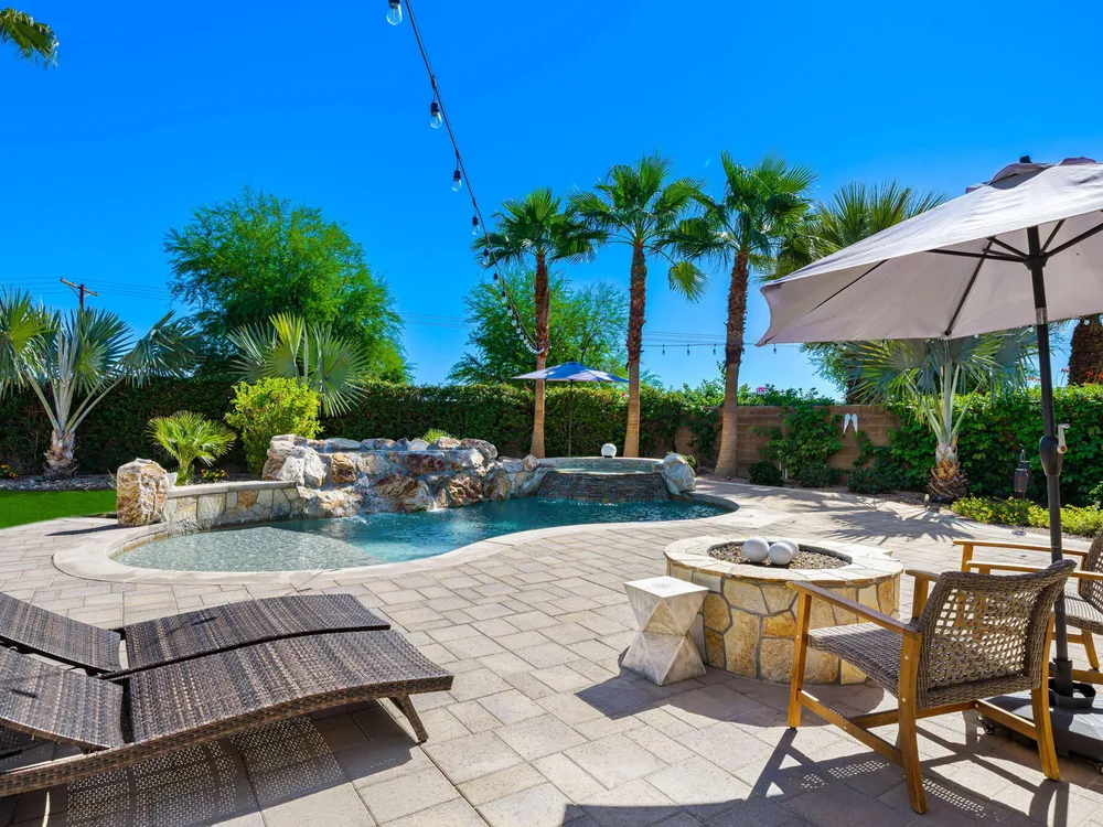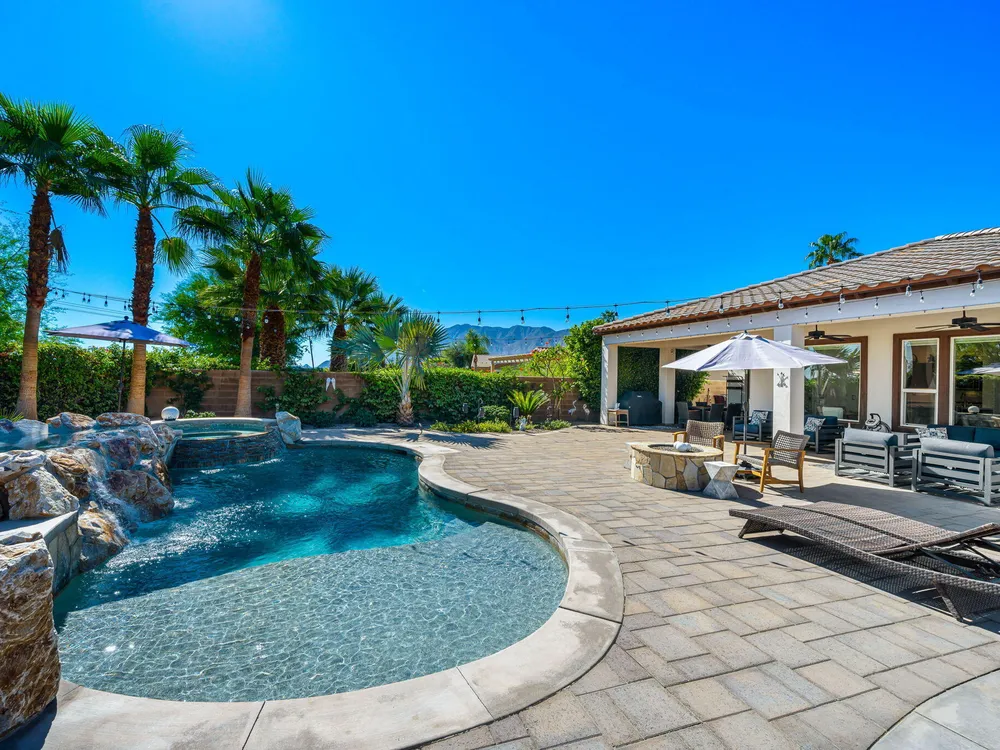 Exquisitely furnished Monarch plan with 10' ceilings situated on a spacious 12,623 sq. ft. lot within the resort-style 55+ community of Trilogy La Quinta. This single-level residence offers ample square footage of refined interior living space, featuring 3 bedrooms and 2 bathrooms. The home welcomes guests with an extended driveway, wrought-iron entry gate, and an elegant front courtyard enhanced with pavers to enjoy the 180-degree mountain sunset views, an expanded entry area, and ambient landscape lighting. The great room impresses with a granite-encased fireplace, designer chandeliers in the entry and dining areas, an entertainment niche, surround sound, crown molding, arched doorways, and custom window coverings. Additional upgrades include LED recessed lighting throughout and upgraded ceiling fans and light fixtures. The dining area flows seamlessly into the chef's kitchen, beautifully appointed with quartz countertops, a glass tile backsplash, breakfast bar, reverse osmosis drinking water system, upgraded KitchenAid stainless steel appliances, built-in double ovens, microwave, refrigerator, waterfall-edge prep island, 5-burner gas cooktop, pantry, and abundant cabinetry with brushed nickel hardware. The generous primary suite offers a bay window with plantation shutters, high-grade tile flooring, French door access to the backyard, newer countertops, sinks, faucets, and valves, dual vanities, a walk-in closet, and a large floor-to-ceiling tiled shower with glass enclosure. Guest accommodations are conveniently located near a full bath featuring quartz counters and a tile-enclosed tub/shower combination. The resort-style backyard is an entertainer's dream, showcasing a free-form Pebble-Tec pool, cascading spa, dramatic rock waterfall, paver decking, misting system, covered patio, fire pit, backyard up-lighting, and lush professional landscaping—all enhanced by a Pentair pool control system with Wi-Fi capability. Additional highlights include fresh interior and exterior paint, and a finished two-car garage featuring a 25,000 BTU mini-split A/C unit, insulated Wi-Fi-enabled garage door, upgraded motor and track system, premium roof-mounted storage, and an extended four-foot bay. This stunning property offers the epitome of luxury desert resort living—schedule your private showing today.