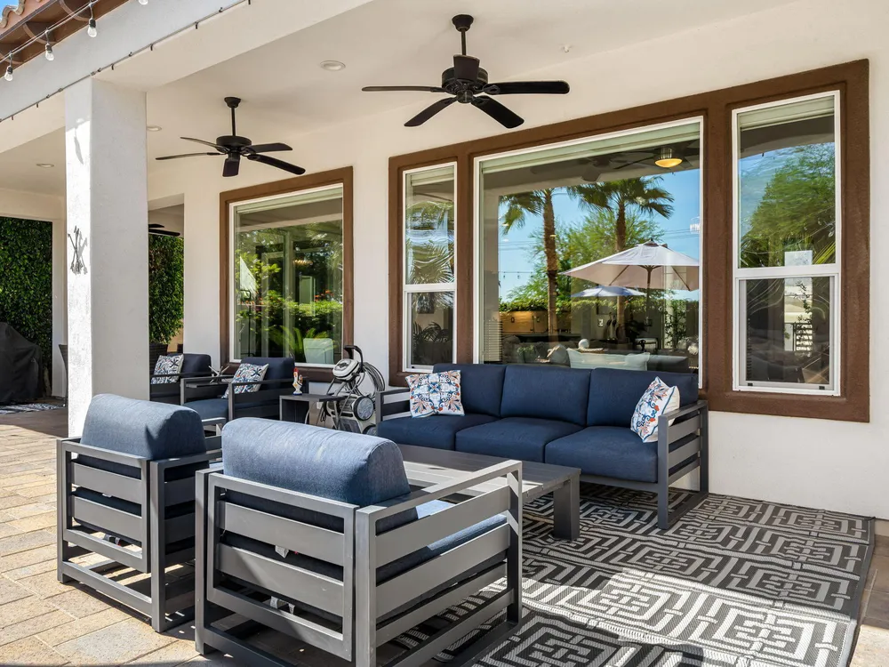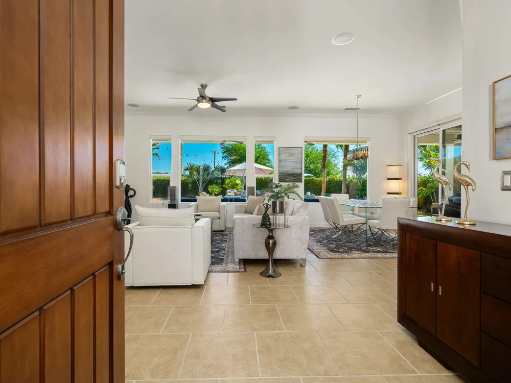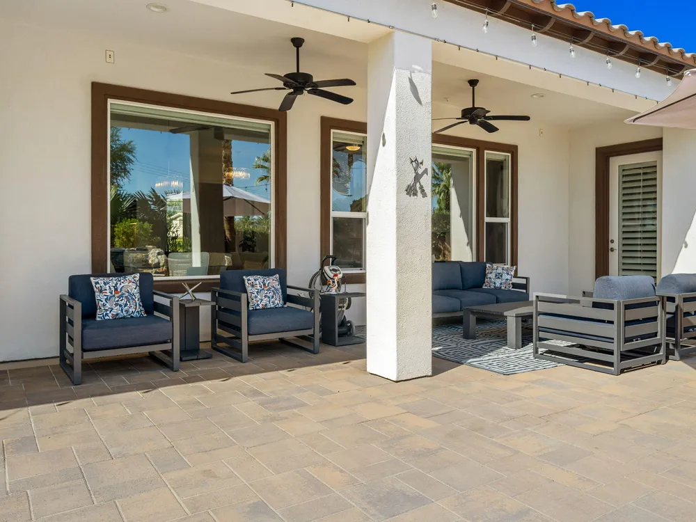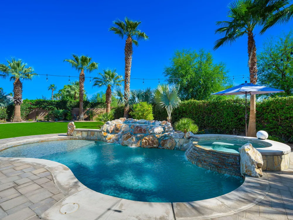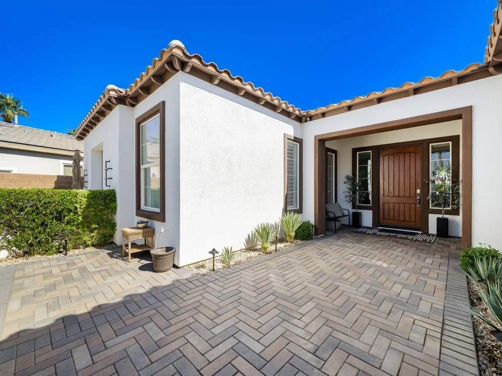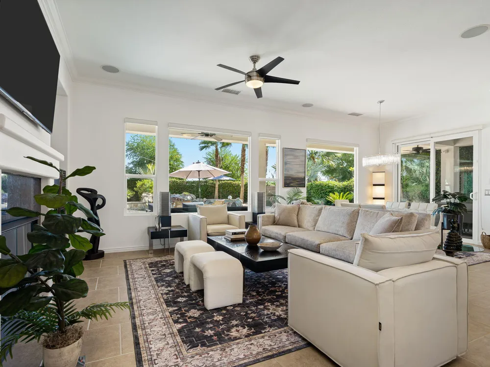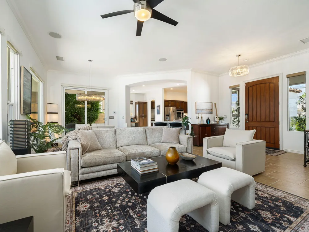 Exquisitely furnished Monarch plan with 10' ceilings situated on a spacious 12,623 sq. ft. lot within the resort-style 55+ community of Trilogy La Quinta. This single-level residence offers ample square footage of refined interior living space, featuring 3 bedrooms and 2 bathrooms. The home welcomes guests with an extended driveway, wrought-iron entry gate, and an elegant front courtyard enhanced with pavers to enjoy the 180-degree mountain sunset views, an expanded entry area, and ambient landscape lighting. The great room impresses with a granite-encased fireplace, designer chandeliers in the entry and dining areas, an entertainment niche, surround sound, crown molding, arched doorways, and custom window coverings. Additional upgrades include LED recessed lighting throughout and upgraded ceiling fans and light fixtures. The dining area flows seamlessly into the chef's kitchen, beautifully appointed with quartz countertops, a glass tile backsplash, breakfast bar, reverse osmosis drinking water system, upgraded KitchenAid stainless steel appliances, built-in double ovens, microwave, refrigerator, waterfall-edge prep island, 5-burner gas cooktop, pantry, and abundant cabinetry with brushed nickel hardware. The generous primary suite offers a bay window with plantation shutters, high-grade tile flooring, French door access to the backyard, newer countertops, sinks, faucets, and valves, dual vanities, a walk-in closet, and a large floor-to-ceiling tiled shower with glass enclosure. Guest accommodations are conveniently located near a full bath featuring quartz counters and a tile-enclosed tub/shower combination. The resort-style backyard is an entertainer's dream, showcasing a free-form Pebble-Tec pool, cascading spa, dramatic rock waterfall, paver decking, misting system, covered patio, fire pit, backyard up-lighting, and lush professional landscaping—all enhanced by a Pentair pool control system with Wi-Fi capability. Additional highlights include fresh interior and exterior paint, and a finished two-car garage featuring a 25,000 BTU mini-split A/C unit, insulated Wi-Fi-enabled garage door, upgraded motor and track system, premium roof-mounted storage, and an extended four-foot bay. This stunning property offers the epitome of luxury desert resort living—schedule your private showing today.