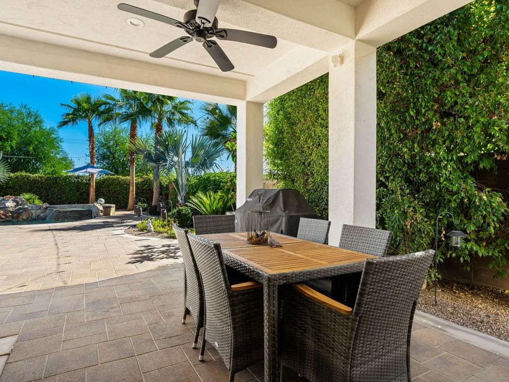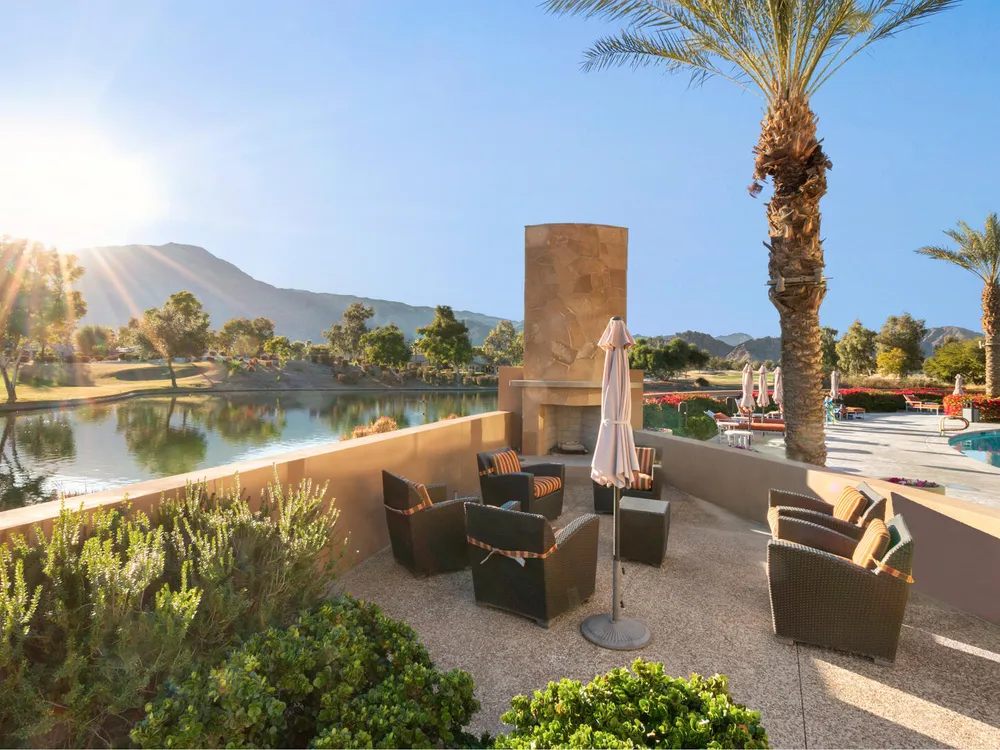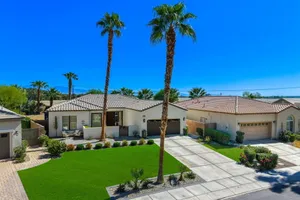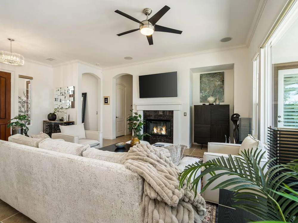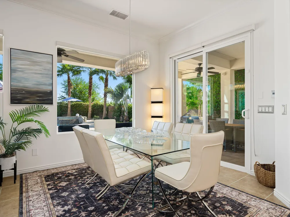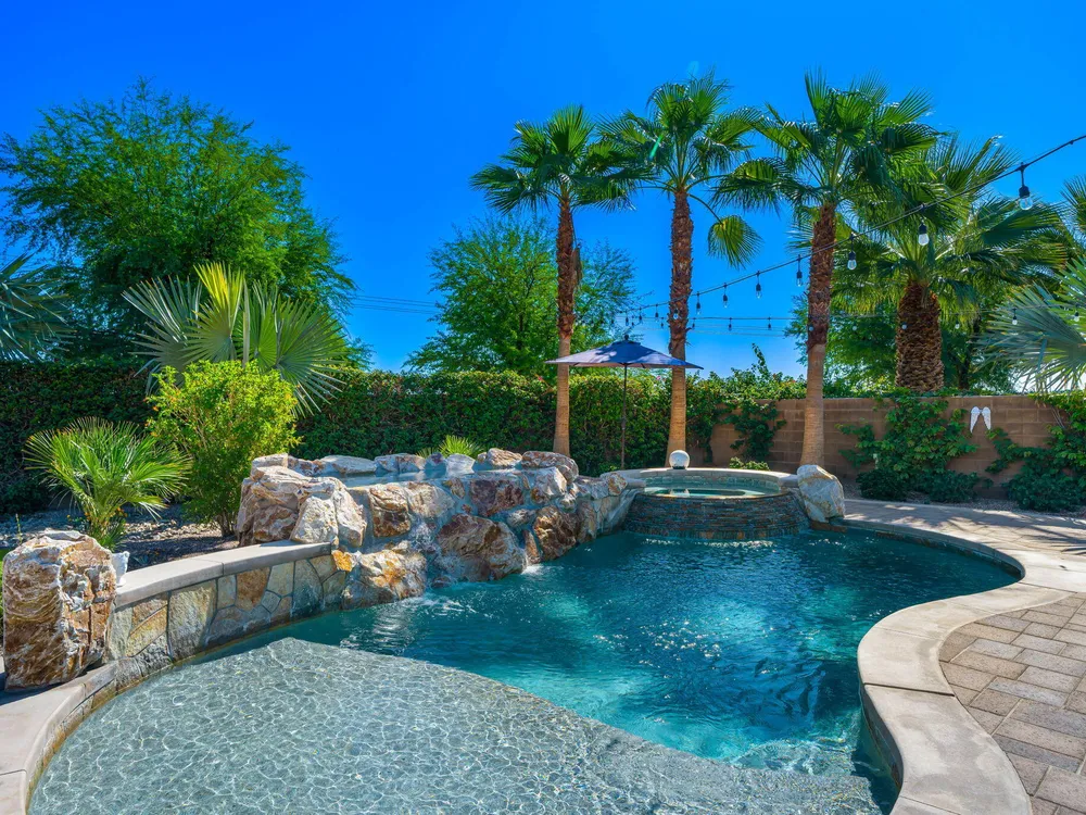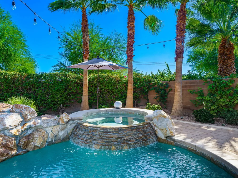 Exquisitely furnished Monarch plan with 10' ceilings situated on a spacious 12,623 sq. ft. lot within the resort-style 55+ community of Trilogy La Quinta. This single-level residence offers ample square footage of refined interior living space, featuring 3 bedrooms and 2 bathrooms. The home welcomes guests with an extended driveway, wrought-iron entry gate, and an elegant front courtyard enhanced with pavers to enjoy the 180-degree mountain sunset views, an expanded entry area, and ambient landscape lighting. The great room impresses with a granite-encased fireplace, designer chandeliers in the entry and dining areas, an entertainment niche, surround sound, crown molding, arched doorways, and custom window coverings. Additional upgrades include LED recessed lighting throughout and upgraded ceiling fans and light fixtures. The dining area flows seamlessly into the chef's kitchen, beautifully appointed with quartz countertops, a glass tile backsplash, breakfast bar, reverse osmosis drinking water system, upgraded KitchenAid stainless steel appliances, built-in double ovens, microwave, refrigerator, waterfall-edge prep island, 5-burner gas cooktop, pantry, and abundant cabinetry with brushed nickel hardware. The generous primary suite offers a bay window with plantation shutters, high-grade tile flooring, French door access to the backyard, newer countertops, sinks, faucets, and valves, dual vanities, a walk-in closet, and a large floor-to-ceiling tiled shower with glass enclosure. Guest accommodations are conveniently located near a full bath featuring quartz counters and a tile-enclosed tub/shower combination. The resort-style backyard is an entertainer's dream, showcasing a free-form Pebble-Tec pool, cascading spa, dramatic rock waterfall, paver decking, misting system, covered patio, fire pit, backyard up-lighting, and lush professional landscaping—all enhanced by a Pentair pool control system with Wi-Fi capability. Additional highlights include fresh interior and exterior paint, and a finished two-car garage featuring a 25,000 BTU mini-split A/C unit, insulated Wi-Fi-enabled garage door, upgraded motor and track system, premium roof-mounted storage, and an extended four-foot bay. This stunning property offers the epitome of luxury desert resort living—schedule your private showing today.