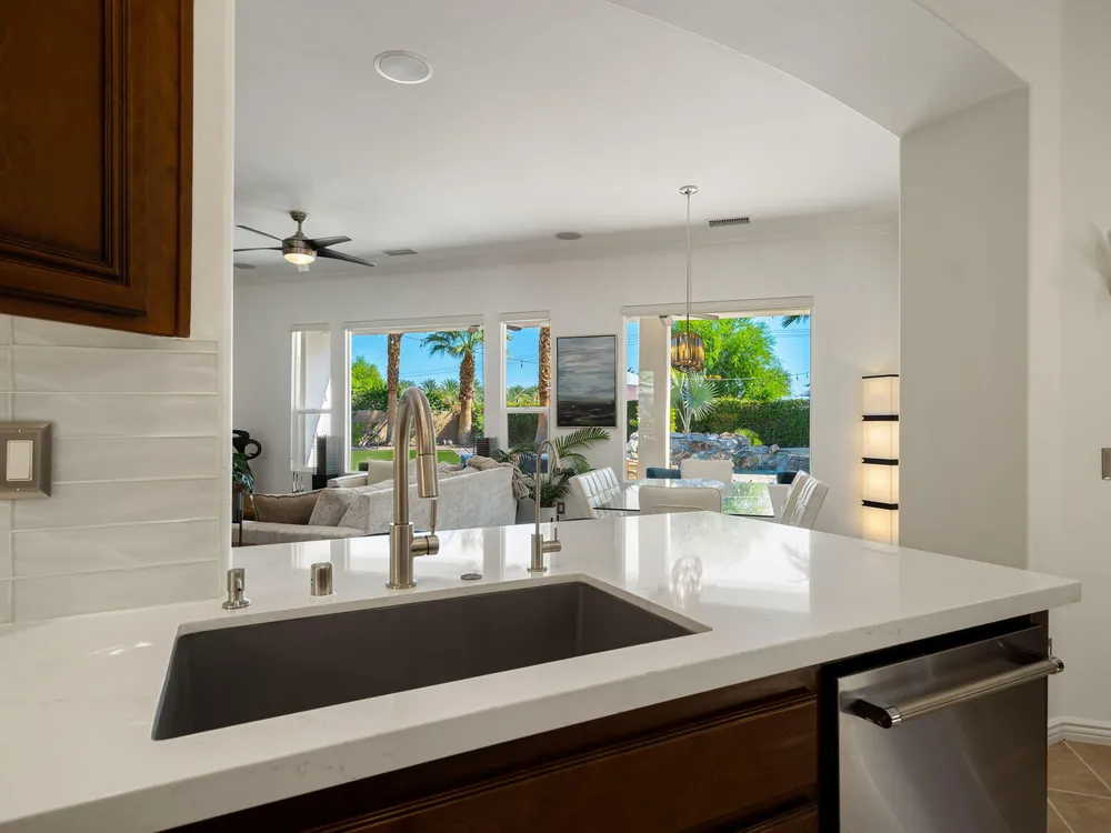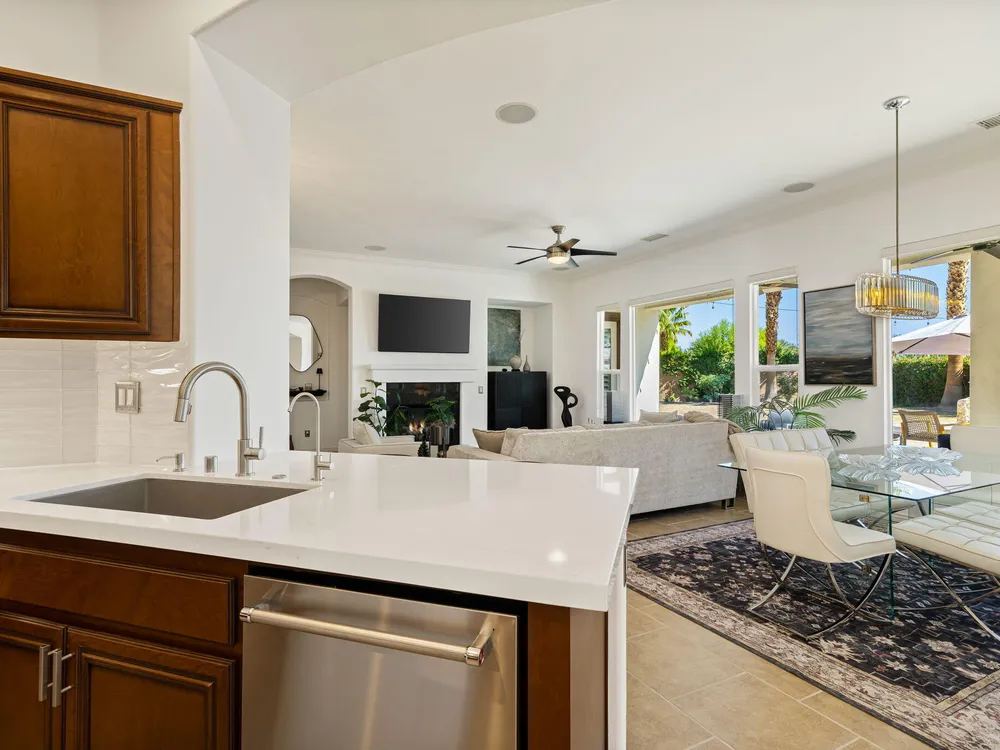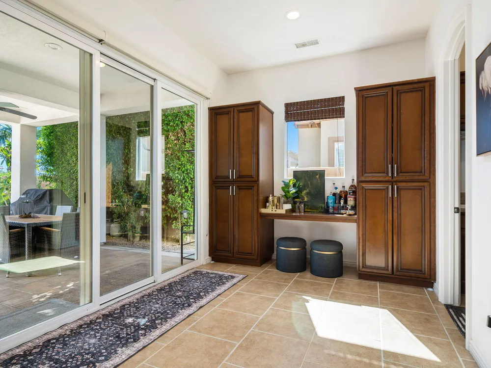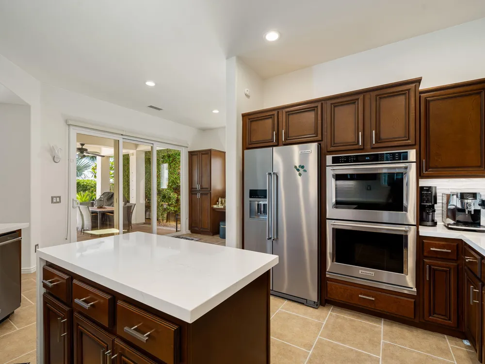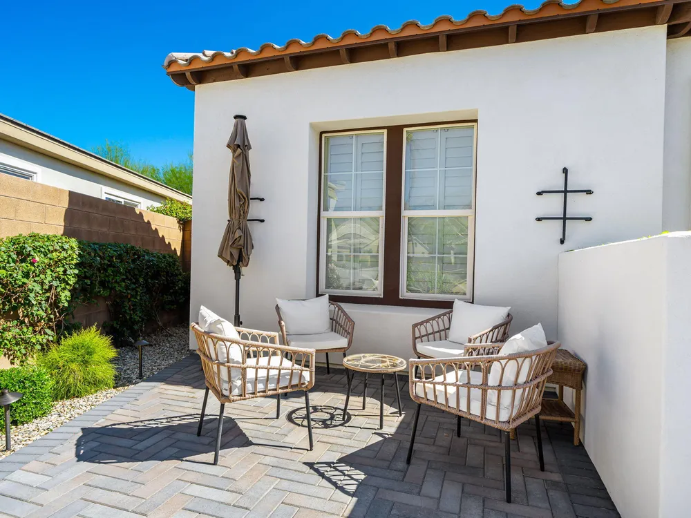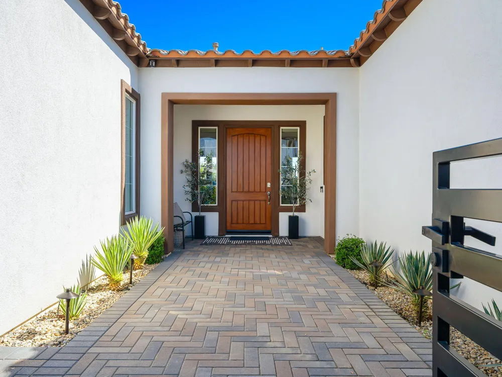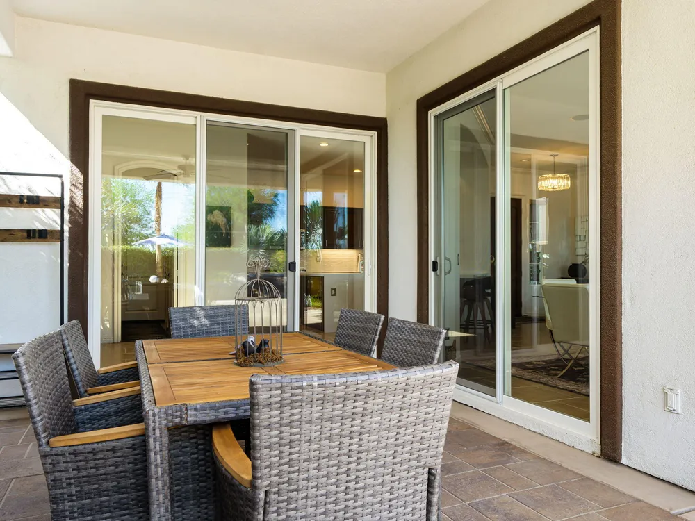 Exquisitely furnished Monarch plan with 10' ceilings situated on a spacious 12,623 sq. ft. lot within the resort-style 55+ community of Trilogy La Quinta. This single-level residence offers ample square footage of refined interior living space, featuring 3 bedrooms and 2 bathrooms. The home welcomes guests with an extended driveway, wrought-iron entry gate, and an elegant front courtyard enhanced with pavers to enjoy the 180-degree mountain sunset views, an expanded entry area, and ambient landscape lighting. The great room impresses with a granite-encased fireplace, designer chandeliers in the entry and dining areas, an entertainment niche, surround sound, crown molding, arched doorways, and custom window coverings. Additional upgrades include LED recessed lighting throughout and upgraded ceiling fans and light fixtures. The dining area flows seamlessly into the chef's kitchen, beautifully appointed with quartz countertops, a glass tile backsplash, breakfast bar, reverse osmosis drinking water system, upgraded KitchenAid stainless steel appliances, built-in double ovens, microwave, refrigerator, waterfall-edge prep island, 5-burner gas cooktop, pantry, and abundant cabinetry with brushed nickel hardware. The generous primary suite offers a bay window with plantation shutters, high-grade tile flooring, French door access to the backyard, newer countertops, sinks, faucets, and valves, dual vanities, a walk-in closet, and a large floor-to-ceiling tiled shower with glass enclosure. Guest accommodations are conveniently located near a full bath featuring quartz counters and a tile-enclosed tub/shower combination. The resort-style backyard is an entertainer's dream, showcasing a free-form Pebble-Tec pool, cascading spa, dramatic rock waterfall, paver decking, misting system, covered patio, fire pit, backyard up-lighting, and lush professional landscaping—all enhanced by a Pentair pool control system with Wi-Fi capability. Additional highlights include fresh interior and exterior paint, and a finished two-car garage featuring a 25,000 BTU mini-split A/C unit, insulated Wi-Fi-enabled garage door, upgraded motor and track system, premium roof-mounted storage, and an extended four-foot bay. This stunning property offers the epitome of luxury desert resort living—schedule your private showing today.