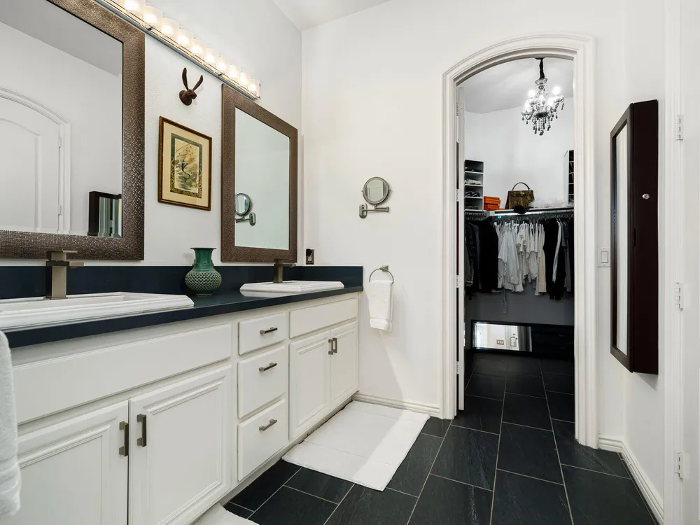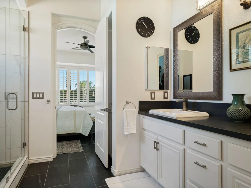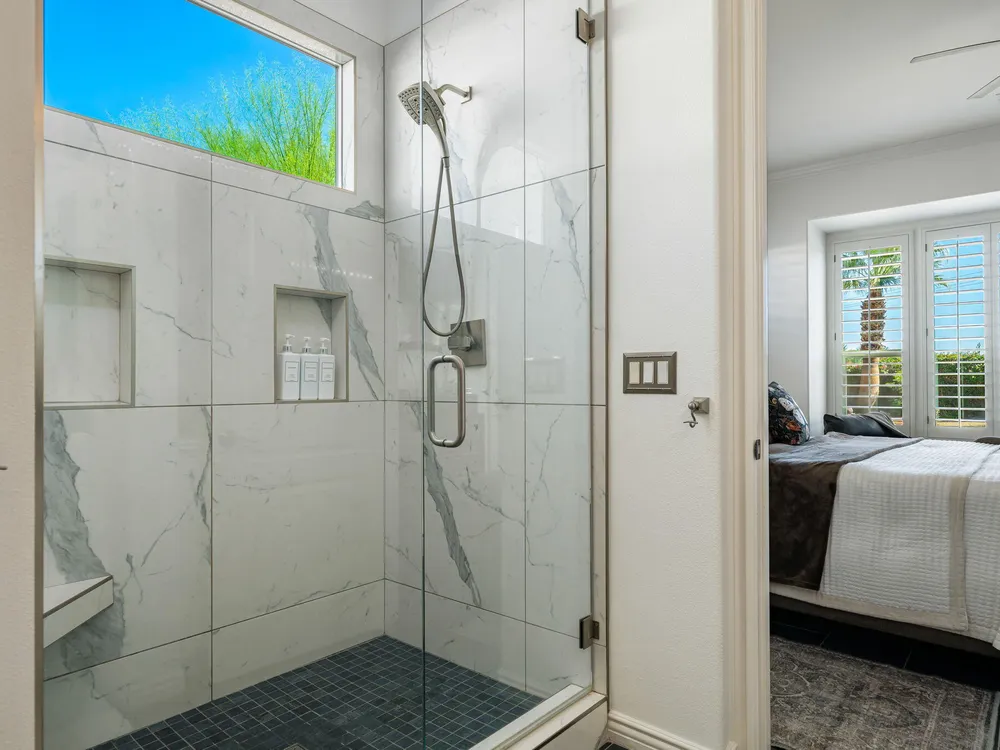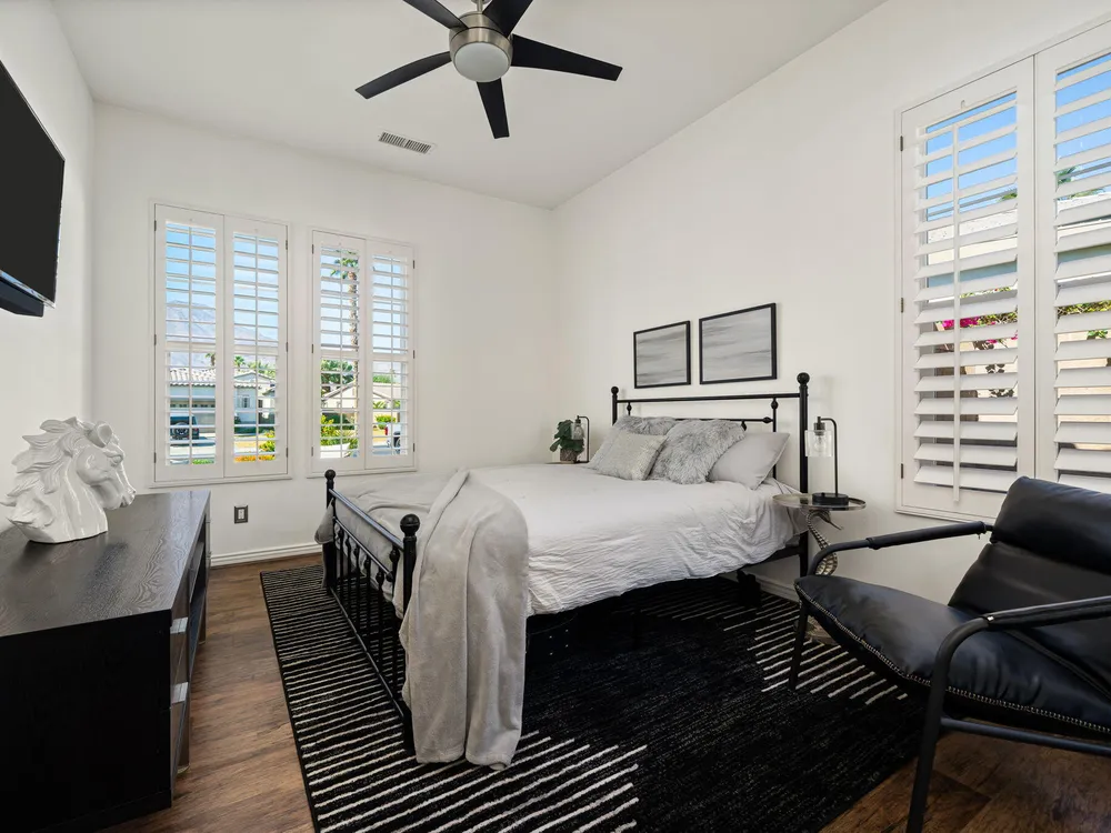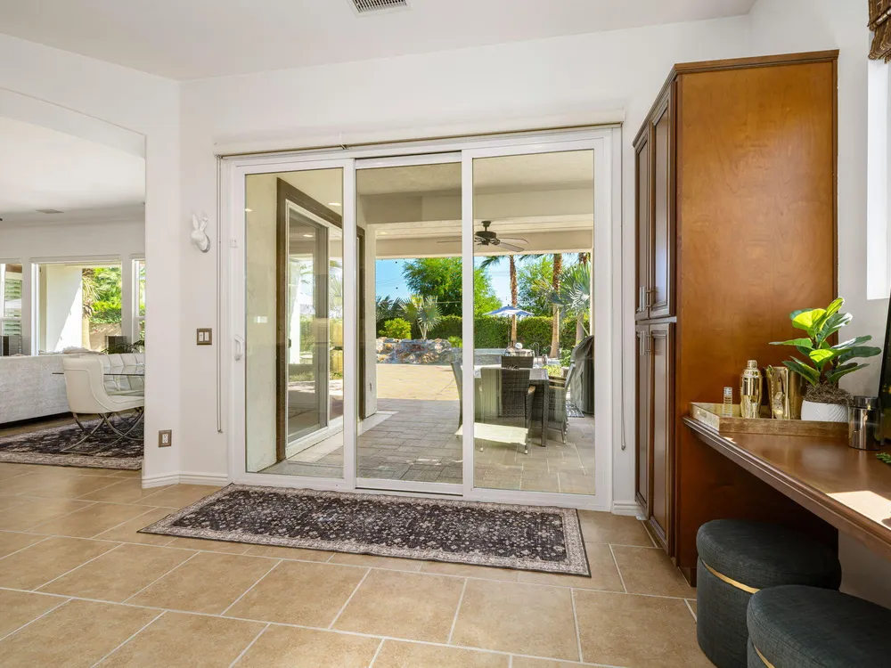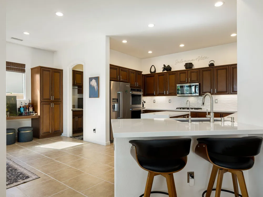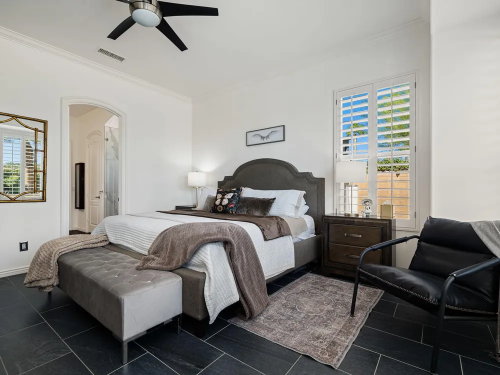 Exquisitely furnished Monarch plan with 10' ceilings situated on a spacious 12,623 sq. ft. lot within the resort-style 55+ community of Trilogy La Quinta. This single-level residence offers ample square footage of refined interior living space, featuring 3 bedrooms and 2 bathrooms. The home welcomes guests with an extended driveway, wrought-iron entry gate, and an elegant front courtyard enhanced with pavers to enjoy the 180-degree mountain sunset views, an expanded entry area, and ambient landscape lighting. The great room impresses with a granite-encased fireplace, designer chandeliers in the entry and dining areas, an entertainment niche, surround sound, crown molding, arched doorways, and custom window coverings. Additional upgrades include LED recessed lighting throughout and upgraded ceiling fans and light fixtures. The dining area flows seamlessly into the chef's kitchen, beautifully appointed with quartz countertops, a glass tile backsplash, breakfast bar, reverse osmosis drinking water system, upgraded KitchenAid stainless steel appliances, built-in double ovens, microwave, refrigerator, waterfall-edge prep island, 5-burner gas cooktop, pantry, and abundant cabinetry with brushed nickel hardware. The generous primary suite offers a bay window with plantation shutters, high-grade tile flooring, French door access to the backyard, newer countertops, sinks, faucets, and valves, dual vanities, a walk-in closet, and a large floor-to-ceiling tiled shower with glass enclosure. Guest accommodations are conveniently located near a full bath featuring quartz counters and a tile-enclosed tub/shower combination. The resort-style backyard is an entertainer's dream, showcasing a free-form Pebble-Tec pool, cascading spa, dramatic rock waterfall, paver decking, misting system, covered patio, fire pit, backyard up-lighting, and lush professional landscaping—all enhanced by a Pentair pool control system with Wi-Fi capability. Additional highlights include fresh interior and exterior paint, and a finished two-car garage featuring a 25,000 BTU mini-split A/C unit, insulated Wi-Fi-enabled garage door, upgraded motor and track system, premium roof-mounted storage, and an extended four-foot bay. This stunning property offers the epitome of luxury desert resort living—schedule your private showing today.