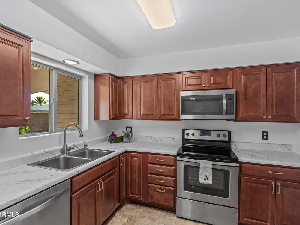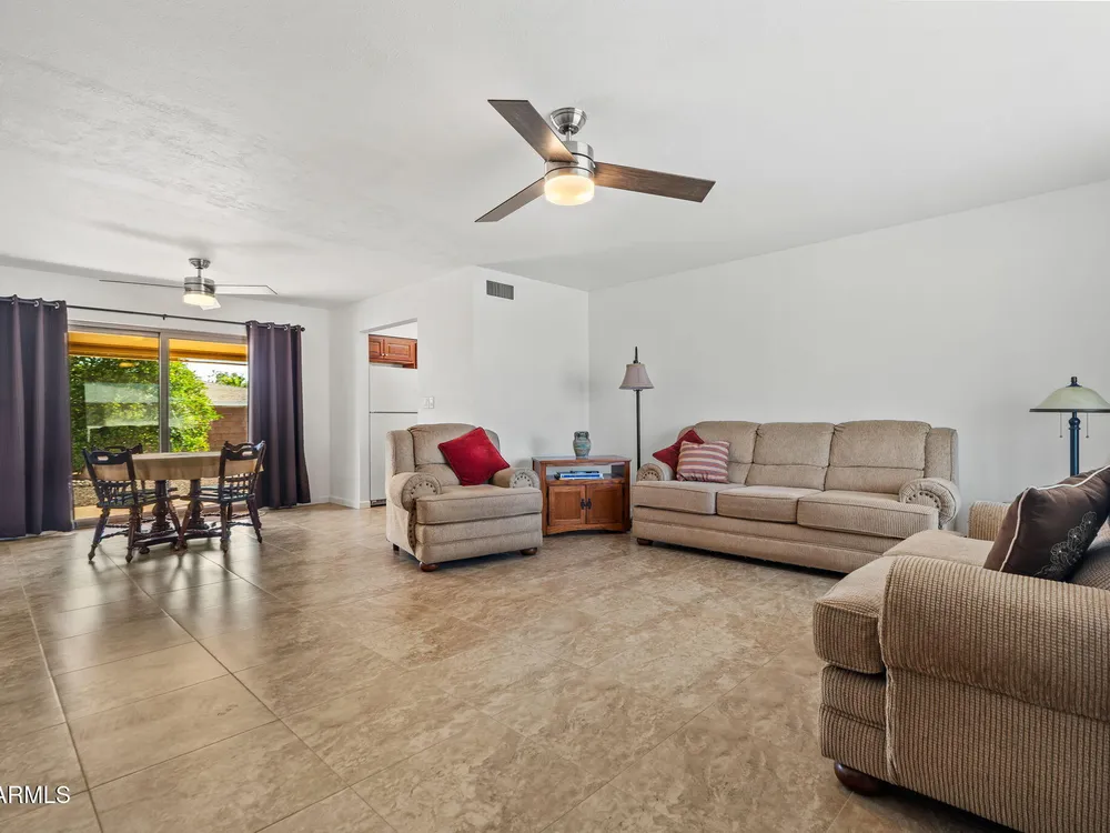 Welcome to this beautifully updated home in the highly desirable 55+ community of Dreamland Villa in Mesa! Enjoy peace of mind with recent upgrades including dual-pane windows/slider, newer roof and HVAC and stylish tile flooring throughout. The remodeled kitchen and bathrooms offer modern finishes and functionality. You'll love the oversized laundry room with sink and built-in storage—perfect for added convenience. The low-maintenance yard allows for easy living, and the location provides quick access to US 60 and Loop 202, with shopping, dining, and medical services just minutes away. Optional community membership gives you access to an abundance of amenities including pools, spa, fitness center, clubs, and more! Bonus! allowed parking of RVs and home is connected to sewer system.