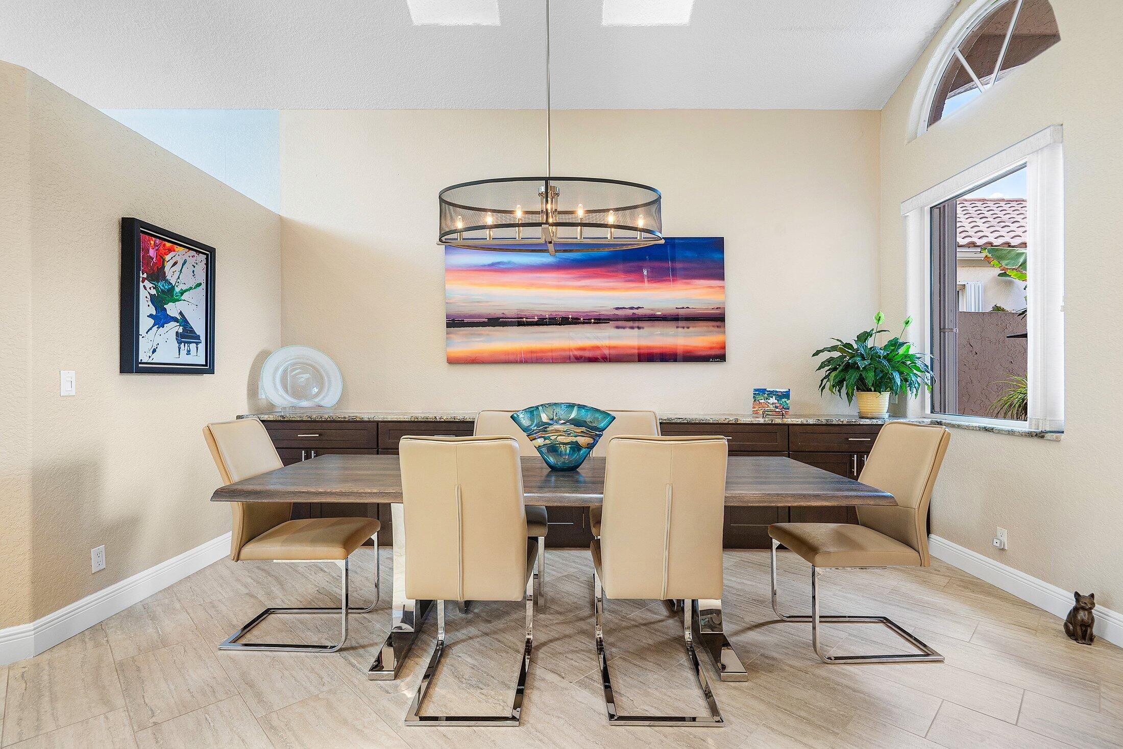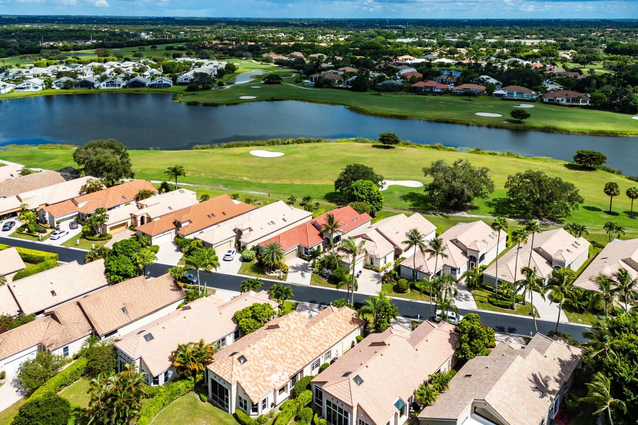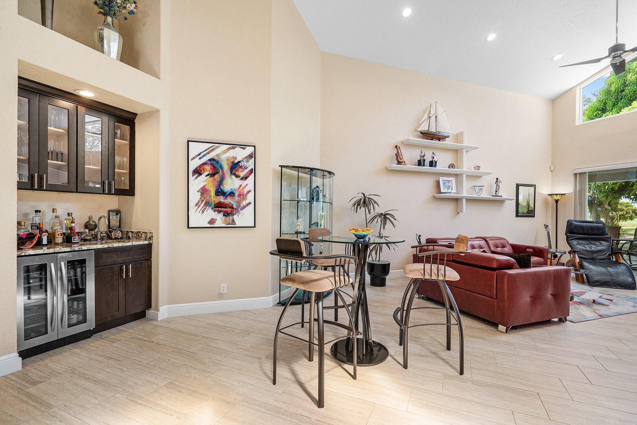 Enjoy stunning golf course & lake views from this 3BR, 21/2BA home in a prestigious gated community. High-volume ceilings & walls of windows fill the open floor plan with natural light. The dining room features a custom built-in, while the great room boasts a custom wet bar with wine & beverage fridges--perfect for entertaining. The private primary suite offers serene views & a spa-like bath with a custom dual quartz vanity, seamless glass shower with river rock tile, & a separate soaking tub. Additional bedrooms are generously sized, & the outdoor patio is ideal for alfresco dining or relaxing at sunset. Upgrades include impact windows & LED lighting. Luxury Golf Course Living in a Gated Community- Optional Membership Available!