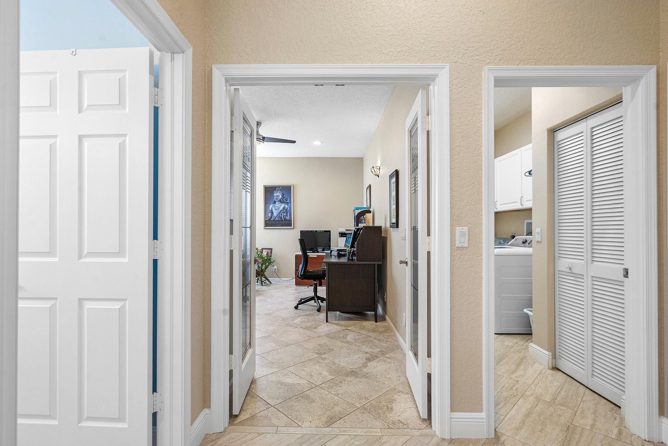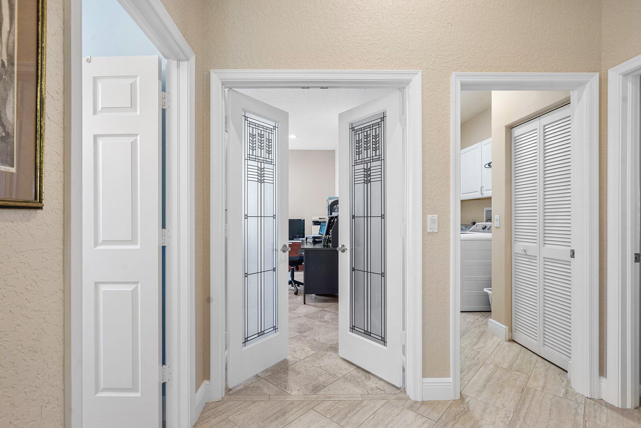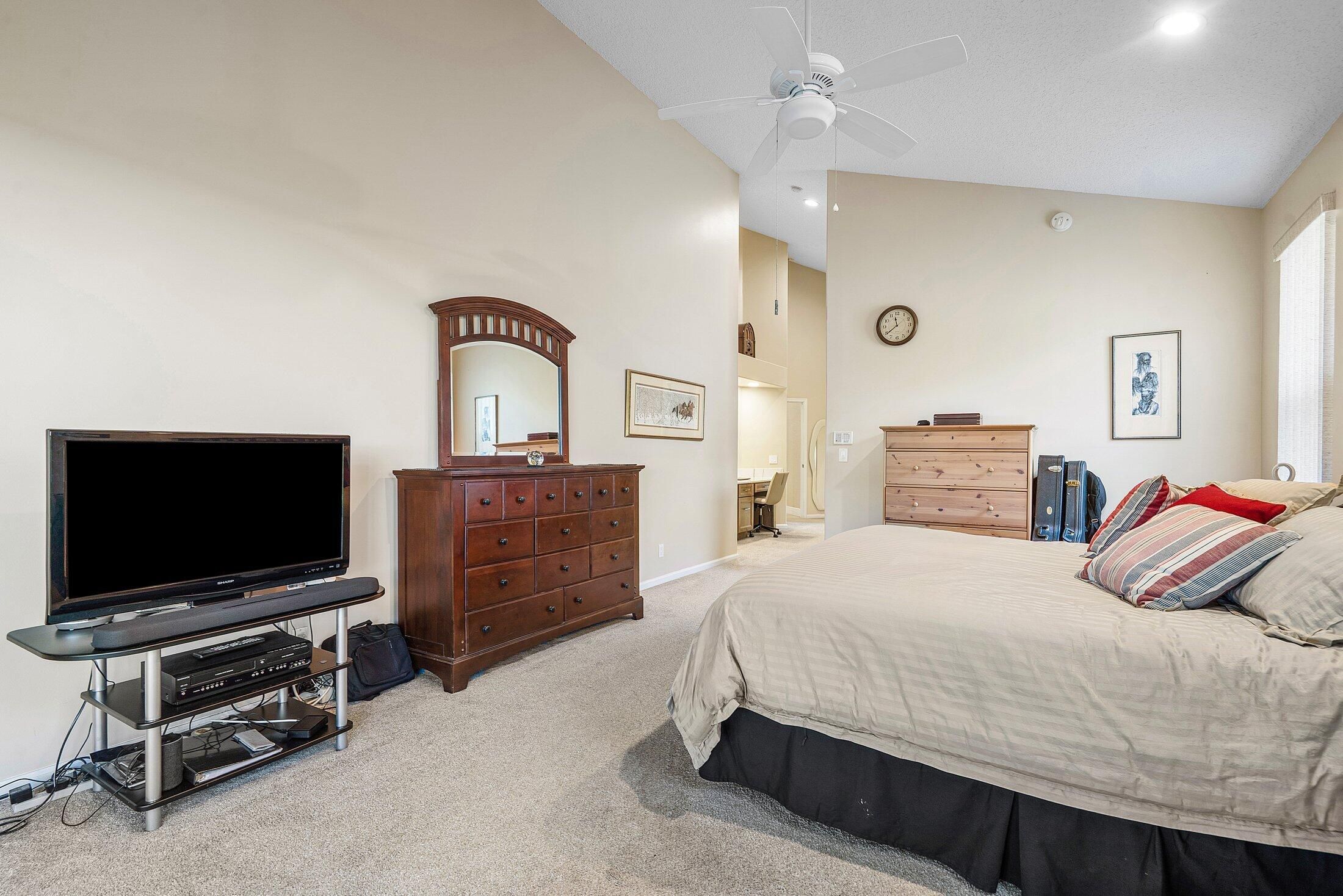 Enjoy stunning golf course & lake views from this 3BR, 21/2BA home in a prestigious gated community. High-volume ceilings & walls of windows fill the open floor plan with natural light. The dining room features a custom built-in, while the great room boasts a custom wet bar with wine & beverage fridges--perfect for entertaining. The private primary suite offers serene views & a spa-like bath with a custom dual quartz vanity, seamless glass shower with river rock tile, & a separate soaking tub. Additional bedrooms are generously sized, & the outdoor patio is ideal for alfresco dining or relaxing at sunset. Upgrades include impact windows & LED lighting. Luxury Golf Course Living in a Gated Community- Optional Membership Available!