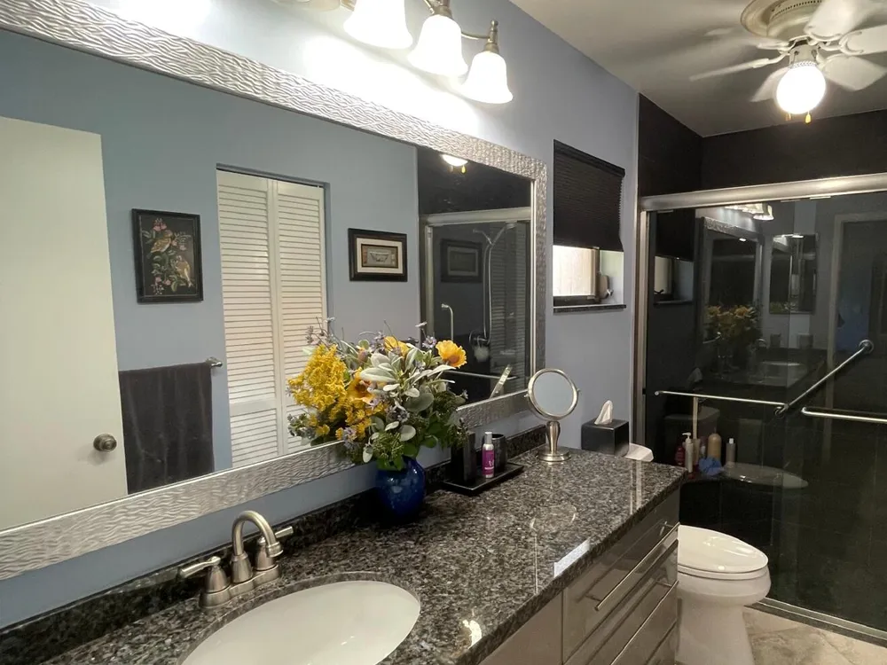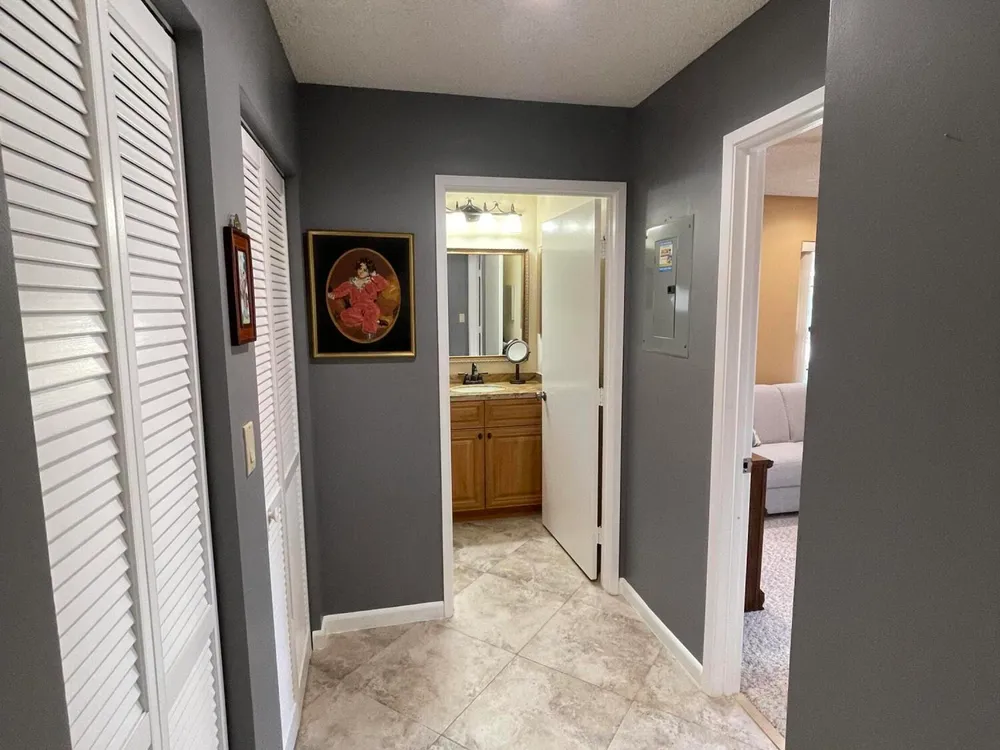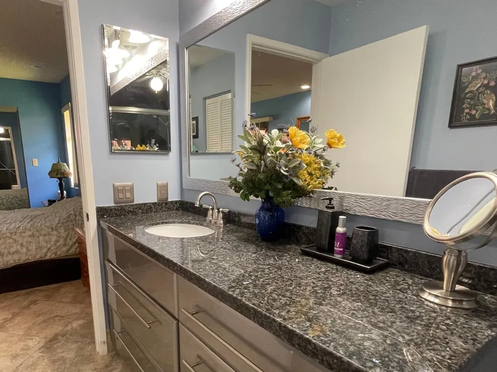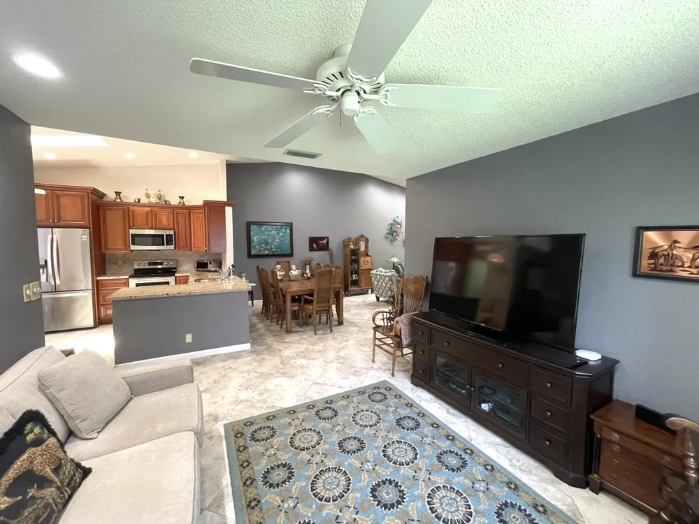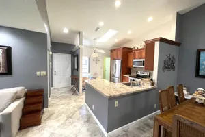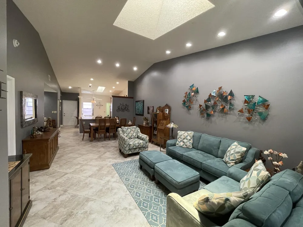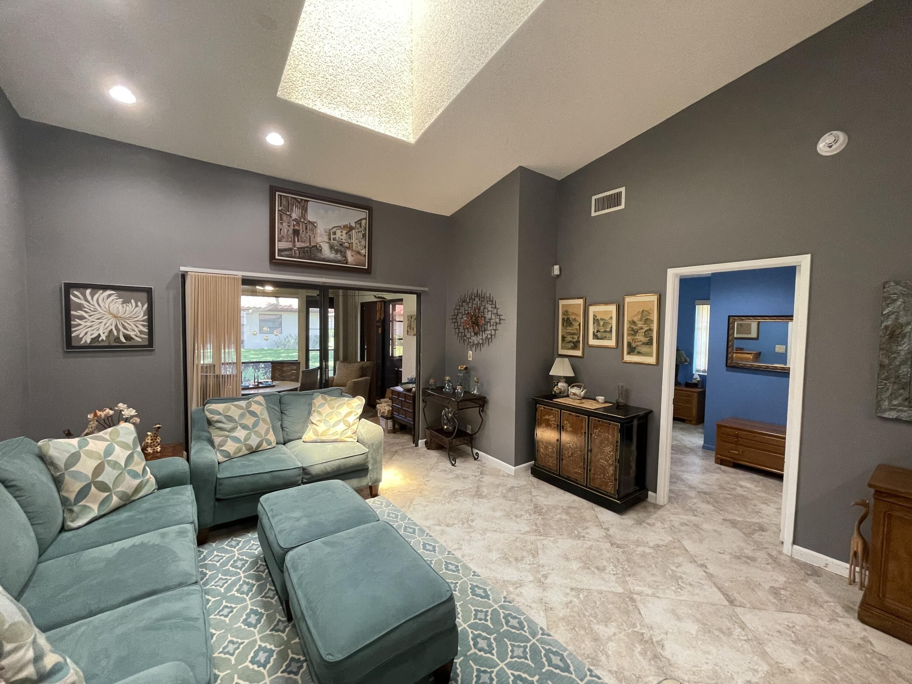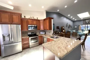 This expansive villa features soaring vaulted ceilings and an open concept layout perfect for modern living. The beautifully renovated kitchen is equipped with granite countertops and top-of-the-line stainless steel appliances, making it ideal for both cooking and entertaining. The home boasts elegant diagonal tile flooring throughout, complemented by ample high-hat lighting that adds a touch of brightness to every room.The renovated primary bathroom offers a serene retreat with modern finishes and a luxurious feel. Additional conveniences include a front-loaded washer and dryer and a quick closing option for your convenience.