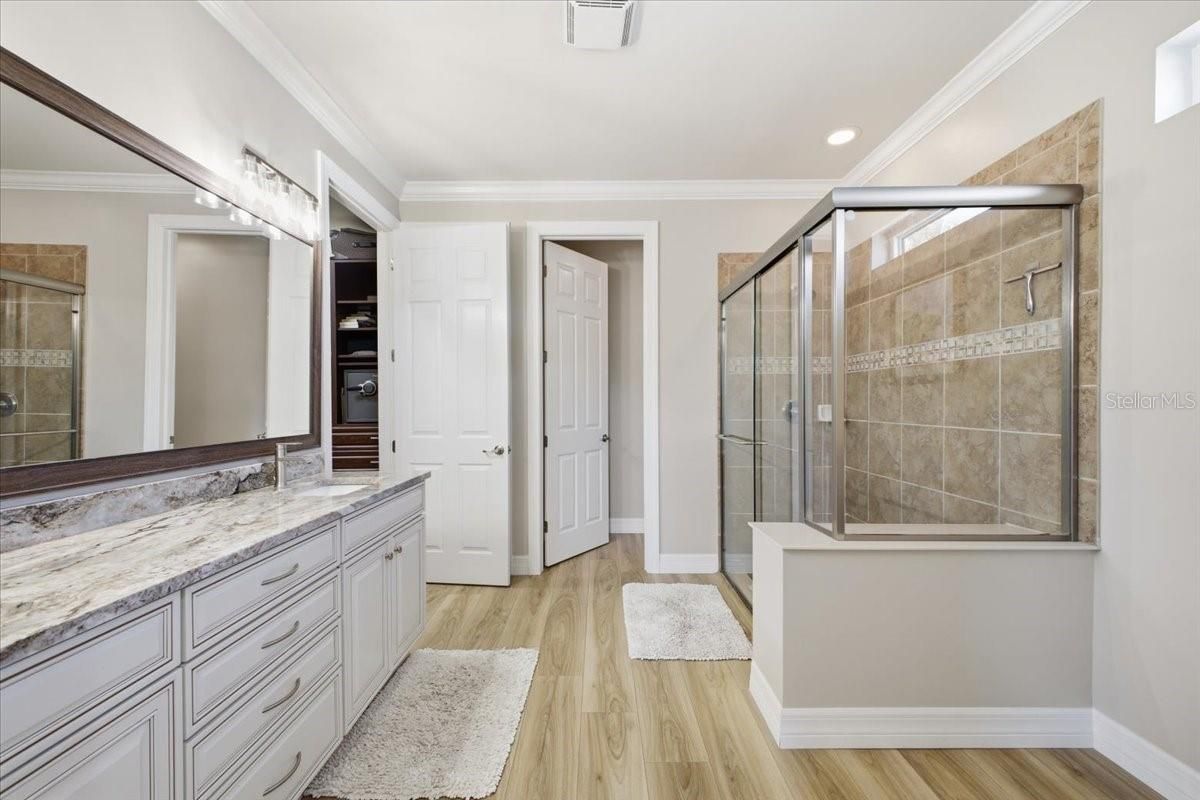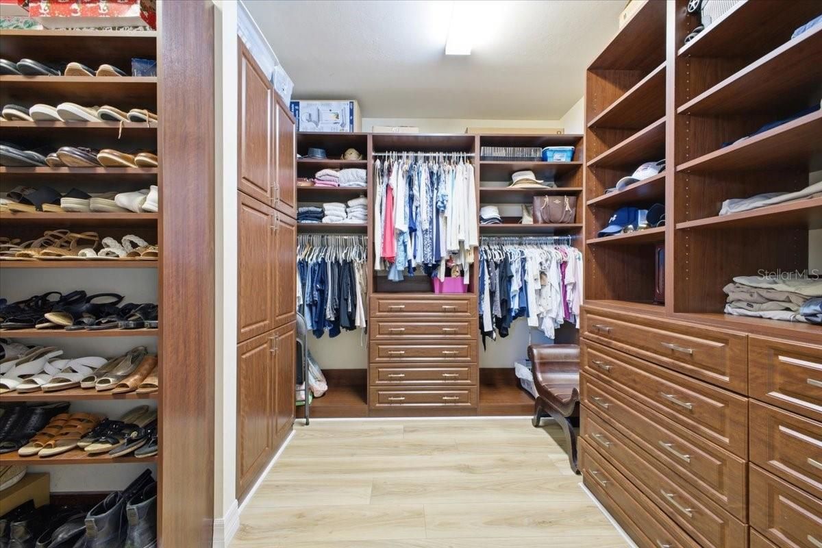 - Ceiling Fan(s), Central Vacuum, Crown Molding, Open Floorplan, Main Level Primary, Solid-Wood Cabinets, Stone Counters, Walk-In Closet(s), Wet Bar, Window Treatments