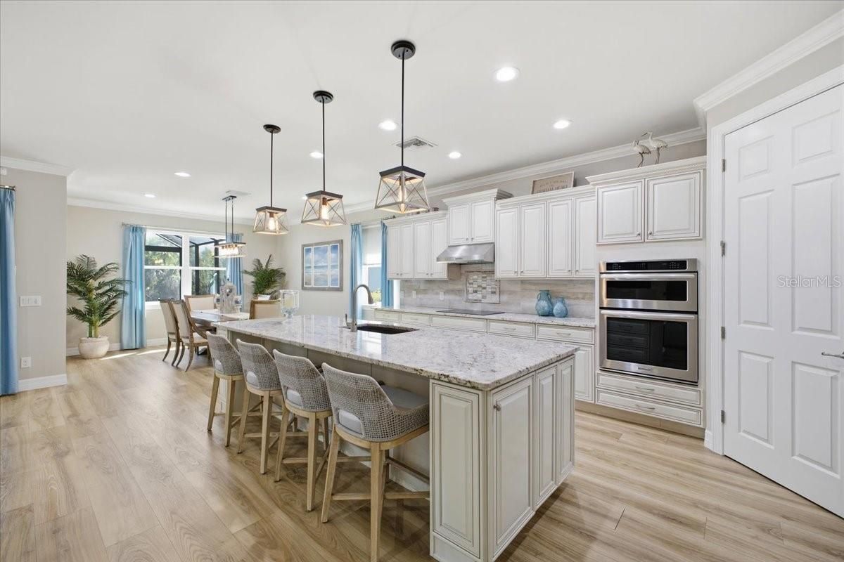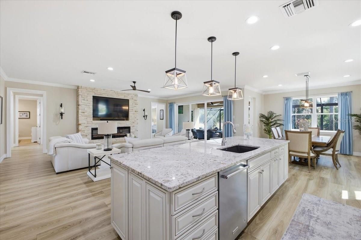 This exceptional home in The Isles of Palmer Ranch offers the perfect blend of luxury, comfort, and convenience, just minutes from grocery stores, beautiful Gulf beaches, and a wide selection of restaurants. Nestled on a quiet cul-de-sac, the property boasts a rare, open backyard space that enhances both privacy and enjoyment. Inside, the open-concept design seamlessly connects the kitchen, family room, and dining, highlighted by a stunning electric fireplace surrounded with cultured stone and a built-in 75" TV. Upon entry, you're greeted by an exquisite bar room/office featuring custom cabinetry, a sink, refrigerator, ice maker, and a stylish Samsung Frame TV. The home includes three spacious bedrooms, custom wood cased openings and crown molding throughout, and an oversized three-car extended garage. Designed for Florida living, the outdoor area features a custom PebbleTec pool and spa set on a concrete base beneath elegant pavers, new pool pump and pool heater with a panoramic pool screen enclosure. Additional upgrades NEW PGT IMPACT WINDOWS THROUGHOUT the entire home, a newly installed HVAC SYSTEM, an IRON IMPACT front door. Automatic roll-down hurricane screens in the lanai, stunning V-groove wood ceiling, offering both beauty and peace of mind.