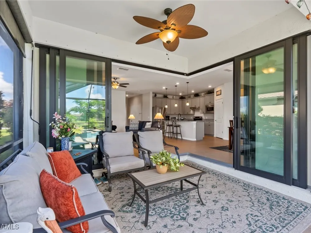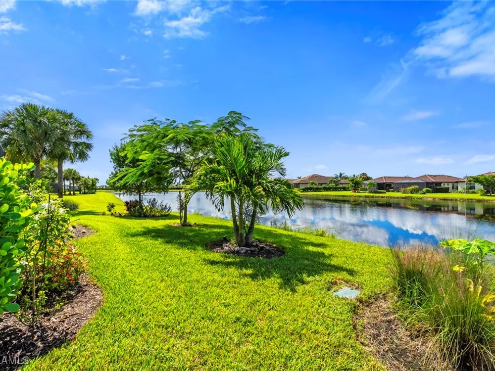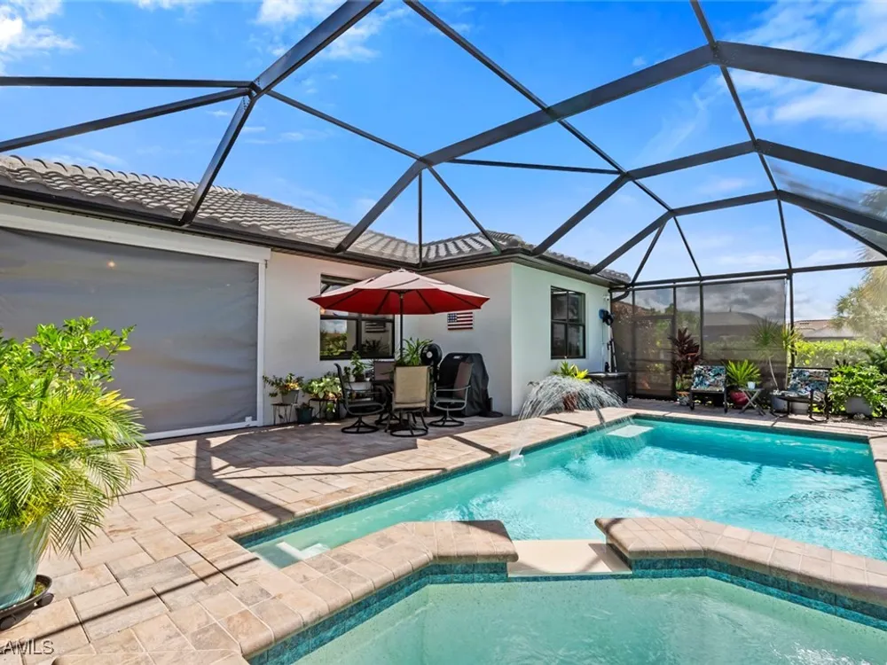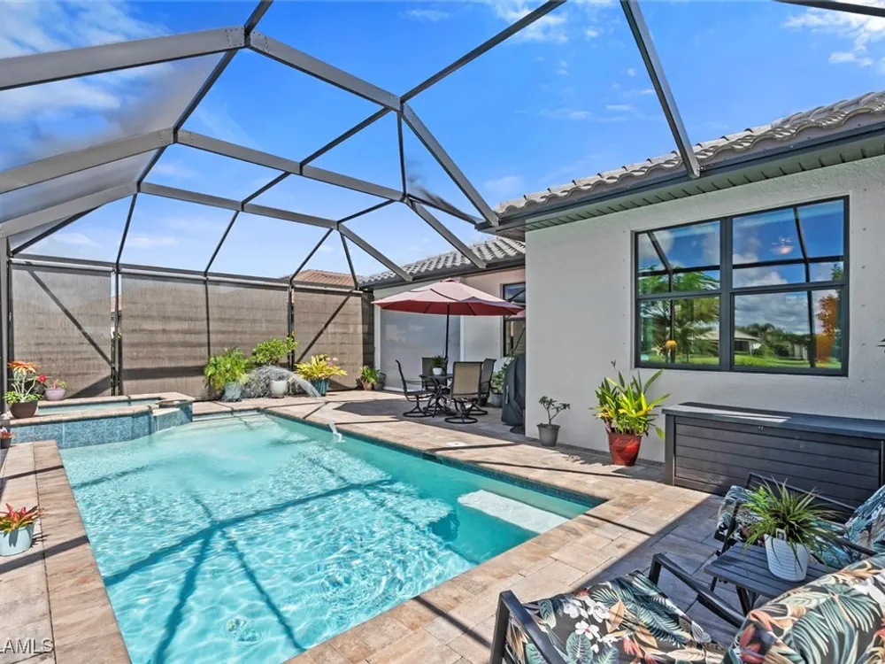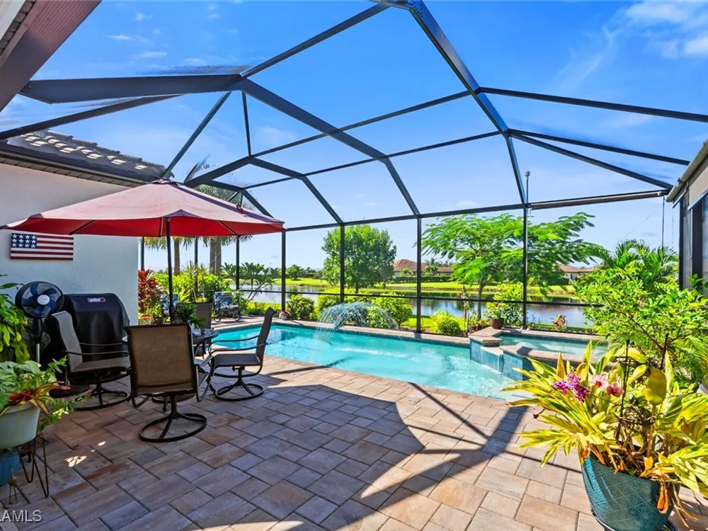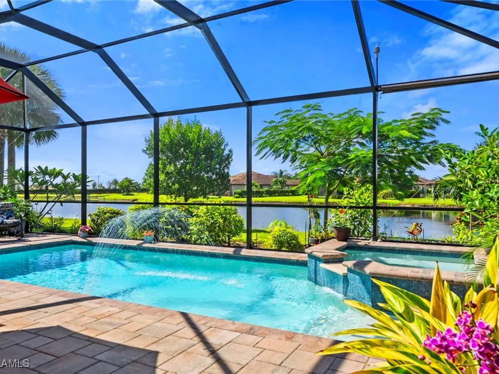 GOLF MEMBERSHIP • SALT WATER POOL/SPA • BREATHTAKING WATER VIEWS • Welcome to your dream home in the highly sought-after 55+ community of Del Webb Naples! This MYSTIQUE floor plan features 2 bedrooms plus a versatile den. Wake up to lakefront SUNRISES from the front of your home, then unwind in the evening with unforgettable SUNSETS from your private pool and spa. With PAID-IN-FULL SOLAR PANELS, enjoy dramatically reduced utility costs while also sustainably heating your pool and spa. Inside, the GOURMET KITCHEN impresses with a spacious island and custom light gray soft-close cabinetry with pull-outs. The inviting PRIMARY SUITE offers dual sinks, a walk-in shower, and a generous walk-in closet. The flexible den provides the perfect space for guests, a home office, or hobbies. Seamless indoor-outdoor living is yours with ZERO-CORNER POCKET SLIDERS opening to the LARGE EXTENDED LANAI, a true retreat featuring a HEATED SALTWATER POOL & SPA, CUSTOM SUN SHADES, and ELECTRIC HURRICANE SCREENS for comfort and peace of mind. The TANDEM GARAGE offers additional space for cars, a golf cart, or storage, complete with epoxy flooring, a bike/kayak rack, insulated garage door, and even air conditioning. Designer touches abound, including WHOLE HOUSE WATER PURIFICATION SYSTEM, on the diagonal tile flooring, and BRAND-NEW UPGRADED CARPET in the bedrooms. With FURNISHINGS NEGOTIABLE, this home is ready to move in NOW! GOLF LOVERS - This home comes with the Panther Run Golf Club MEMBERSHIP. In Del Webb Naples, you’ll enjoy WORLD-CLASS AMENITIES that rival luxury resorts: dine at the Rusty Putter Restaurant, soak in the RESORT-STYLE or LAP POOLS, break a sweat in the state-of-the-art FITNESS CENTER, and play your way through PICKLEBALL, TENNIS, bocce, billiards - even a top-tier GOLF SIMULATOR! Need groceries, church, or a bite to eat? Just hop in your golf cart and cruise into town - Publix and the heart of Ave Maria are just minutes away. This isn’t just a home - it’s a LIFESTYLE UPGRADE in one of Southwest Florida’s most vibrant 55+ communities. Don’t miss your chance to live where fun, fitness, and friendships flourish year-round!