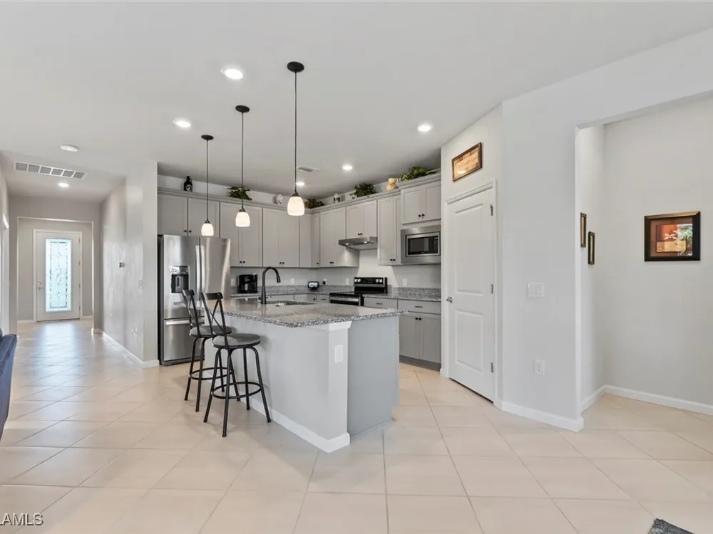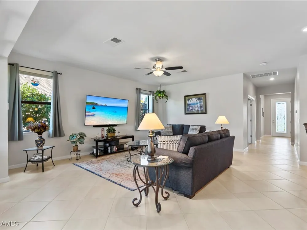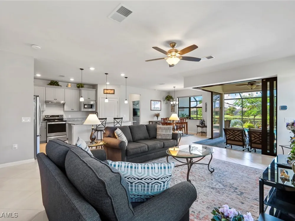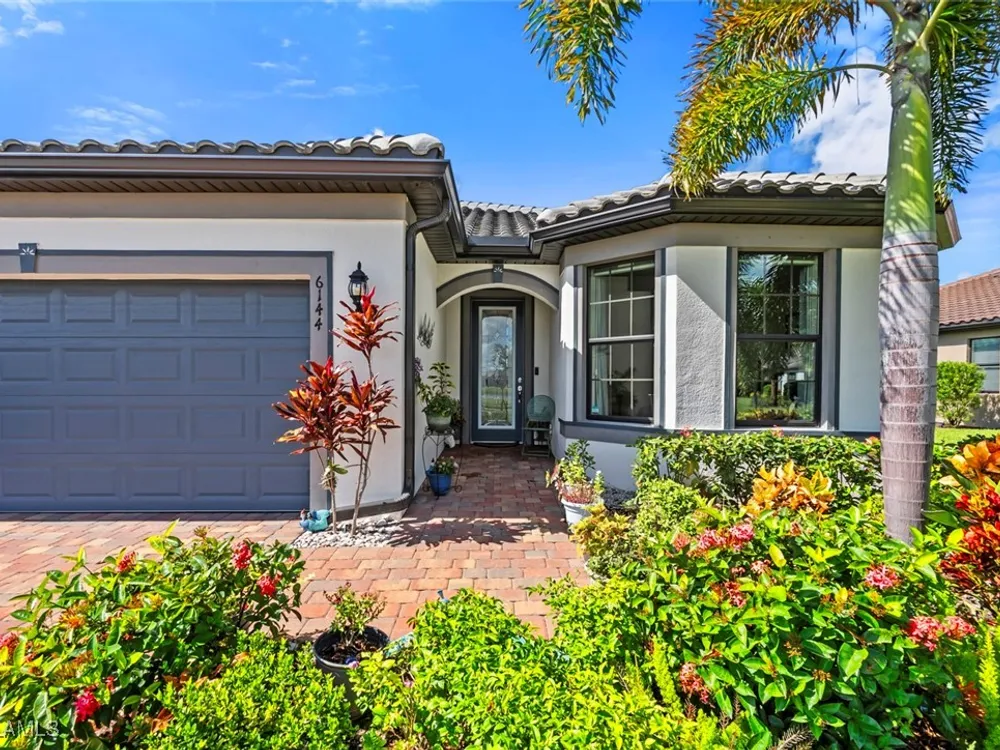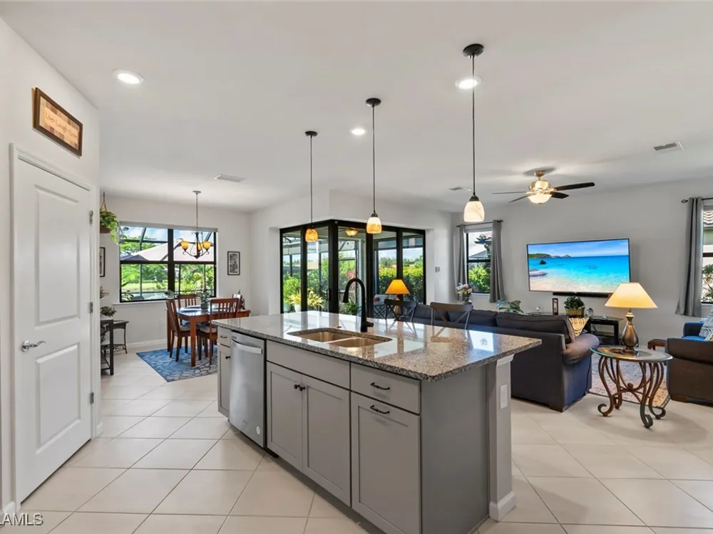 GOLF MEMBERSHIP • SALT WATER POOL/SPA • BREATHTAKING WATER VIEWS • Welcome to your dream home in the highly sought-after 55+ community of Del Webb Naples! This MYSTIQUE floor plan features 2 bedrooms plus a versatile den. Wake up to lakefront SUNRISES from the front of your home, then unwind in the evening with unforgettable SUNSETS from your private pool and spa. With PAID-IN-FULL SOLAR PANELS, enjoy dramatically reduced utility costs while also sustainably heating your pool and spa. Inside, the GOURMET KITCHEN impresses with a spacious island and custom light gray soft-close cabinetry with pull-outs. The inviting PRIMARY SUITE offers dual sinks, a walk-in shower, and a generous walk-in closet. The flexible den provides the perfect space for guests, a home office, or hobbies. Seamless indoor-outdoor living is yours with ZERO-CORNER POCKET SLIDERS opening to the LARGE EXTENDED LANAI, a true retreat featuring a HEATED SALTWATER POOL & SPA, CUSTOM SUN SHADES, and ELECTRIC HURRICANE SCREENS for comfort and peace of mind. The TANDEM GARAGE offers additional space for cars, a golf cart, or storage, complete with epoxy flooring, a bike/kayak rack, insulated garage door, and even air conditioning. Designer touches abound, including WHOLE HOUSE WATER PURIFICATION SYSTEM, on the diagonal tile flooring, and BRAND-NEW UPGRADED CARPET in the bedrooms. With FURNISHINGS NEGOTIABLE, this home is ready to move in NOW! GOLF LOVERS - This home comes with the Panther Run Golf Club MEMBERSHIP. In Del Webb Naples, you’ll enjoy WORLD-CLASS AMENITIES that rival luxury resorts: dine at the Rusty Putter Restaurant, soak in the RESORT-STYLE or LAP POOLS, break a sweat in the state-of-the-art FITNESS CENTER, and play your way through PICKLEBALL, TENNIS, bocce, billiards - even a top-tier GOLF SIMULATOR! Need groceries, church, or a bite to eat? Just hop in your golf cart and cruise into town - Publix and the heart of Ave Maria are just minutes away. This isn’t just a home - it’s a LIFESTYLE UPGRADE in one of Southwest Florida’s most vibrant 55+ communities. Don’t miss your chance to live where fun, fitness, and friendships flourish year-round!