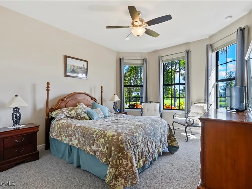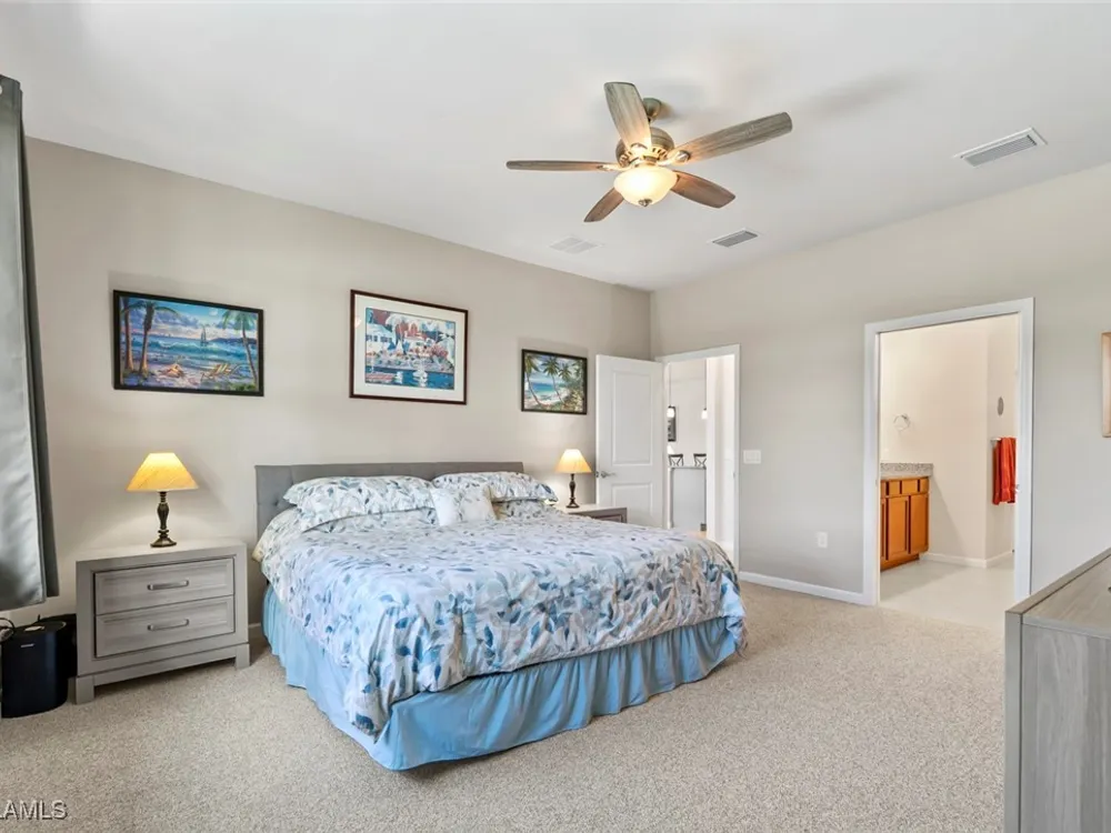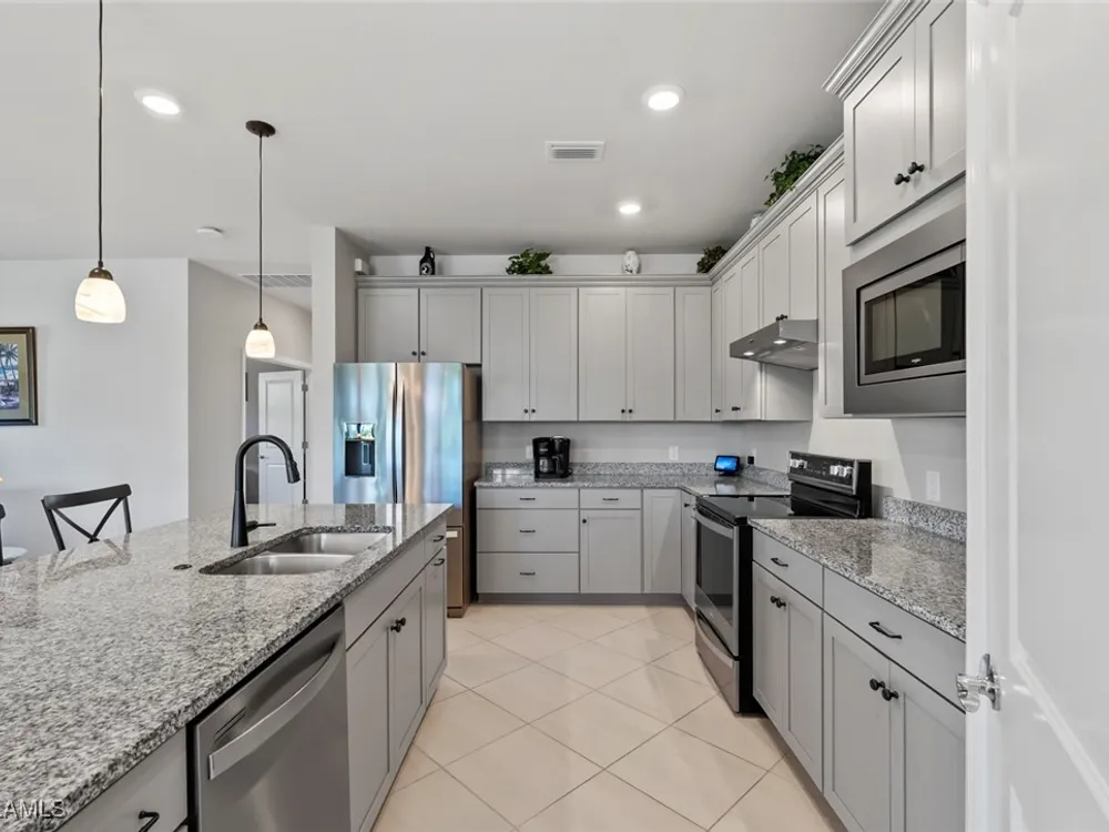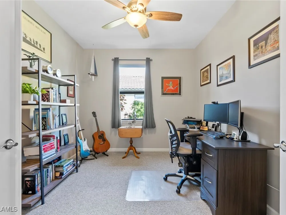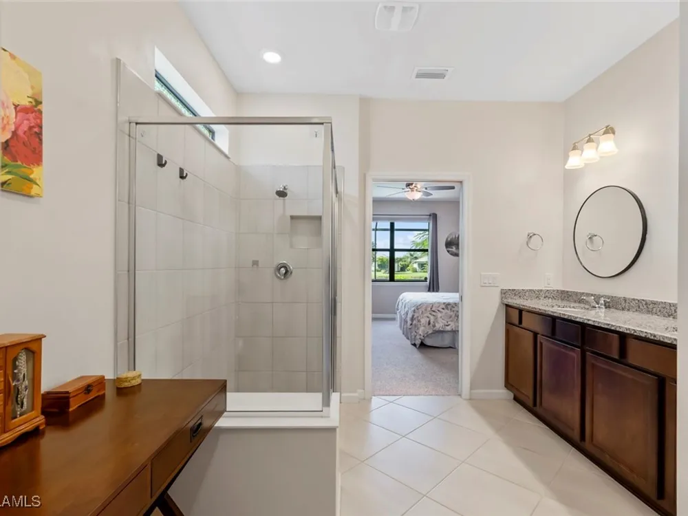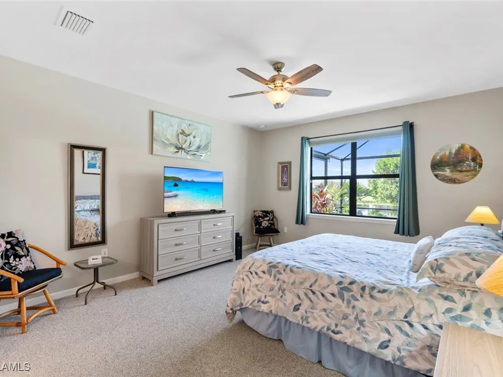 GOLF MEMBERSHIP • SALT WATER POOL/SPA • BREATHTAKING WATER VIEWS • Welcome to your dream home in the highly sought-after 55+ community of Del Webb Naples! This MYSTIQUE floor plan features 2 bedrooms plus a versatile den. Wake up to lakefront SUNRISES from the front of your home, then unwind in the evening with unforgettable SUNSETS from your private pool and spa. With PAID-IN-FULL SOLAR PANELS, enjoy dramatically reduced utility costs while also sustainably heating your pool and spa. Inside, the GOURMET KITCHEN impresses with a spacious island and custom light gray soft-close cabinetry with pull-outs. The inviting PRIMARY SUITE offers dual sinks, a walk-in shower, and a generous walk-in closet. The flexible den provides the perfect space for guests, a home office, or hobbies. Seamless indoor-outdoor living is yours with ZERO-CORNER POCKET SLIDERS opening to the LARGE EXTENDED LANAI, a true retreat featuring a HEATED SALTWATER POOL & SPA, CUSTOM SUN SHADES, and ELECTRIC HURRICANE SCREENS for comfort and peace of mind. The TANDEM GARAGE offers additional space for cars, a golf cart, or storage, complete with epoxy flooring, a bike/kayak rack, insulated garage door, and even air conditioning. Designer touches abound, including WHOLE HOUSE WATER PURIFICATION SYSTEM, on the diagonal tile flooring, and BRAND-NEW UPGRADED CARPET in the bedrooms. With FURNISHINGS NEGOTIABLE, this home is ready to move in NOW! GOLF LOVERS - This home comes with the Panther Run Golf Club MEMBERSHIP. In Del Webb Naples, you’ll enjoy WORLD-CLASS AMENITIES that rival luxury resorts: dine at the Rusty Putter Restaurant, soak in the RESORT-STYLE or LAP POOLS, break a sweat in the state-of-the-art FITNESS CENTER, and play your way through PICKLEBALL, TENNIS, bocce, billiards - even a top-tier GOLF SIMULATOR! Need groceries, church, or a bite to eat? Just hop in your golf cart and cruise into town - Publix and the heart of Ave Maria are just minutes away. This isn’t just a home - it’s a LIFESTYLE UPGRADE in one of Southwest Florida’s most vibrant 55+ communities. Don’t miss your chance to live where fun, fitness, and friendships flourish year-round!