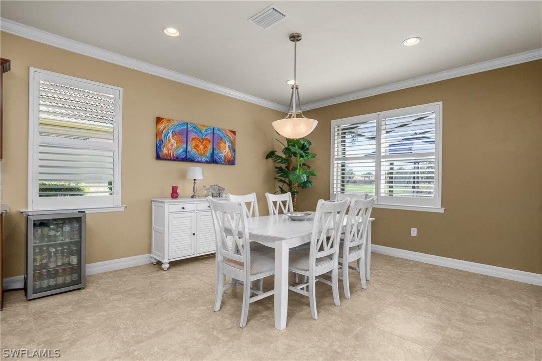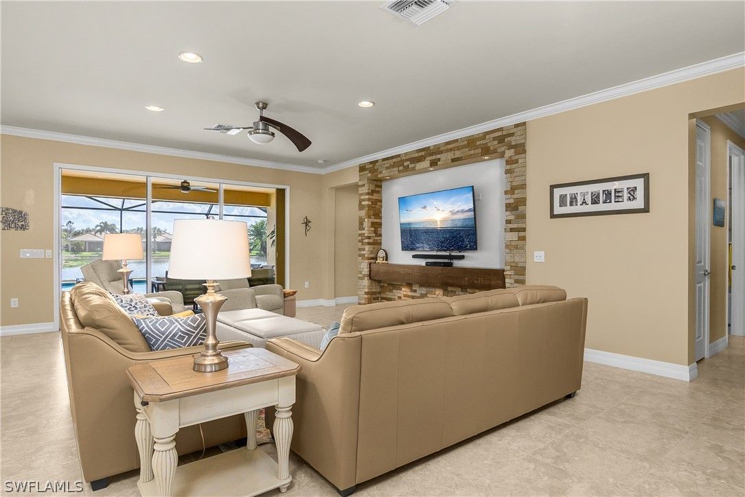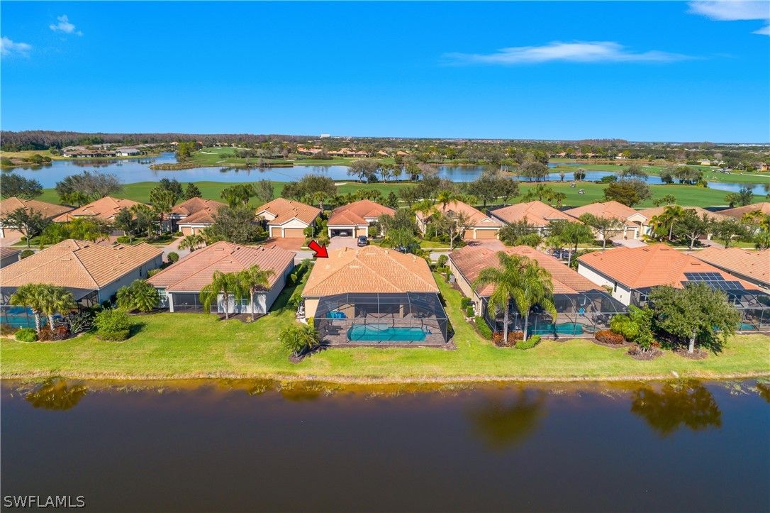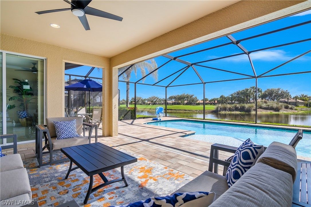 Discover one of the best views in Del Webb Naples at this beautifully maintained 2013 Pinnacle model, offering 3 bedrooms plus a den, 3 full baths, and 2,496 sq ft of gracious living space. Perfectly positioned with southern exposure, enjoy breathtaking lake-to-golf course vistas overlooking the 10th green—golf membership included with purchase! Step outside to your oversized heated saltwater pool with sun shelf (added 2021), fully screened lanai with roll-down hurricane shades, accordion shutters on windows, and impact-resistant features for peace of mind. Recent upgrades include a 2022 master bath remodel (expanded shower, new counters, custom closet system), new HVAC, exterior paint, luxury vinyl flooring in bedrooms (2021), upgraded stainless appliances with induction cooktop, and a new dishwasher (2025). Inside, find crown molding throughout, granite counters, under/over-cabinet lighting, pendant lights, custom fans, built-in cabinets, walk-in closets, and a spacious 3-car extended garage with epoxy floor and insulated garage door. The split-bedroom great room floor plan flows seamlessly to the screened lanai and pool area—ideal for relaxing or entertaining. Nestled in the friendly, gated Del Webb Naples 55+ community, enjoy resort-style amenities: 18-hole golf course, clubhouse, fitness center, pools, spa, tennis/pickleball/bocce courts, dog park, billiards, library, restaurant, and more. HOA covers lawn maintenance, cable, irrigation, and recreation. This move-in-ready gem combines luxury upgrades, unbeatable views, and an active lifestyle in one of Naples' most welcoming communities. Brand new golf cart available separately for sale. Don't miss this amazing opportunity!