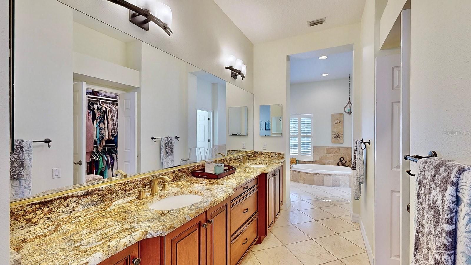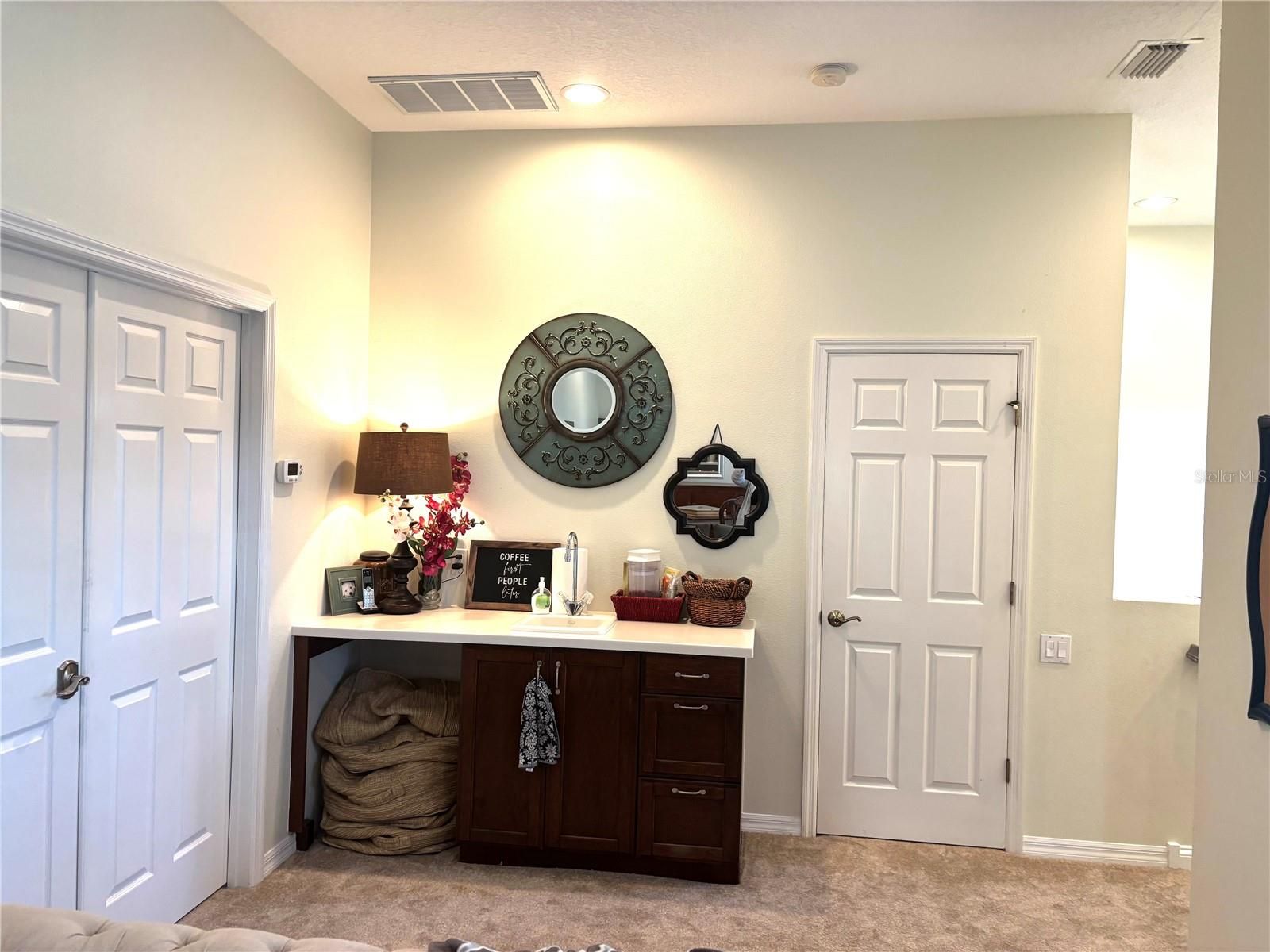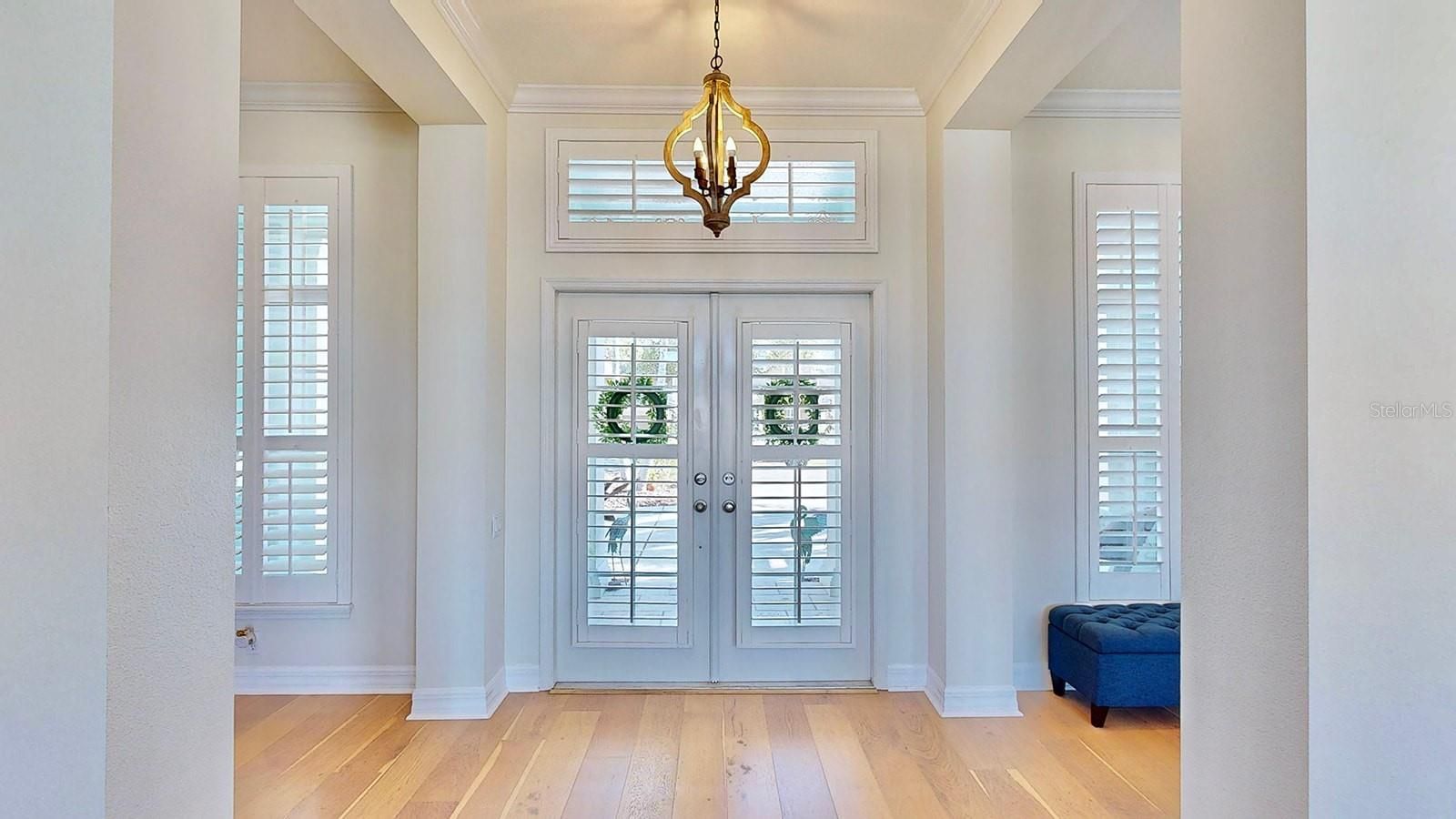 - Ceiling Fan(s), Central Vacuum, Coffered Ceiling(s), Crown Molding, Eat-in Kitchen, High Ceilings, Kitchen/Family Room Combo, Open Floorplan, Solid-Wood Cabinets, Stone Counters, Thermostat, Walk-In Closet(s), Wet Bar, Window Treatments