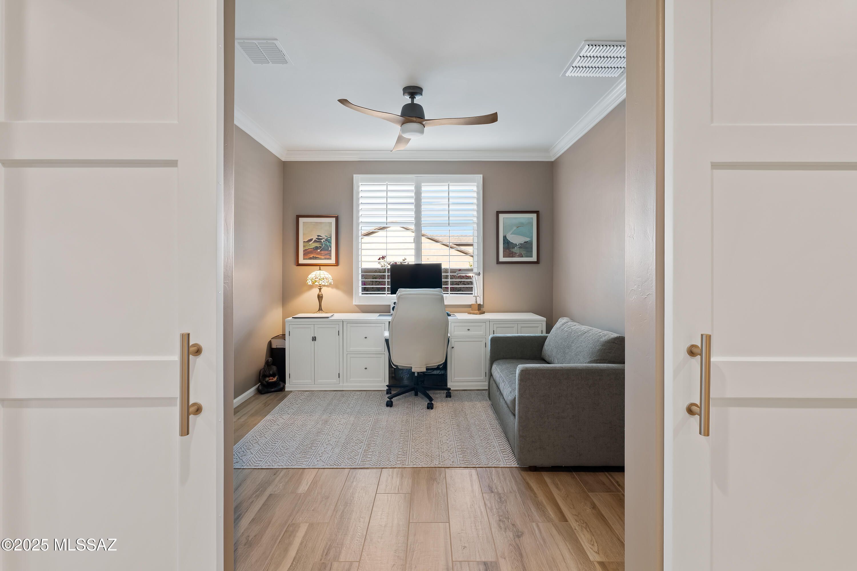 Highly upgraded 2021 Fresco model with 2026 sq ft and over $148K in after-build upgrades. Kitchen features an entertainer's island with quartz countertops, Blanco sink, above and below cabinet lighting, custom mosaic tile backsplash wall and walk-in pantry. 2-bedrooms with ensuites, along with a den converted to a 3rd bedroom with custom barndoors and built in custom closet. Large walk-in custom closet in the Master bedroom. Master bath has a sizable walk-in shower with built-in seat. Substantial laundry room with custom built in storage cabinets. Basswood Plantation shutters, crown molding, upgraded ceiling fans and wood-look ceramic tile in every room. No carpeting or linoleum. Hunter Douglas motorized shades at extra-large sliding glass door. Large 3-car garage with 4 ft