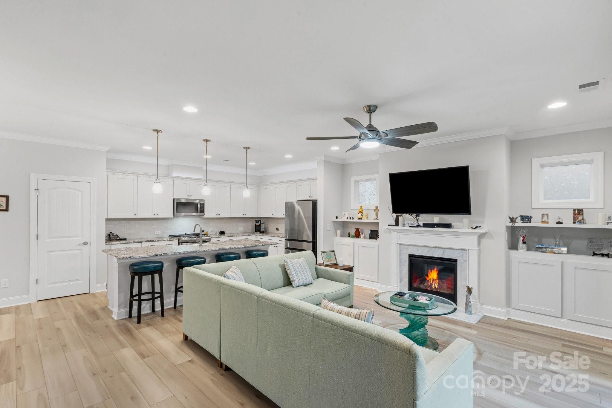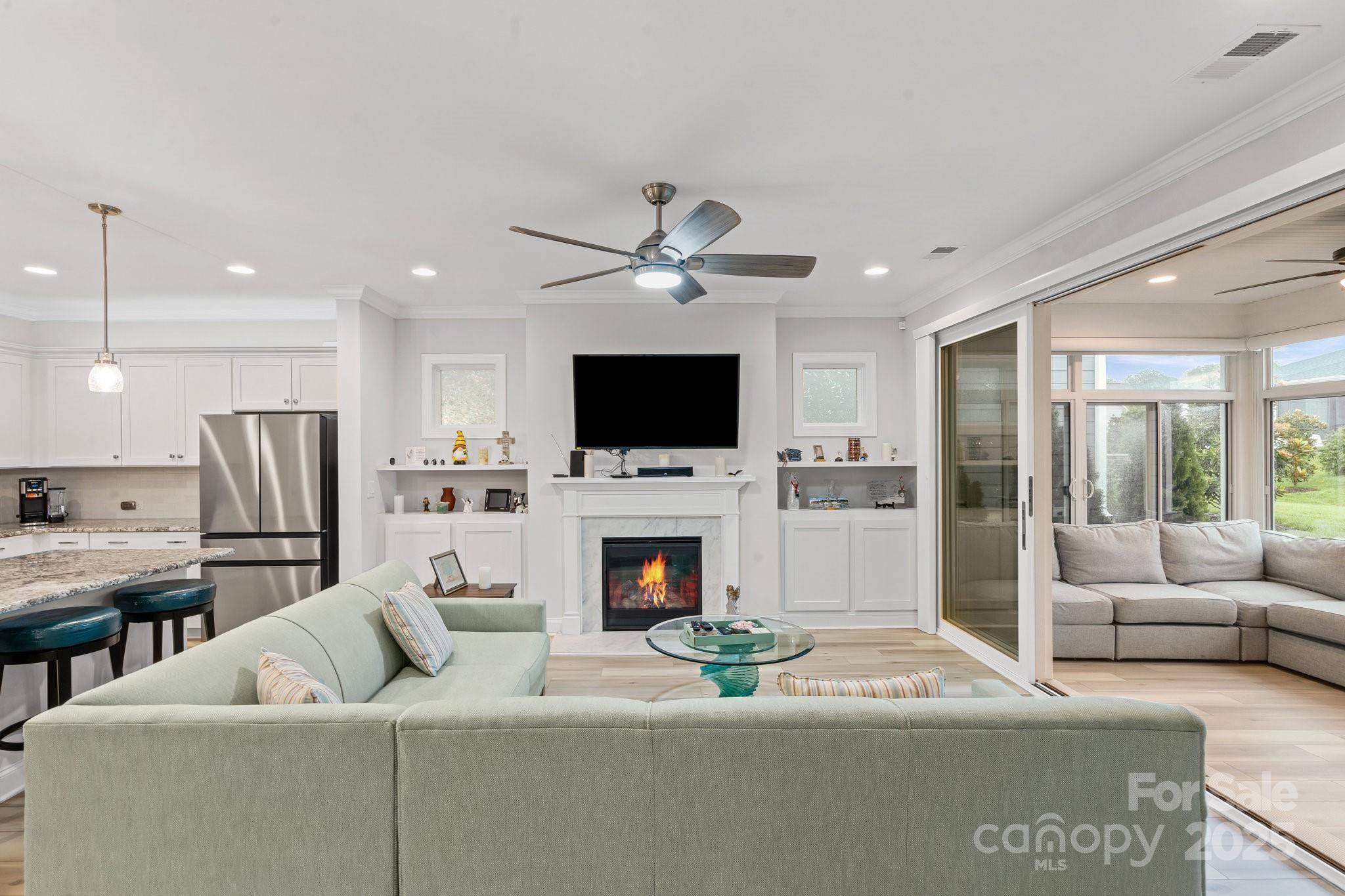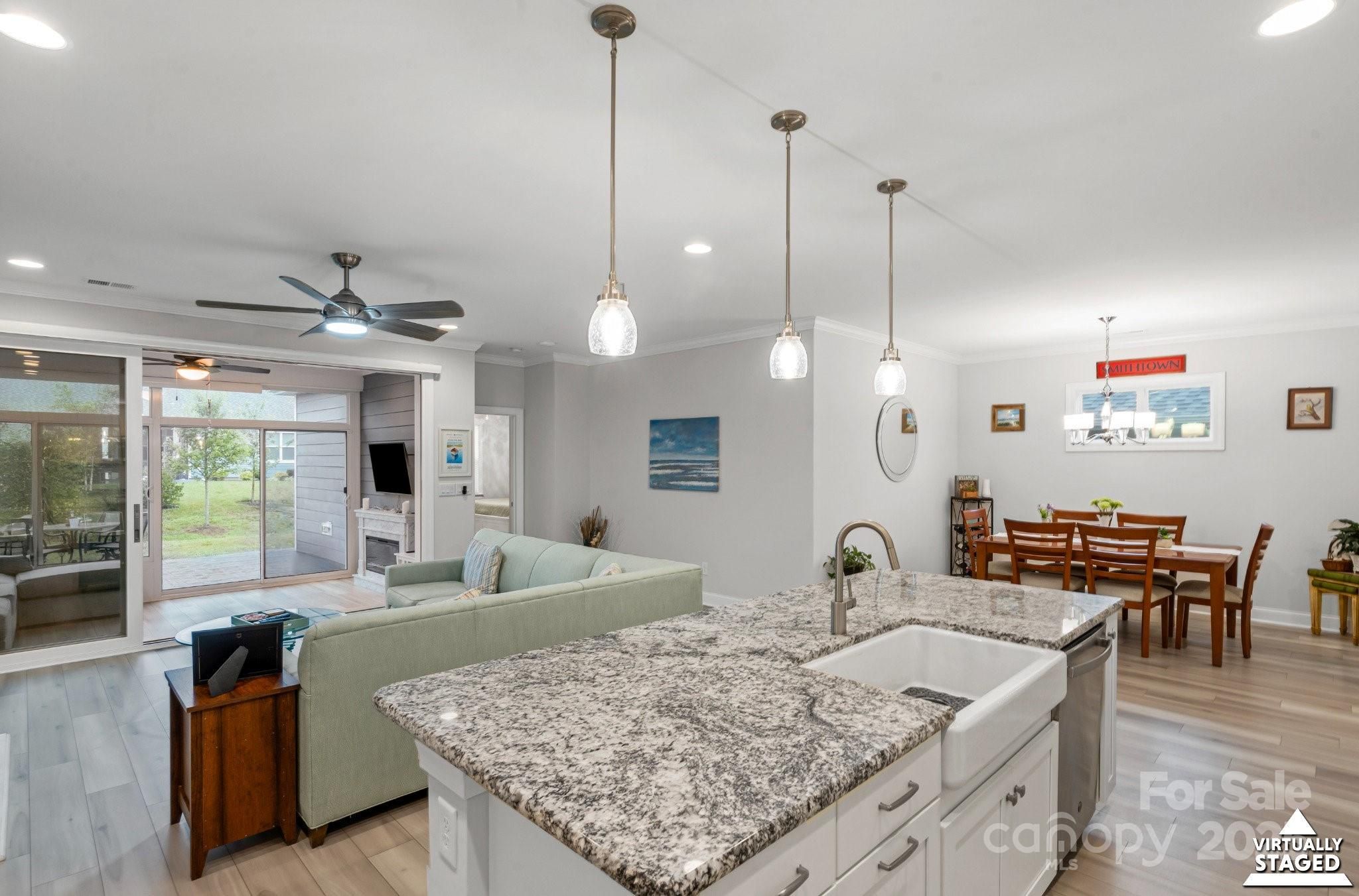 Open concept Glory plan, w/split 2BR, 2B, flex space & crown molding throughout. Well-appointed kitchen anchors the main living area & includes SS appliances, gas range, refrigerator, solid surface countertops, pendant lighting, light craftsman style cabinetry w/soft close drawers, tile back splash & island serving bar. Great room features a gas-log fireplace flanked by custom built in cabinetry & flows seamlessly thru the sliding wall of glass to a peaceful 3 season sunroom & onto the paver patio for additional entertaining options. Serene master suite includes an ensuite bath with dual sink vanity, tile floor & a generous walk-in custom closet & tiled shower. Low maintenance Laminate & tile flooring throughout (no carpet). 2 additional bedrooms have custom closets and an adjoining bath. Large laundry room includes washer & dryer along w/additional cabinetry. Attached 2 Car garage for added storage options. HVAC has a HEPA Filtration system. Trilogy Membership includes Freedom Boat Club on Lake Norman plus award winning amenities