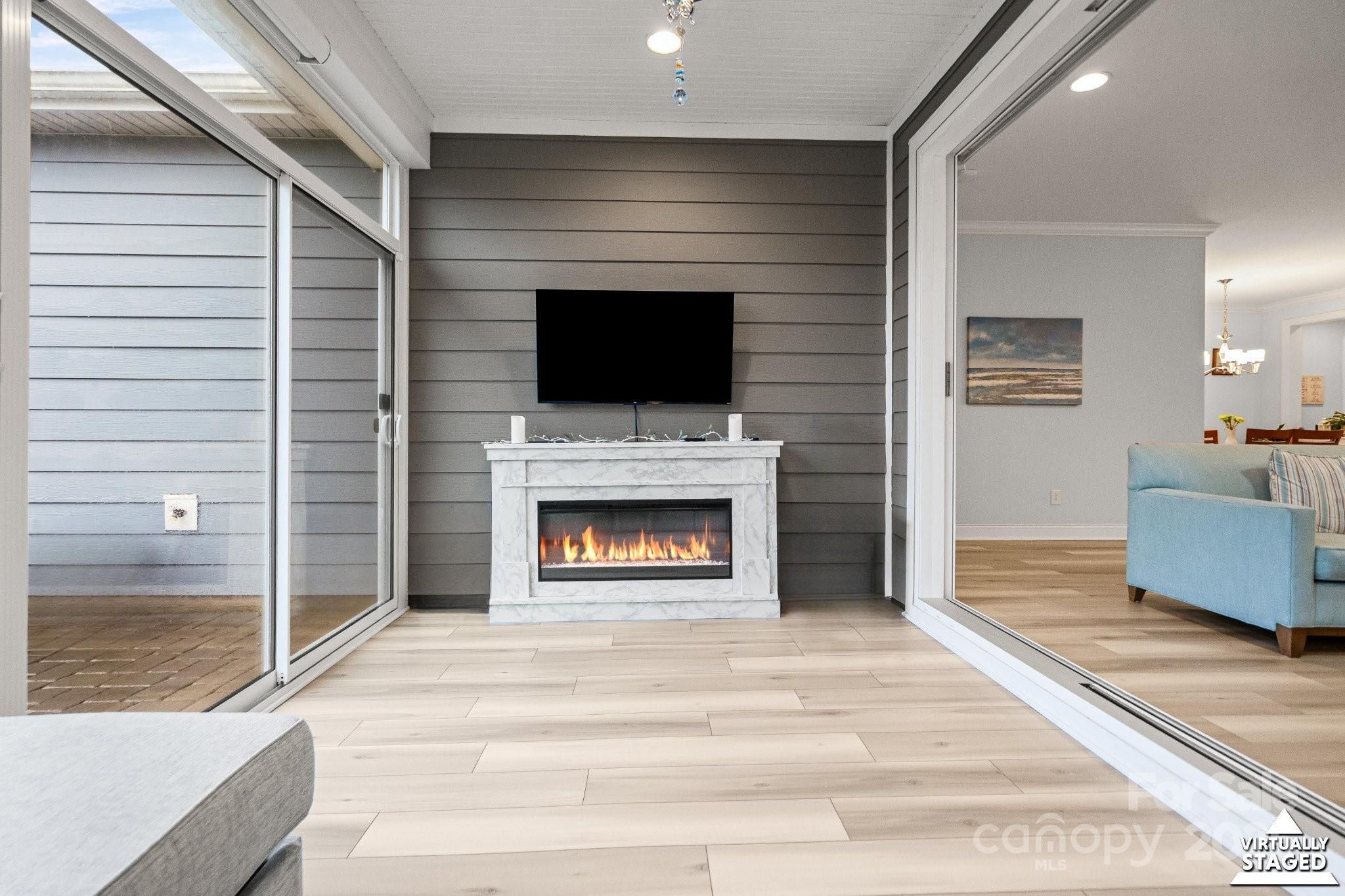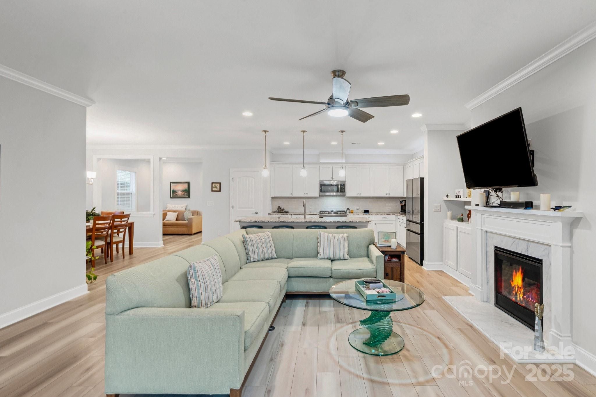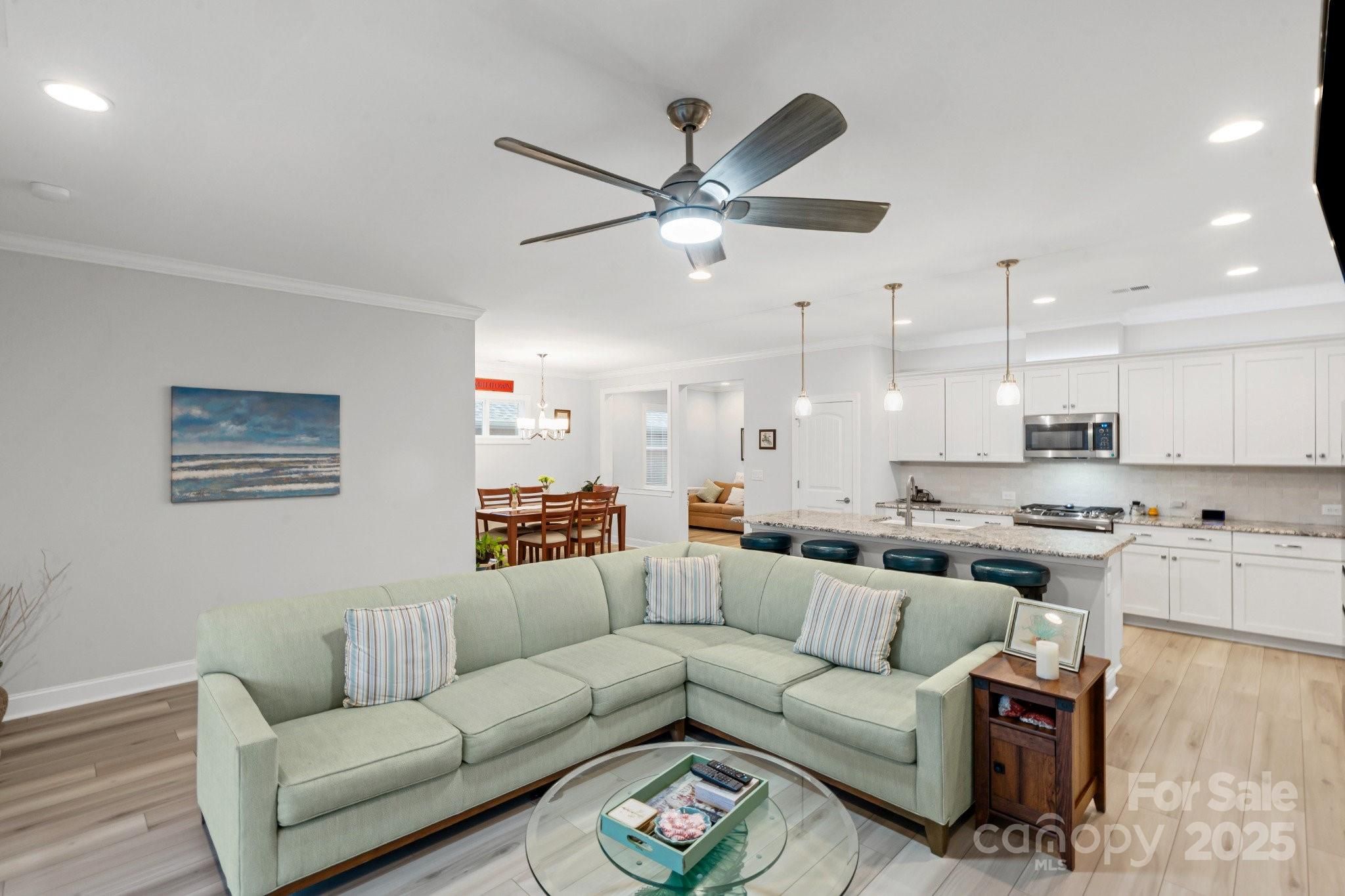 Open concept Glory plan, w/split 2BR, 2B, flex space & crown molding throughout. Well-appointed kitchen anchors the main living area & includes SS appliances, gas range, refrigerator, solid surface countertops, pendant lighting, light craftsman style cabinetry w/soft close drawers, tile back splash & island serving bar. Great room features a gas-log fireplace flanked by custom built in cabinetry & flows seamlessly thru the sliding wall of glass to a peaceful 3 season sunroom & onto the paver patio for additional entertaining options. Serene master suite includes an ensuite bath with dual sink vanity, tile floor & a generous walk-in custom closet & tiled shower. Low maintenance Laminate & tile flooring throughout (no carpet). 2 additional bedrooms have custom closets and an adjoining bath. Large laundry room includes washer & dryer along w/additional cabinetry. Attached 2 Car garage for added storage options. HVAC has a HEPA Filtration system. Trilogy Membership includes Freedom Boat Club on Lake Norman plus award winning amenities