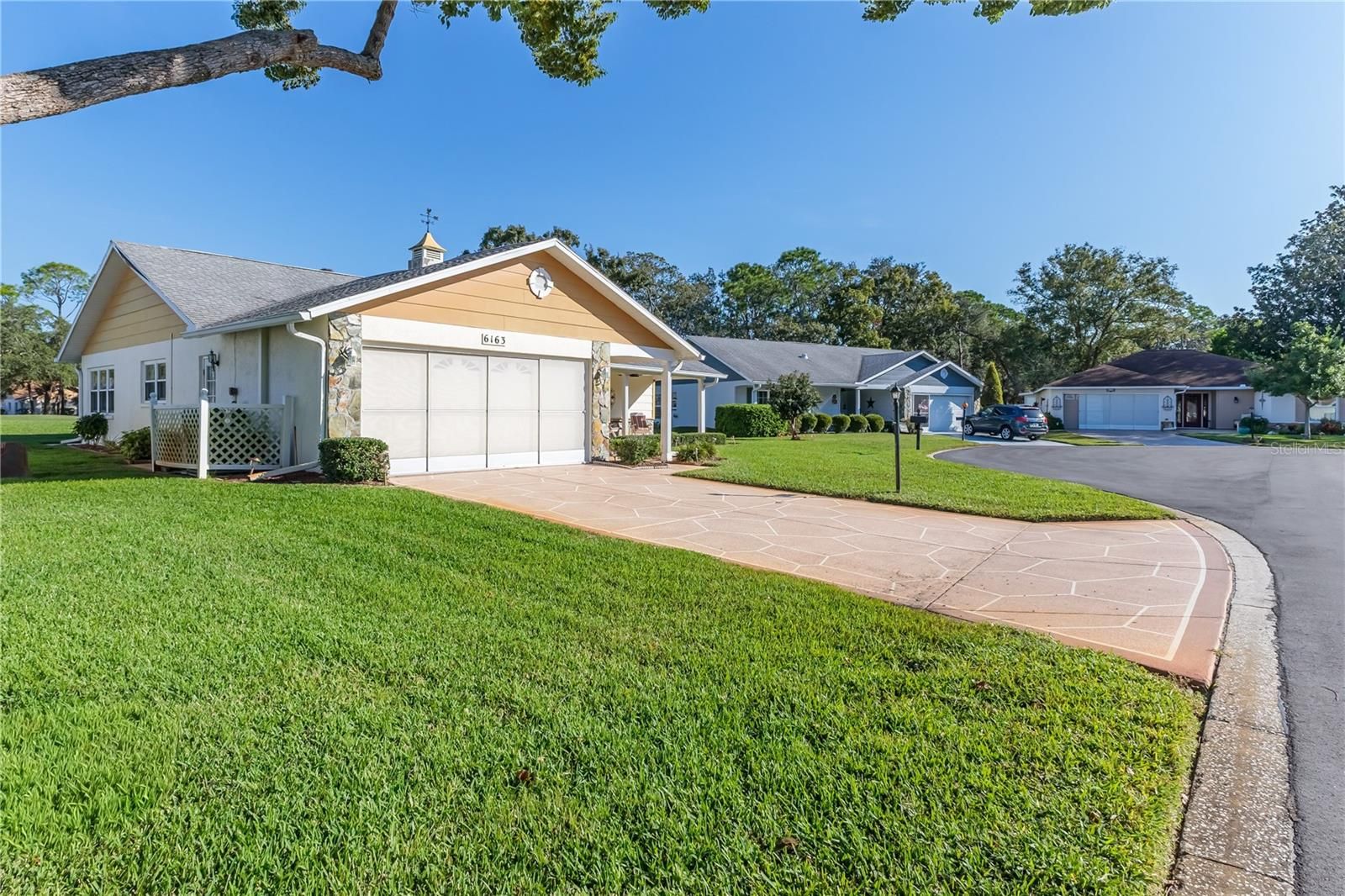 This beautifully maintained 2-bedroom, 2-bathroom, 2-car garage home is located on The Lakes Golf Course, offering gorgeous panoramic views and the true Florida lifestyle. From the moment you arrive, you'll be impressed by the delightfully painted driveway and walkway that add to the home's amazing curb appeal. The charming front porch is the ideal spot to relax under the ceiling fan and visit with neighbors. Step inside to a bright and open living room and dining room combination, complete with a front coat-closet and a comfortable split-bedroom floor plan for added privacy. The spacious kitchen features beautiful golf course views, a window that opens to the lanai, a large pantry with pull-out shelves, and plenty of cabinet space. The family room flows seamlessly to the enclosed lanai, where you can unwind and take in the peaceful golf course scenery. The primary suite includes a large walk-in closet and a private bath with a step-in shower. On the opposite side of the home, you'll find the guest bedroom with a large closet and a full bath with a tub and shower. Enjoy the benefits of a 2022 HVAC system, windows replaced in 2014, irrigation well, and a roof from 2002. The inside laundry room offers cabinets, a utility sink, washer, dryer, and extra storage space. The garage features sliding screen doors, allowing fresh air to flow through while you work or relax. Ground remediation has been completed, with an engineer's report available — this home is fully insurable. Furnishings and golf cart are available for purchase separately. Timber Pines is an award winning, guard-gated, 55+, deed-restricted community offering a resort-style lifestyle: three 18-hole golf courses, a 9-hole pitch & putt, tennis, 12 pickleball courts, two community swimming pools, country club restaurant and bar, fitness center, billiards, performing arts, and over 100 social clubs and activities.