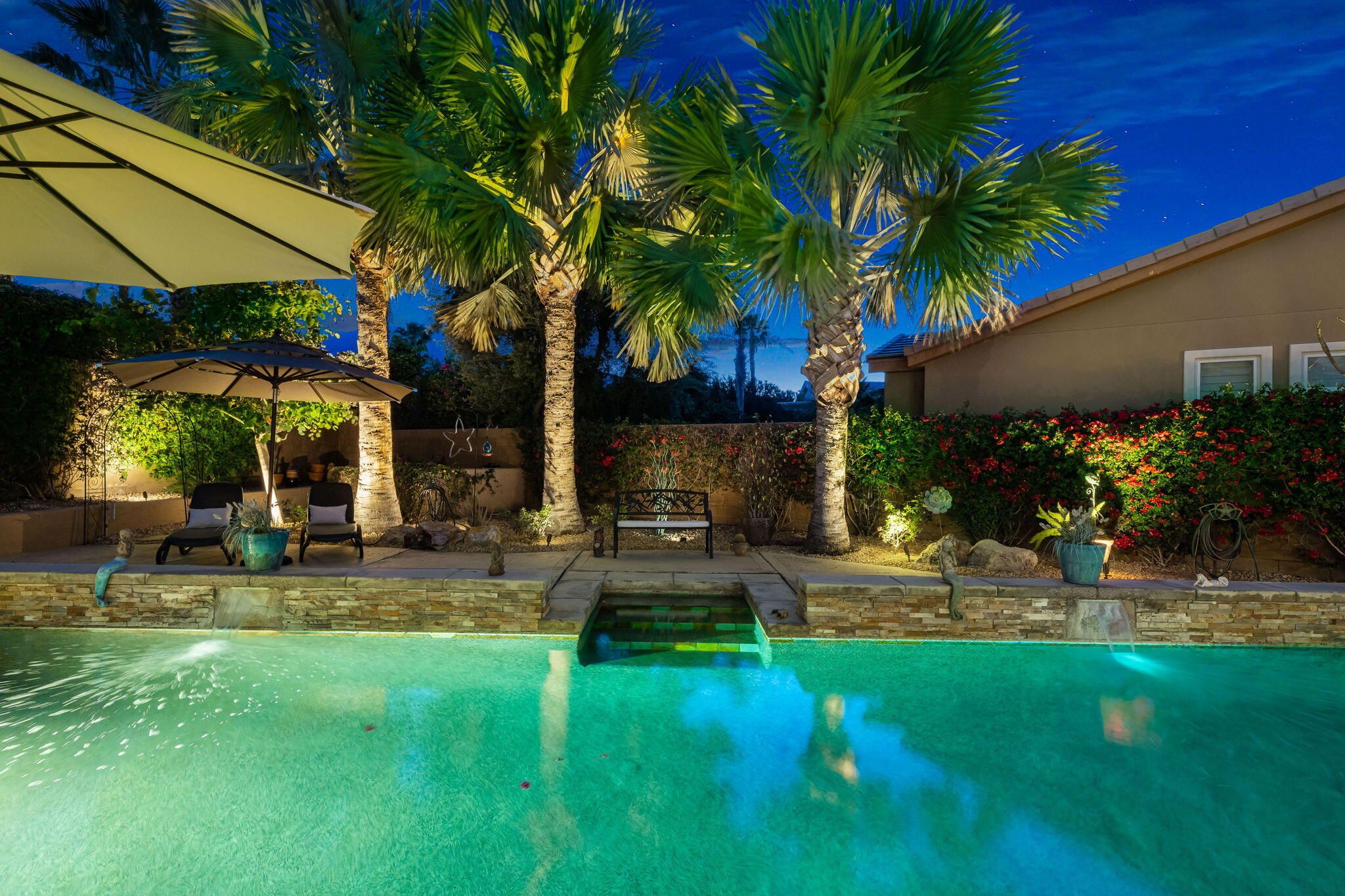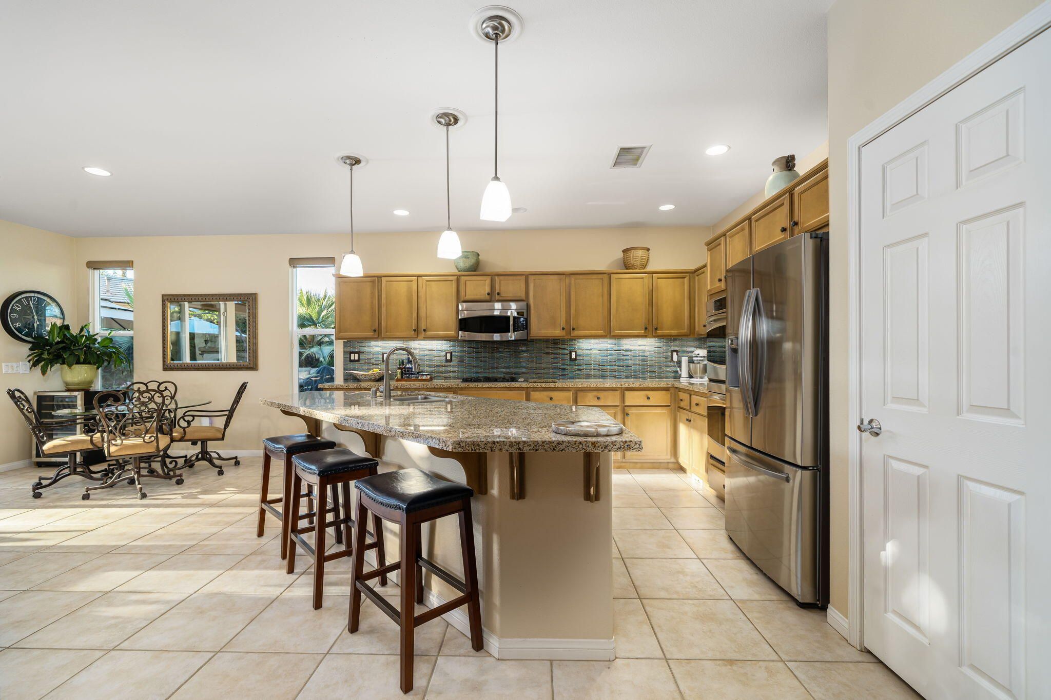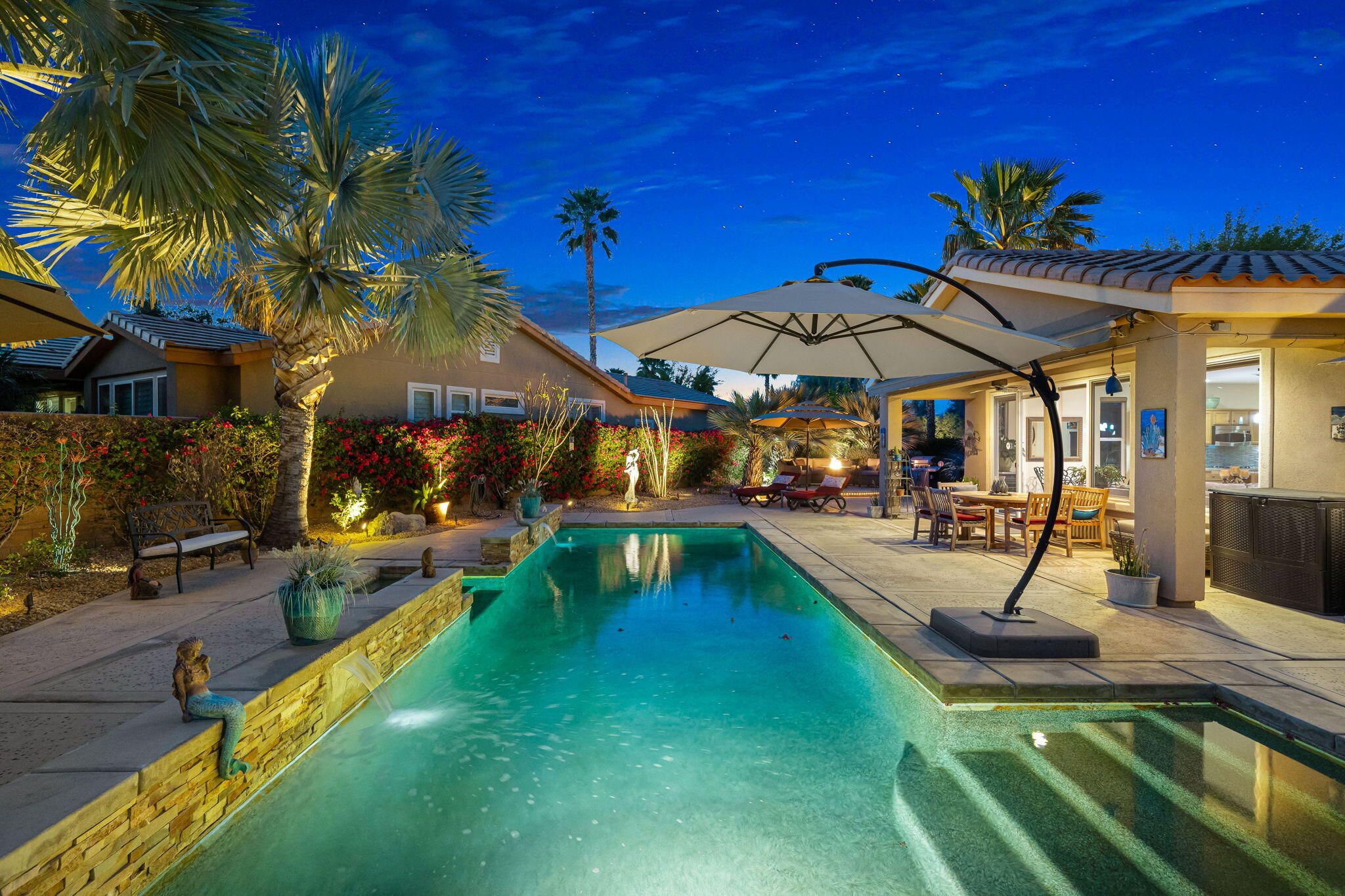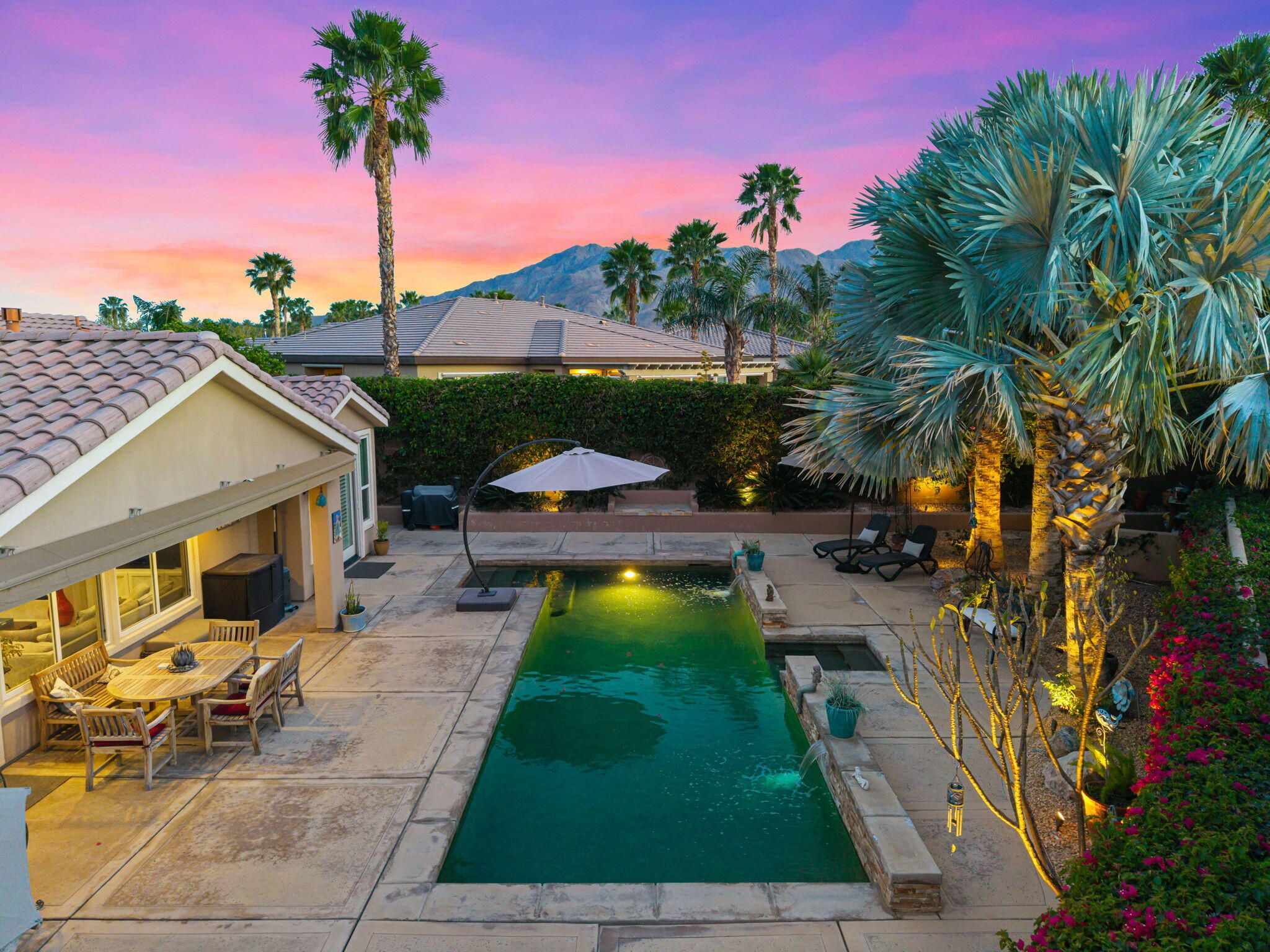 This sought-after Monterey residence elevates desert living with a sprawling 14,375-sq-ft homesite, long private driveway, and unforgettable mountain and pool vistas. Inside, nearly 2,000 sq ft of airy, open-concept design welcomes you through a custom wrought-iron privacy gate into a charming front courtyard that gracefully winds toward the resort-style backyard. A detached casita--with its own cabinetry, sink, and full bath--adds incredible flexibility for guests or creative use. The den/office/optional fourth bedroom, complete with French doors to the courtyard, expands the home's versatility even further. The great room impresses with a built-in media center and elegant tile-surround fireplace, while the adjacent chef's kitchen shines with a generous prep island, bar seating, pendant lighting, stainless appliances, double ovens, slab granite, custom backsplash, gas cooktop, and walk-in pantry. Step outside to your private tropical escape featuring lush landscaping, a Pebble Tec pool with dual water descents, fire pit, awning, multiple lounging areas, and sweeping panoramic views. The primary suite offers its own French-door access to the pool, plus custom shutters and a spa-inspired bath with dual vanities, a spacious shower, and walk-in closet. A rare La Quinta gem--schedule your private tour and experience the lifestyle for yourself.