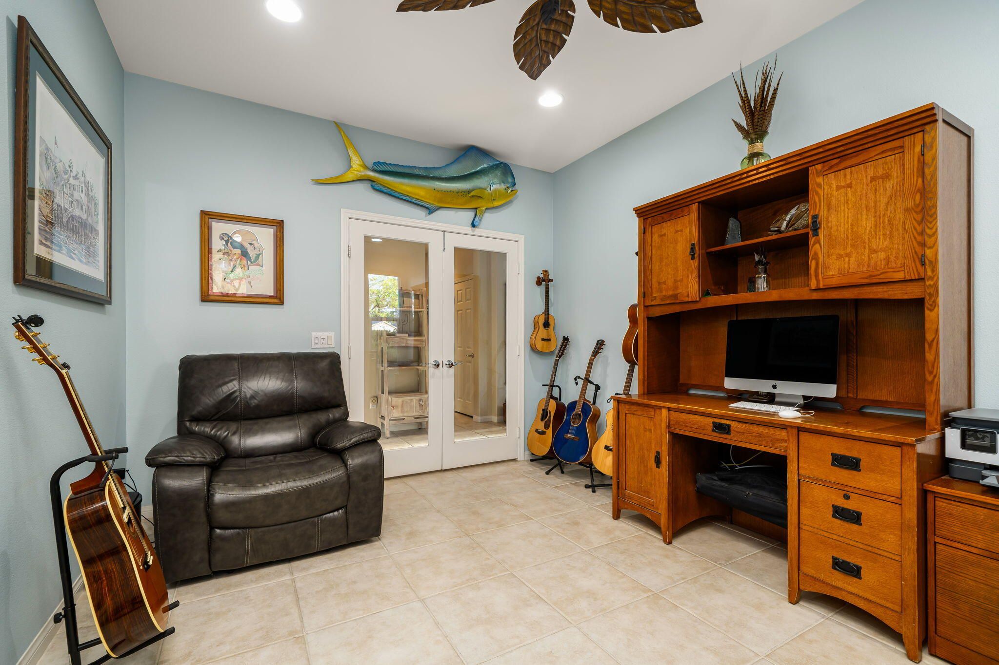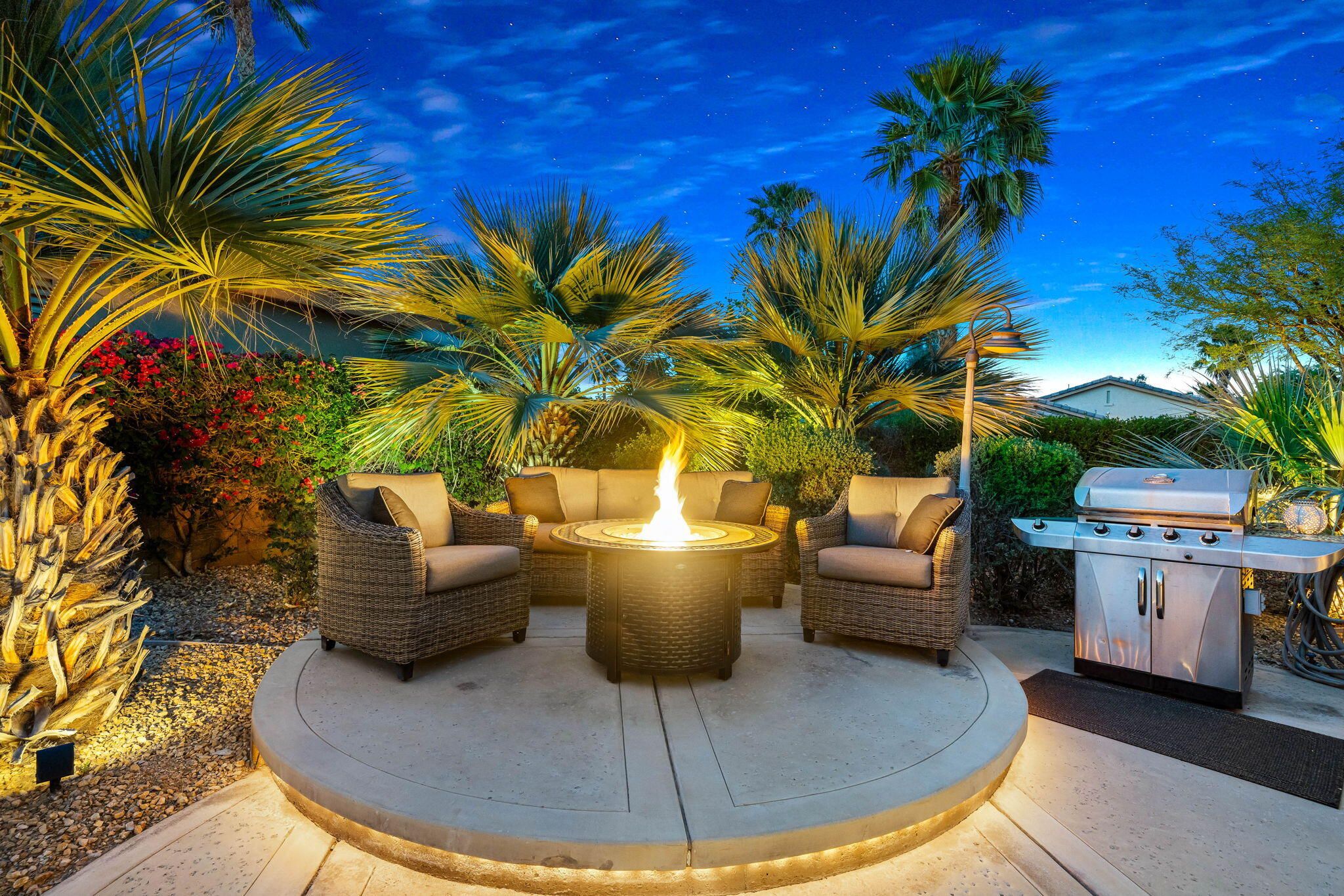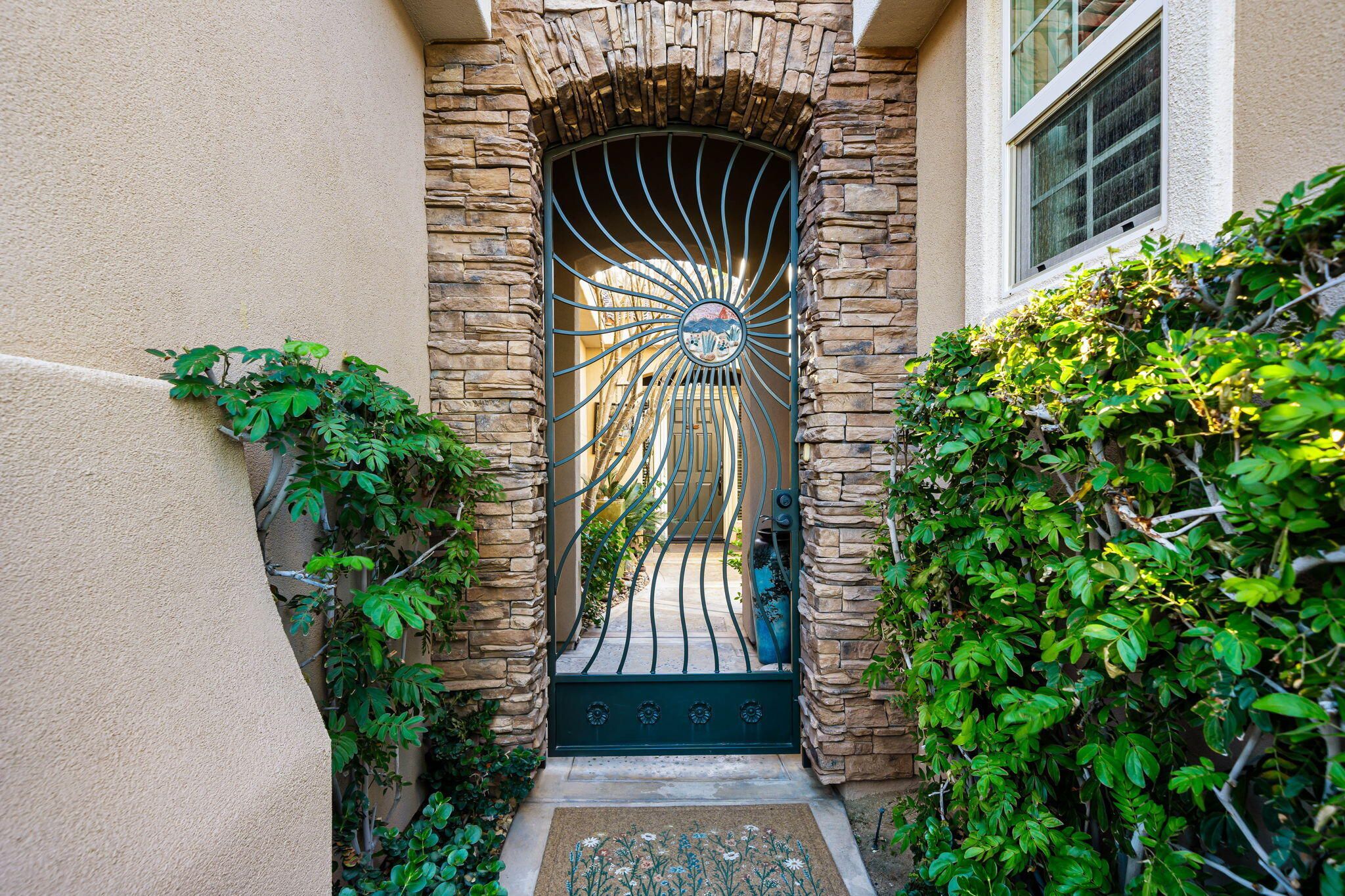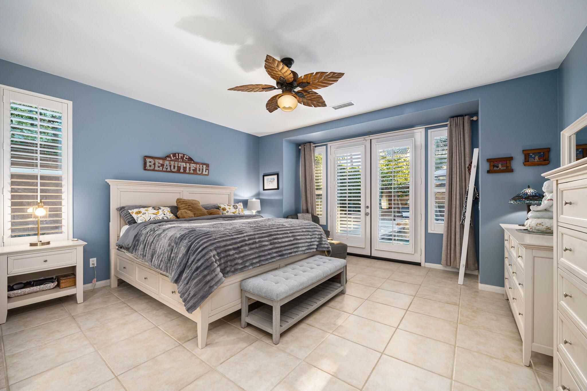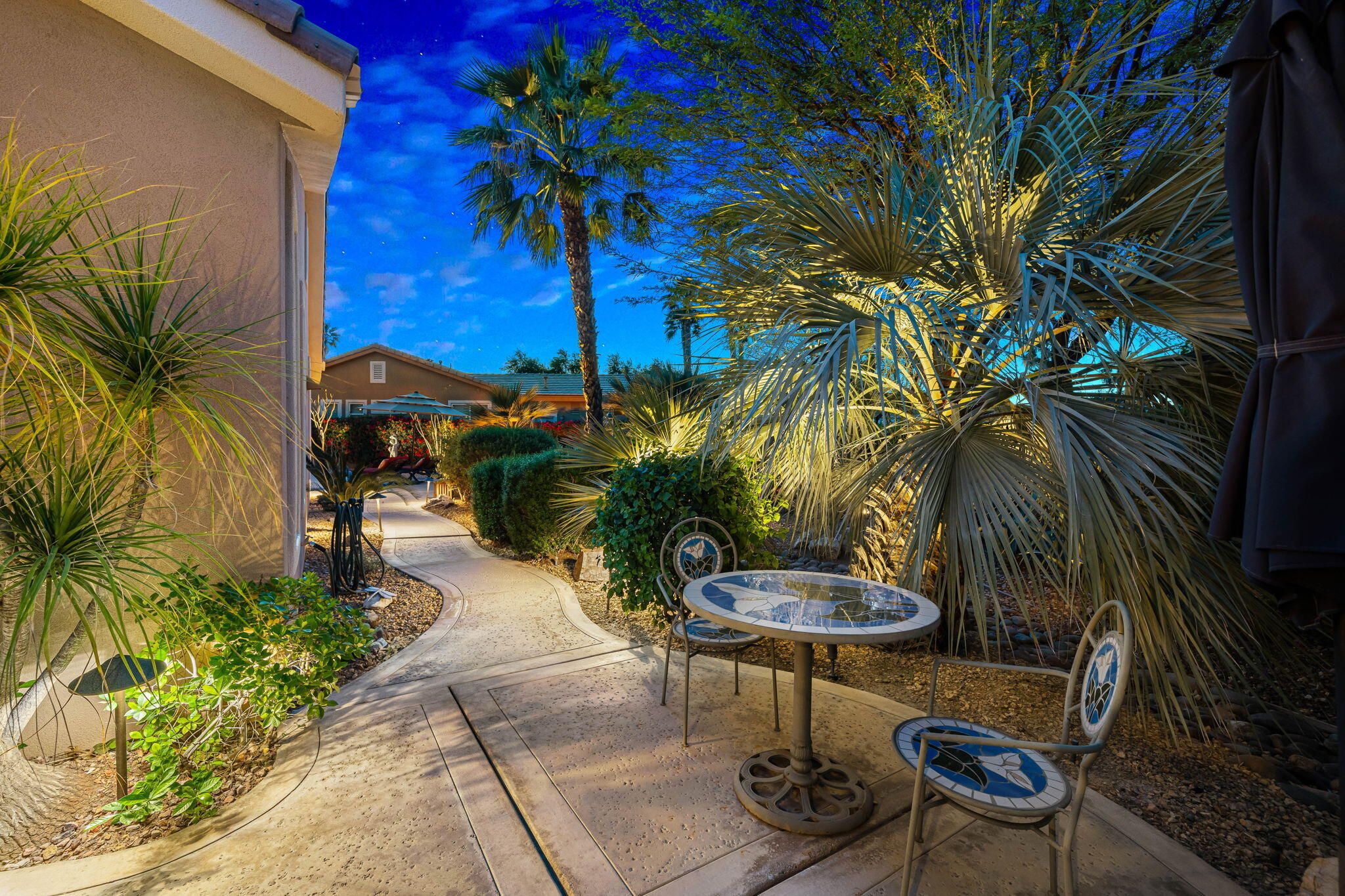 This sought-after Monterey residence elevates desert living with a sprawling 14,375-sq-ft homesite, long private driveway, and unforgettable mountain and pool vistas. Inside, nearly 2,000 sq ft of airy, open-concept design welcomes you through a custom wrought-iron privacy gate into a charming front courtyard that gracefully winds toward the resort-style backyard. A detached casita--with its own cabinetry, sink, and full bath--adds incredible flexibility for guests or creative use. The den/office/optional fourth bedroom, complete with French doors to the courtyard, expands the home's versatility even further. The great room impresses with a built-in media center and elegant tile-surround fireplace, while the adjacent chef's kitchen shines with a generous prep island, bar seating, pendant lighting, stainless appliances, double ovens, slab granite, custom backsplash, gas cooktop, and walk-in pantry. Step outside to your private tropical escape featuring lush landscaping, a Pebble Tec pool with dual water descents, fire pit, awning, multiple lounging areas, and sweeping panoramic views. The primary suite offers its own French-door access to the pool, plus custom shutters and a spa-inspired bath with dual vanities, a spacious shower, and walk-in closet. A rare La Quinta gem--schedule your private tour and experience the lifestyle for yourself.