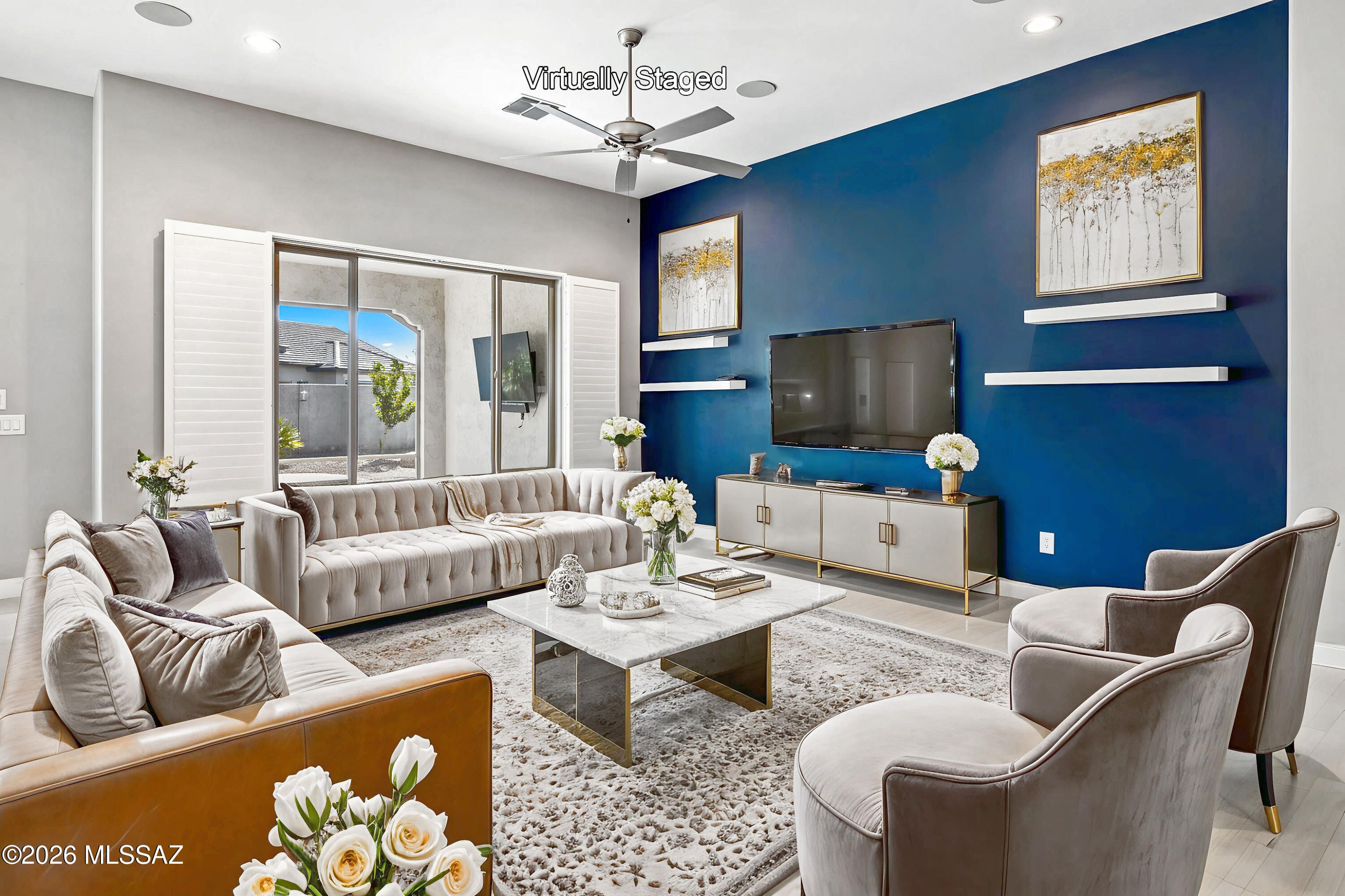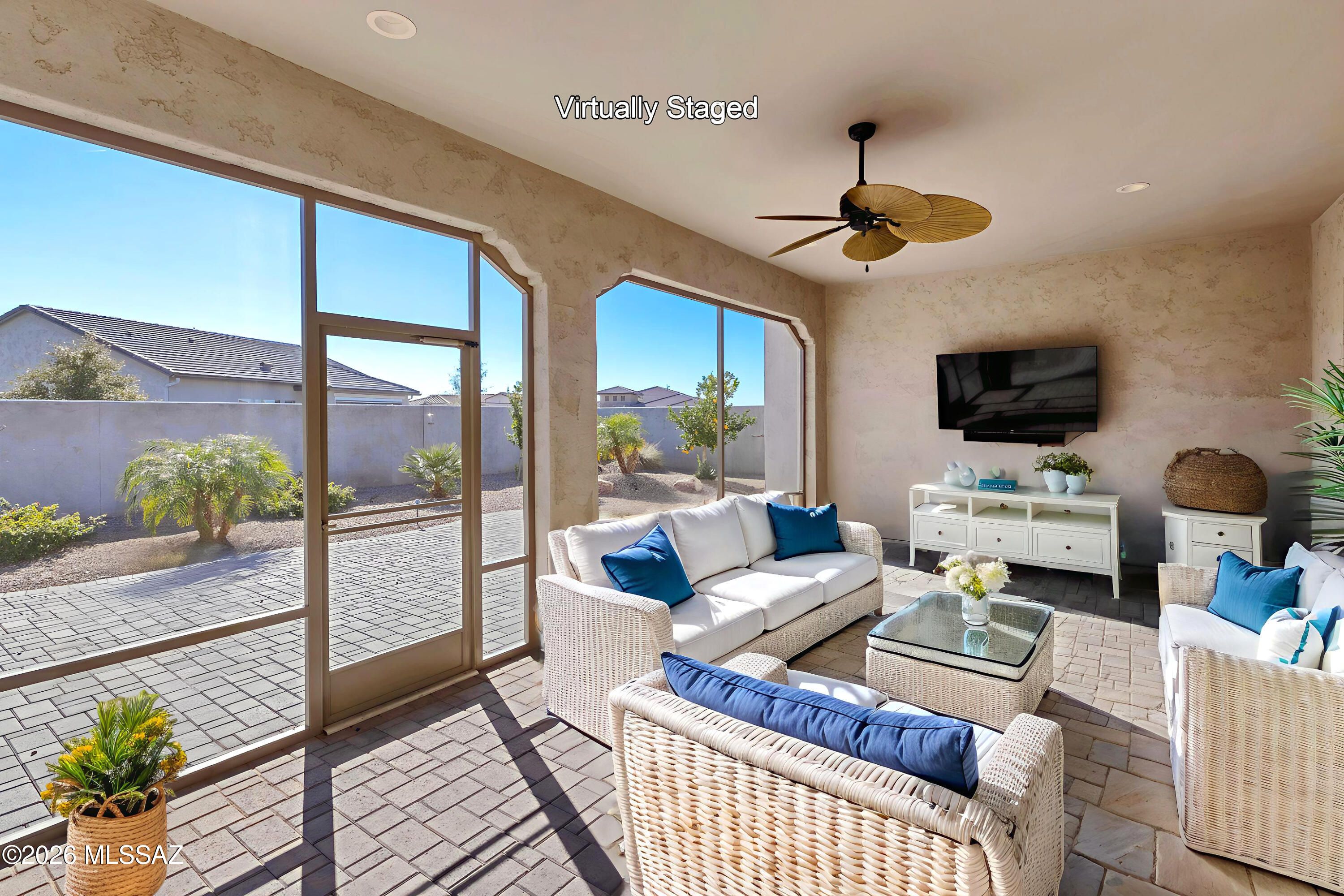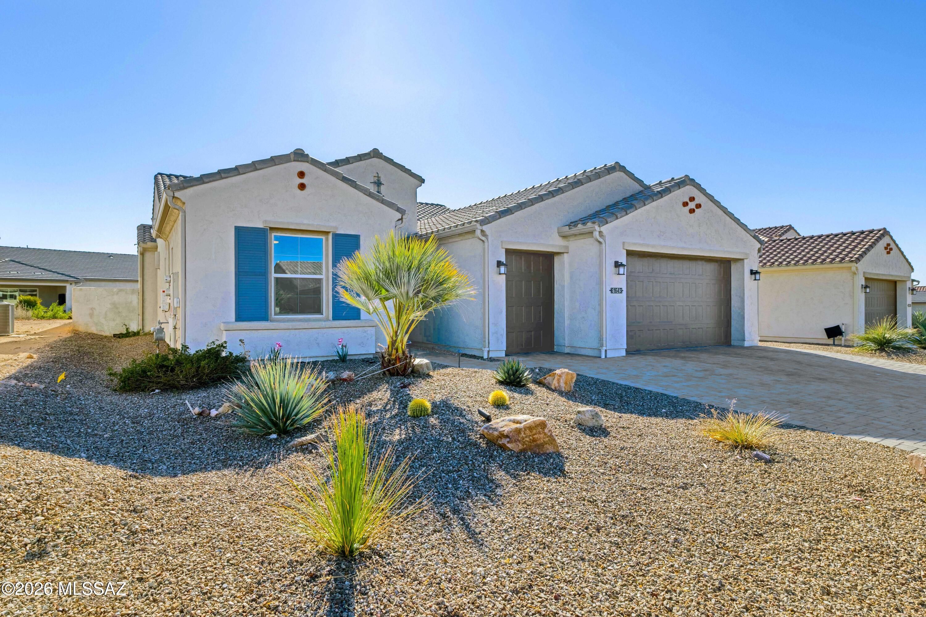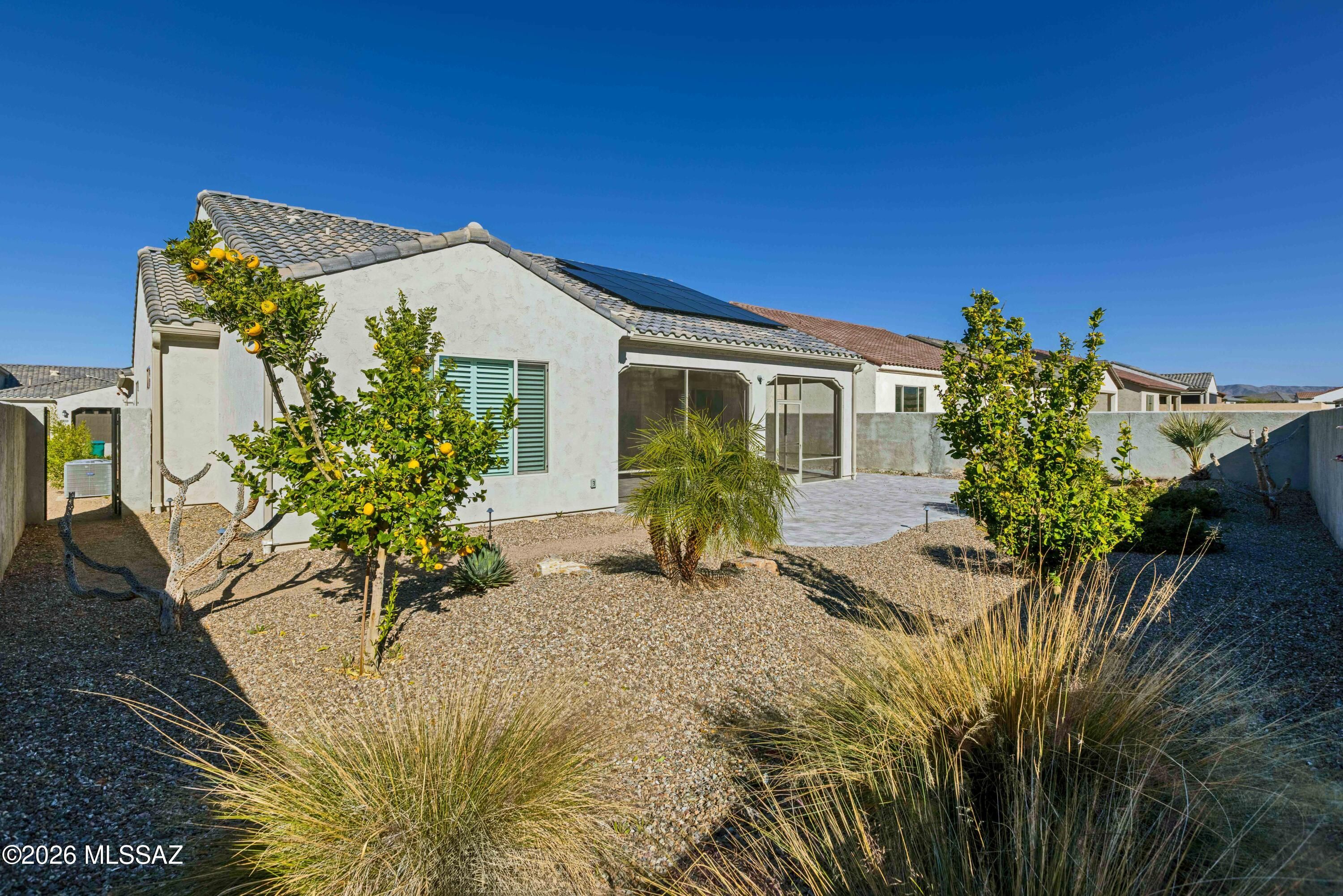 Experience sustainable luxury in this stunning 2022 Alora model at SaddleBrooke Ranch! This energy-efficient gem features a leased solar system with NO monthly fees. The home boasts every structural extension available: master suite, dining area, den, and garage. The gourmet chef's kitchen is a showstopper with 42'' soft-close cabinetry, quartz counters, and custom pull-outs. High-end finishes include rare solid core doors, a tankless water heater, and whisper-quiet fans. The epoxy-floored garage features a dedicated golf cart bay and workbench. Relax in the screened-in porch or the backyard oasis with mature fruit trees. Why buy new when you can have all of this? Move-in ready perfection with premium upgrades and mature landscaping that new construction can't match!