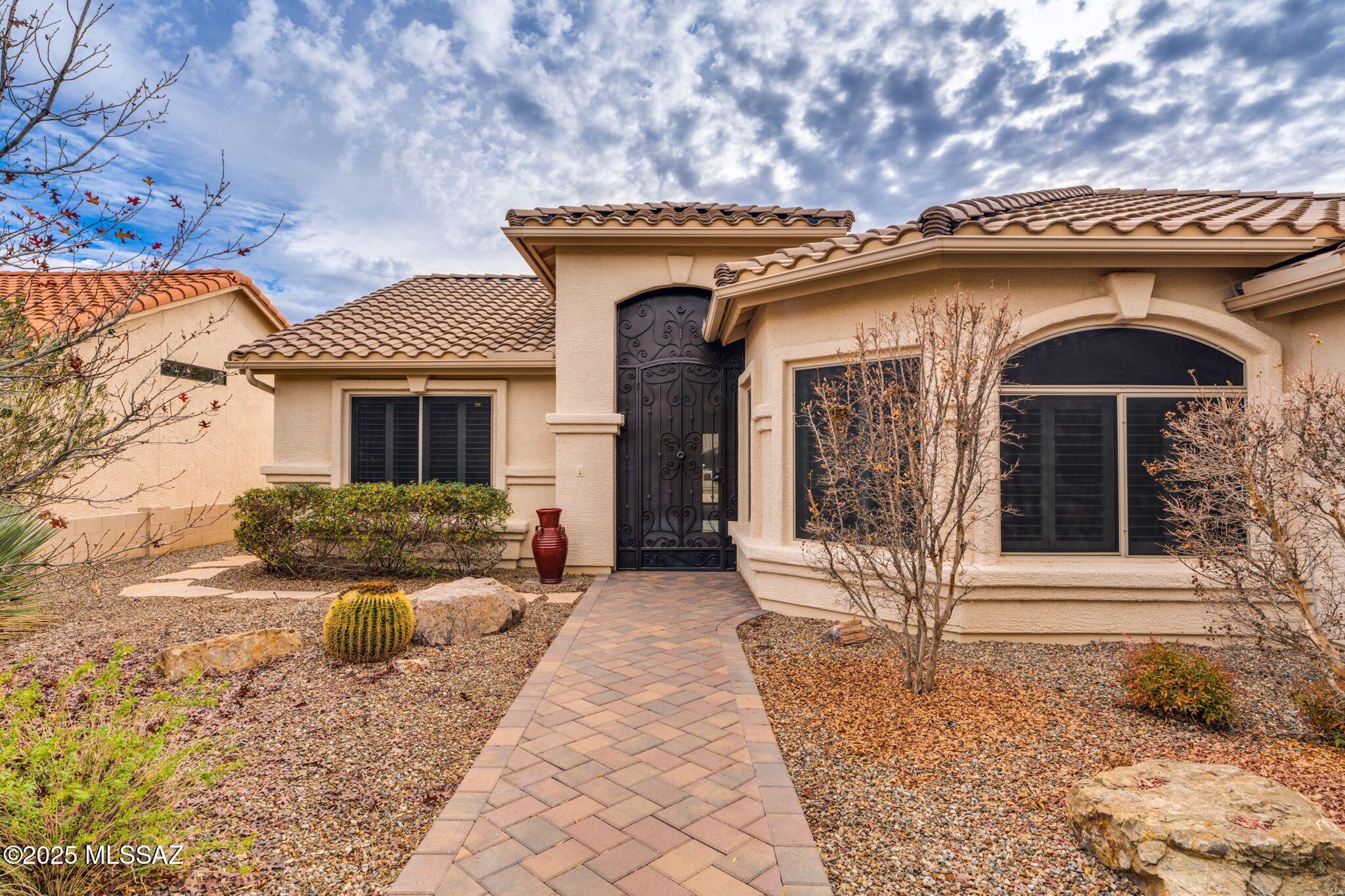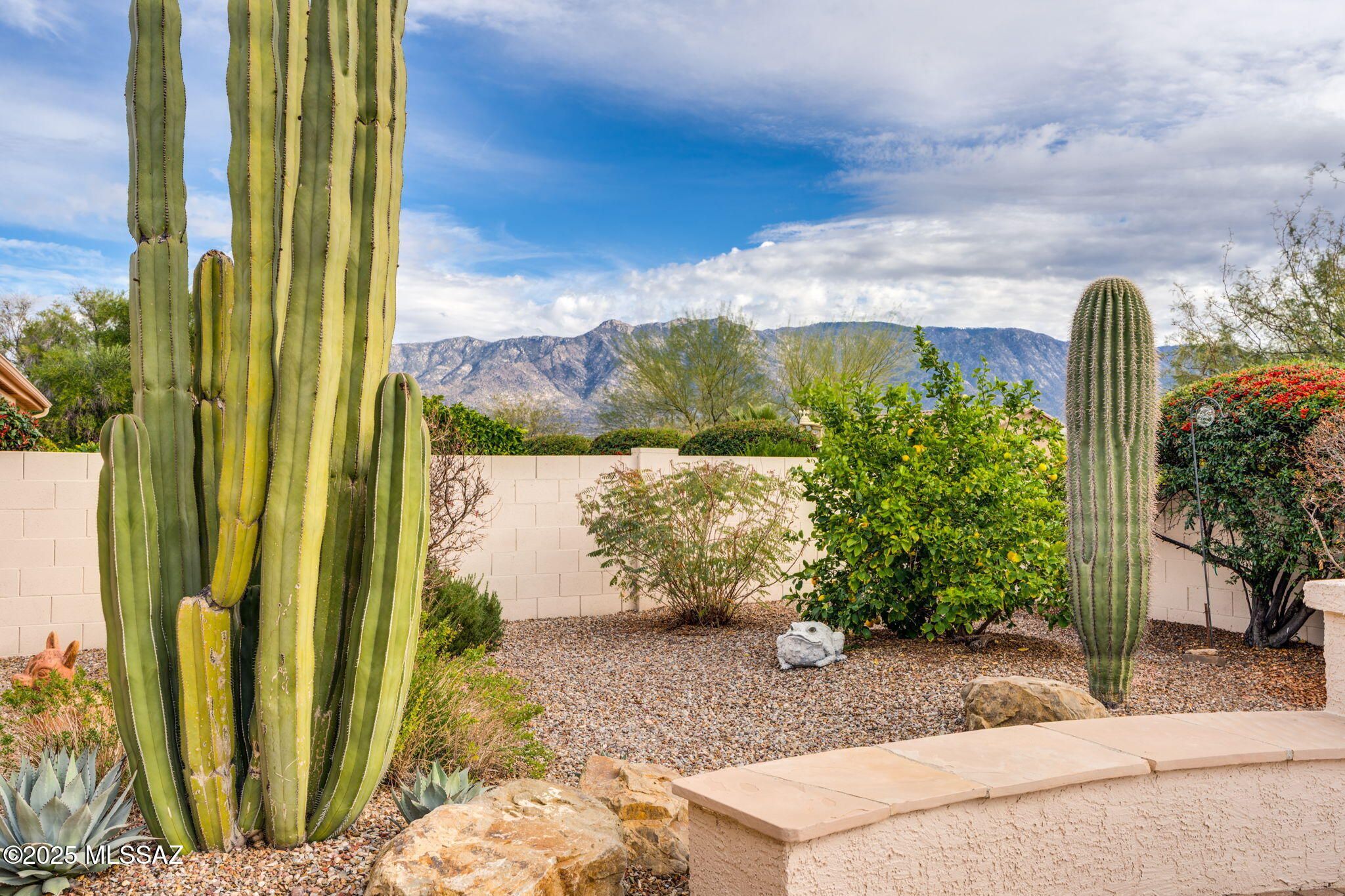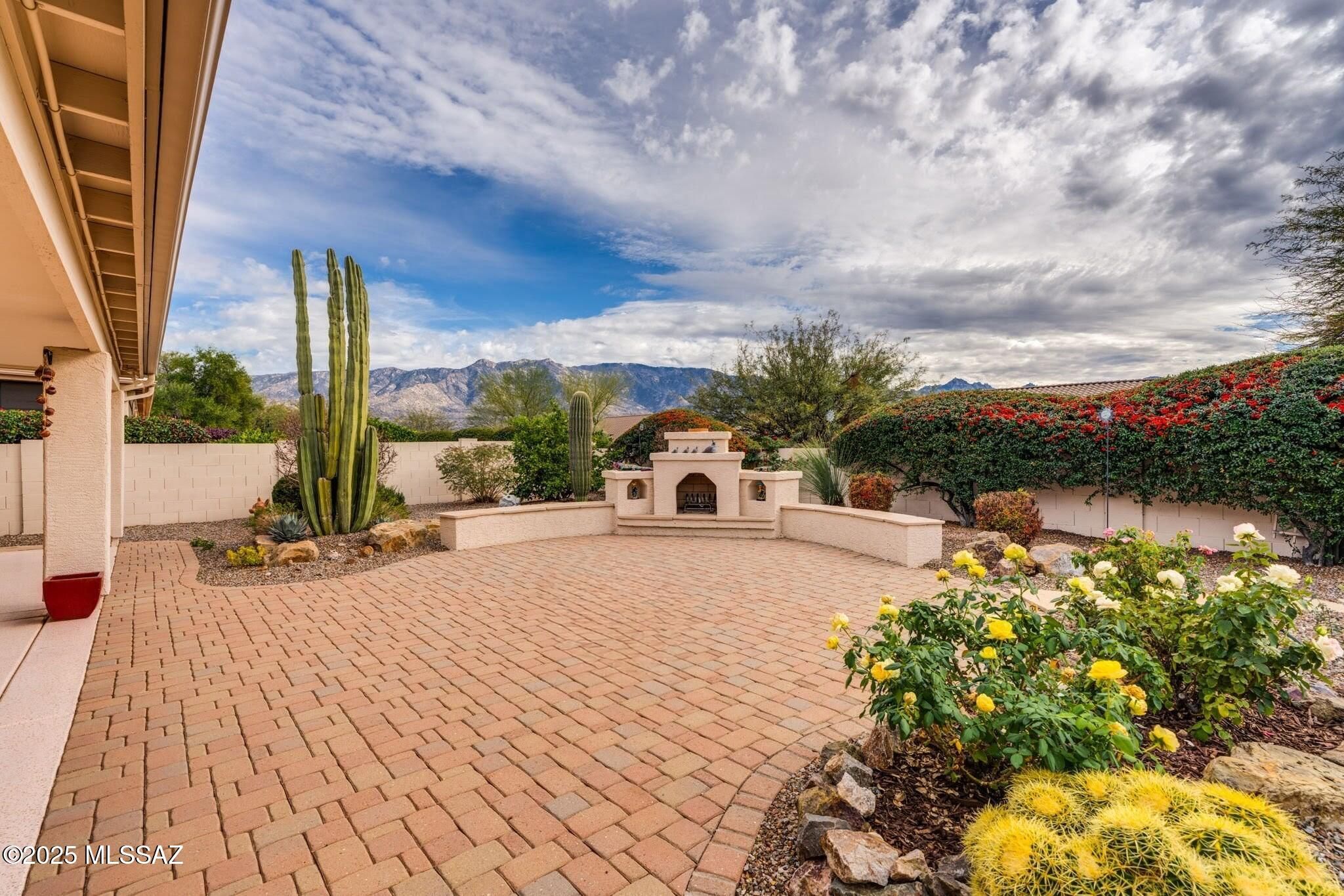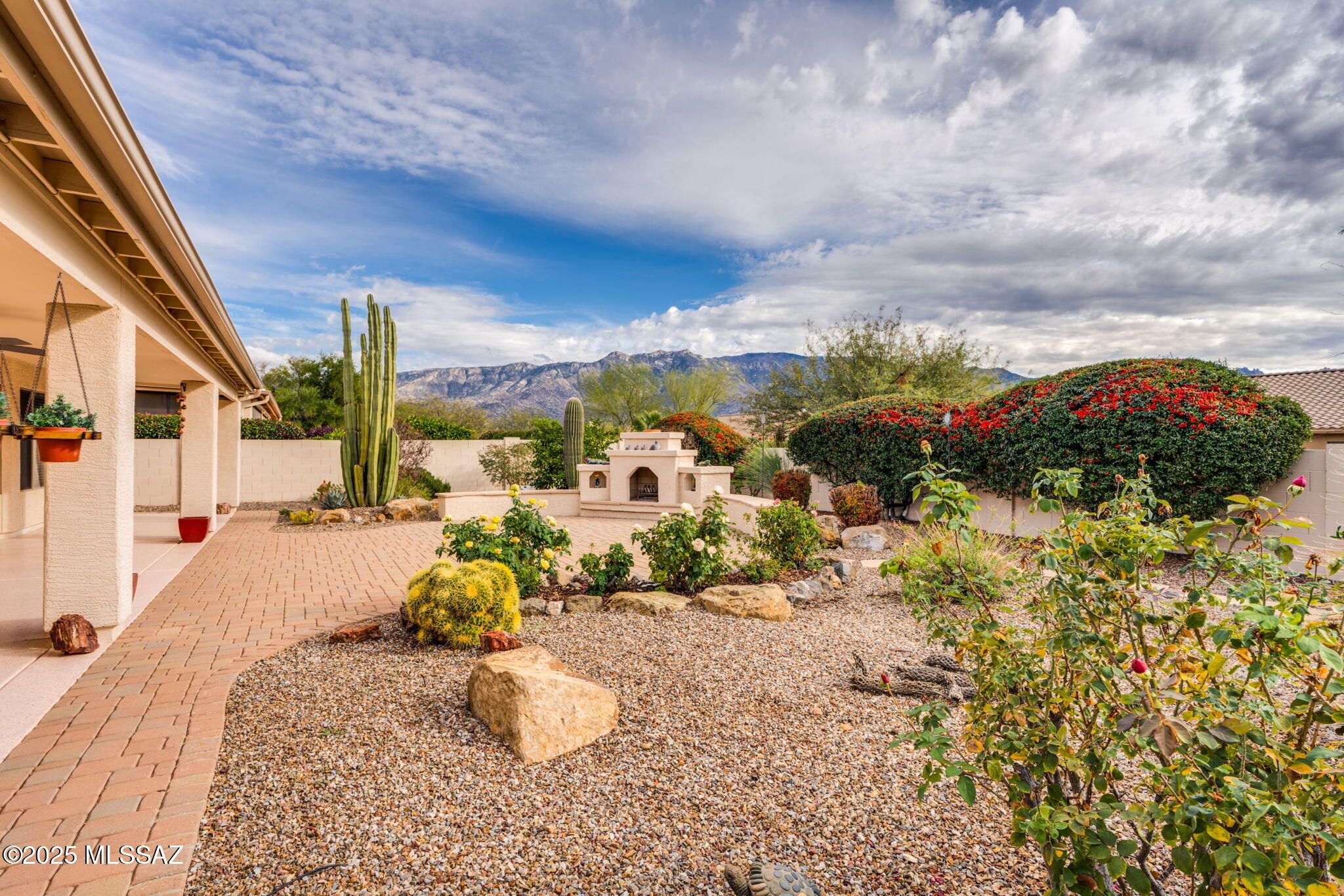 Spectacular 3BD/2BA (1,976 sq ft) Extended Laredo Model with Catalina Mountain Views in SaddleBrooke Active Adult Community. Fabulous SE facing yard offers an extended covered patio, outer paver patio with Kiva fireplace flanked by banco seating, flowering shrubs & citrus trees plus awe inspiring views. Gated front porch flows to an open concept plan w/ soaring vaulted ceilings & art/media wall. Extended Chef's kitchen hosts Silestone counters, maple cabinets w/ undercabinet lighting, center island & spacious breakfast nook w/ plantation shutters. Private Owner's Suite with bay window views hosts dual sink vanity, walk-in shower, custom walk-in closet. Front guest room has Cherrywood Murphy bed. Rear bedroom has bay window views. Garage widened 2 ft, extended 4 ft. A true desert retreat.