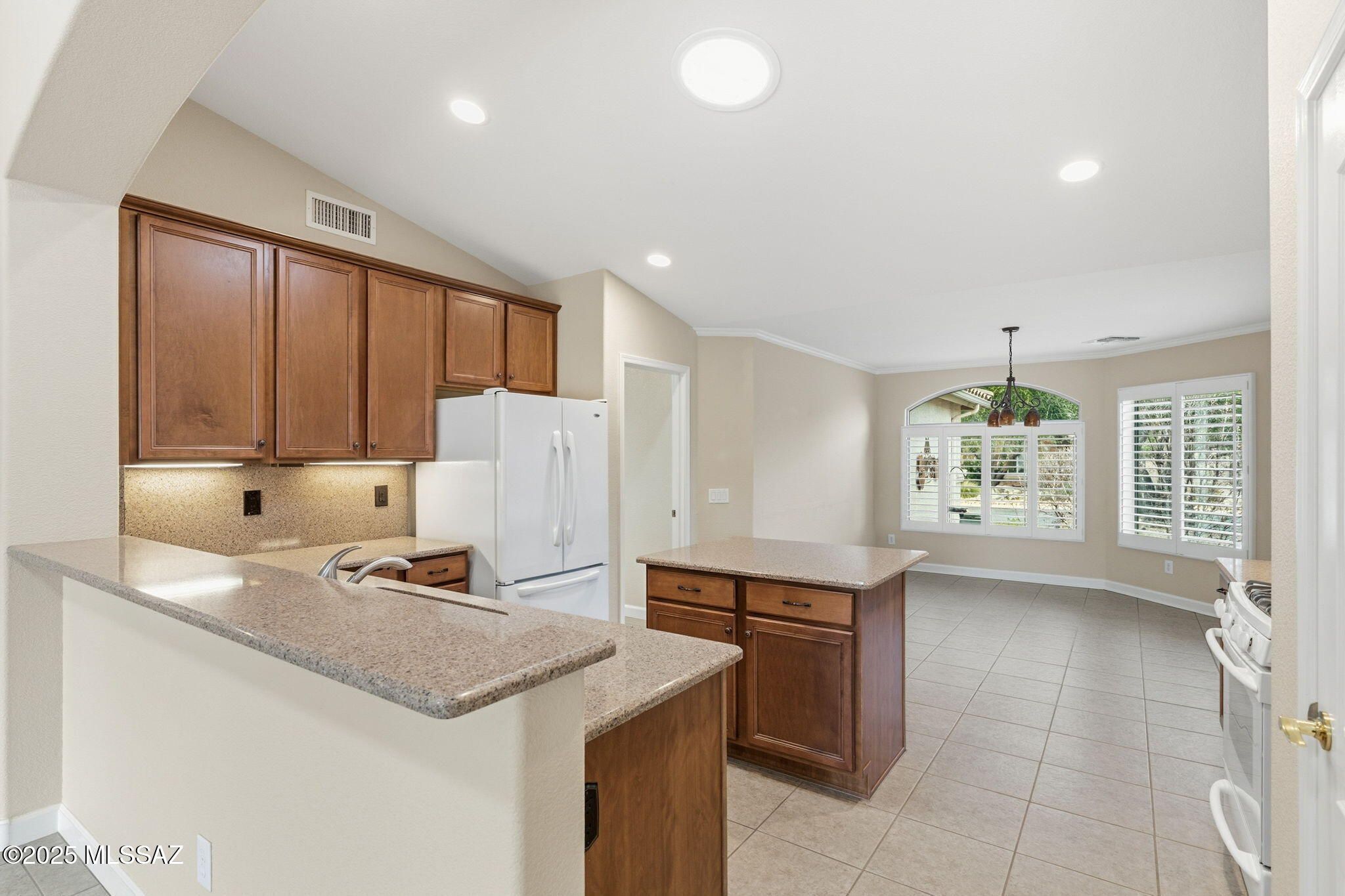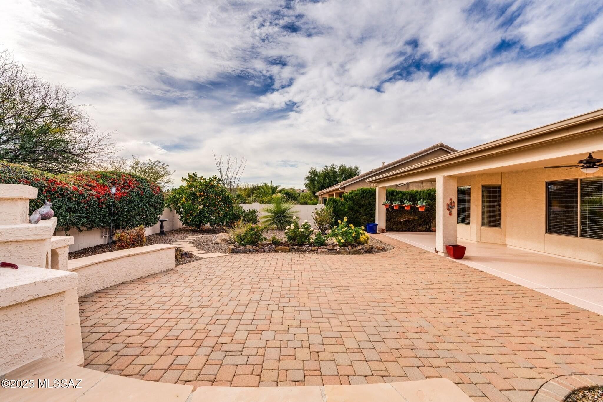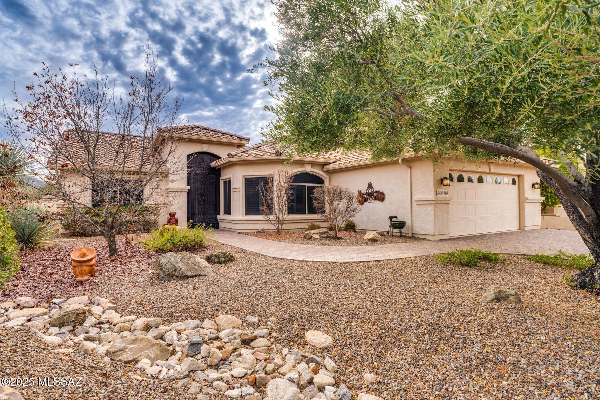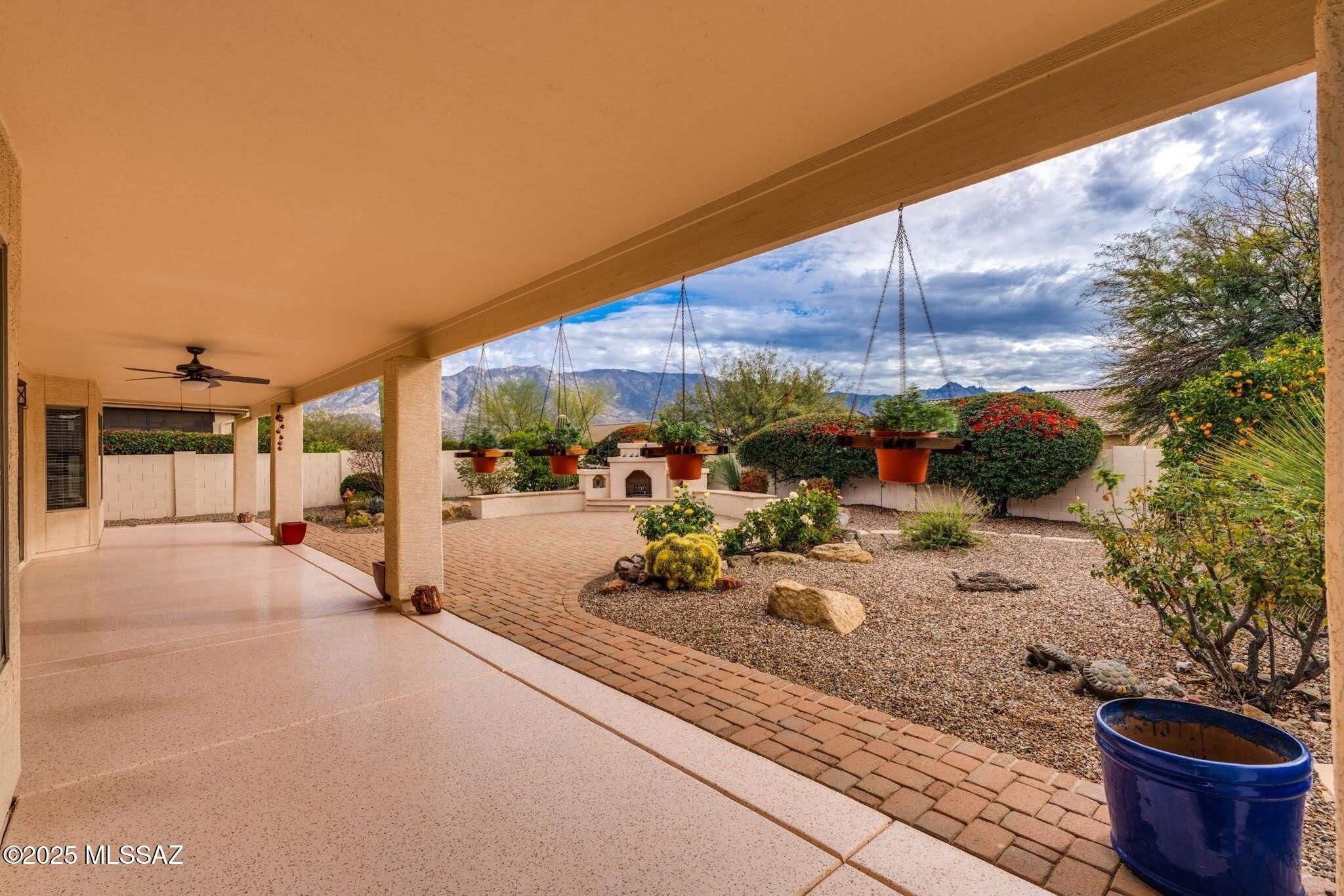 Spectacular 3BD/2BA (1,976 sq ft) Extended Laredo Model with Catalina Mountain Views in SaddleBrooke Active Adult Community. Fabulous SE facing yard offers an extended covered patio, outer paver patio with Kiva fireplace flanked by banco seating, flowering shrubs & citrus trees plus awe inspiring views. Gated front porch flows to an open concept plan w/ soaring vaulted ceilings & art/media wall. Extended Chef's kitchen hosts Silestone counters, maple cabinets w/ undercabinet lighting, center island & spacious breakfast nook w/ plantation shutters. Private Owner's Suite with bay window views hosts dual sink vanity, walk-in shower, custom walk-in closet. Front guest room has Cherrywood Murphy bed. Rear bedroom has bay window views. Garage widened 2 ft, extended 4 ft. A true desert retreat.