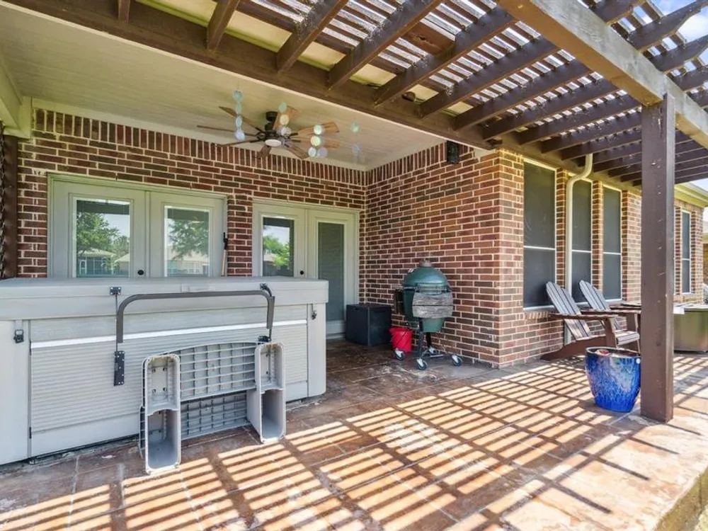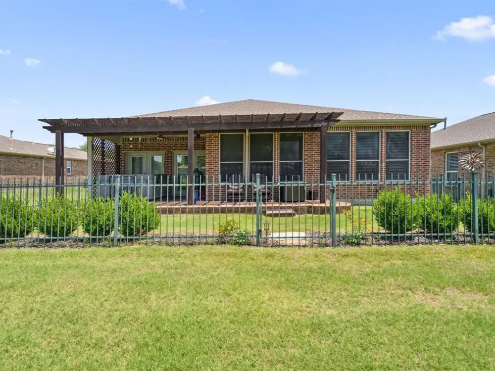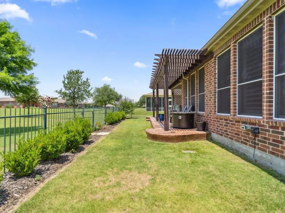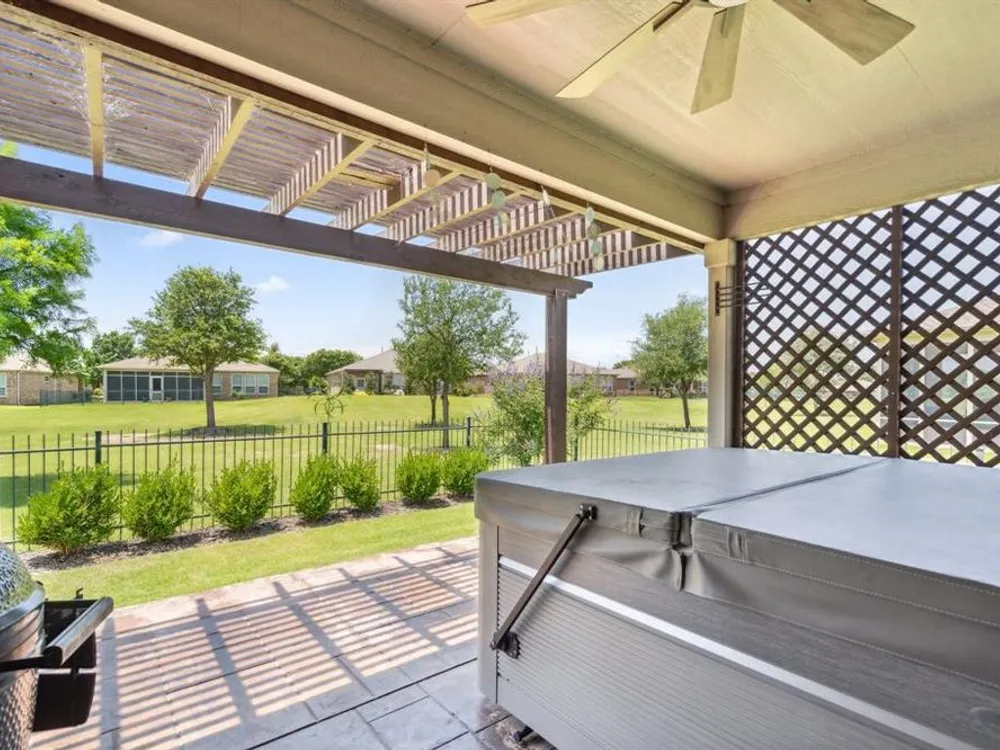 Immaculate and updated, this home is ready for its next owners! The well maintained entry beckons you in to the open kitchen, dining area and spacious living room. It's easily an entertainers dream but also perfect for cozy nights in. French doors elegantly open to the ample sized office. The generous bedrooms and baths are split, allowing for privacy in the primary suite and for guests. The extended back covered patio comes complete with a relaxing and therapeutic hot tub. The yard is fully fenced in and you are just steps to Lake Lewisville and walking trails. The gorgeous plantation shutters adorn the windows but with great privacy you'll hardly need them. The sweeping greenbelt view beyond the fence provides open space and is tranquil with beautiful lawn and trees yet it's all maintained for you! With renovated bathrooms, fresh paint, and many more upgrades there's nothing to do but move-in and begin enjoying your new active resort lifestyle in this top-rated 55+ adult community. Home is sold with new washer and dryer plus refrigerator and hot tub!