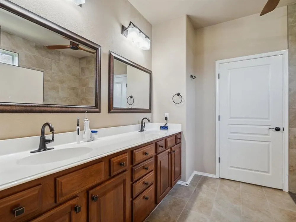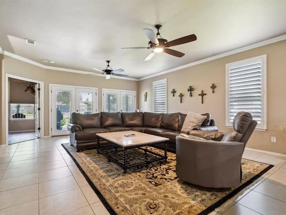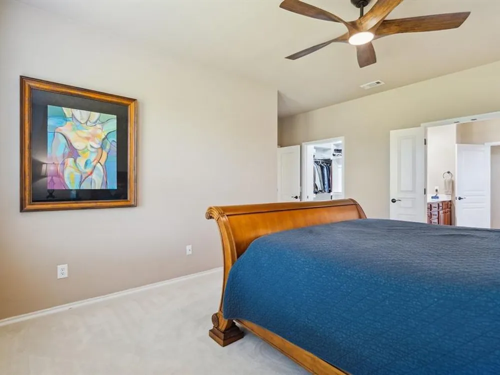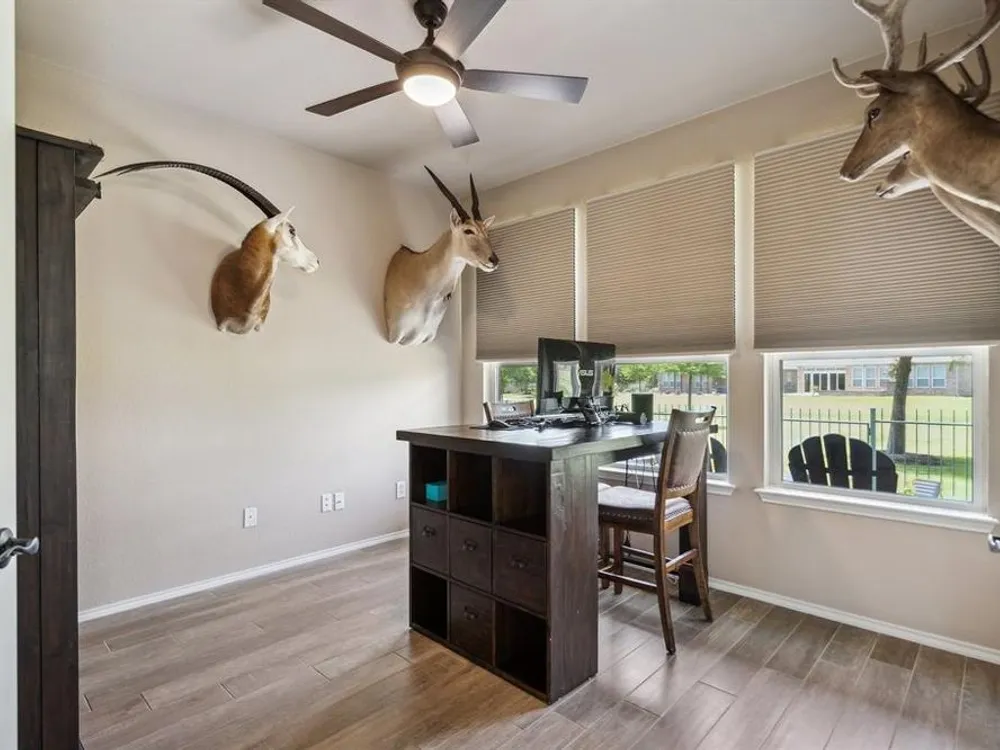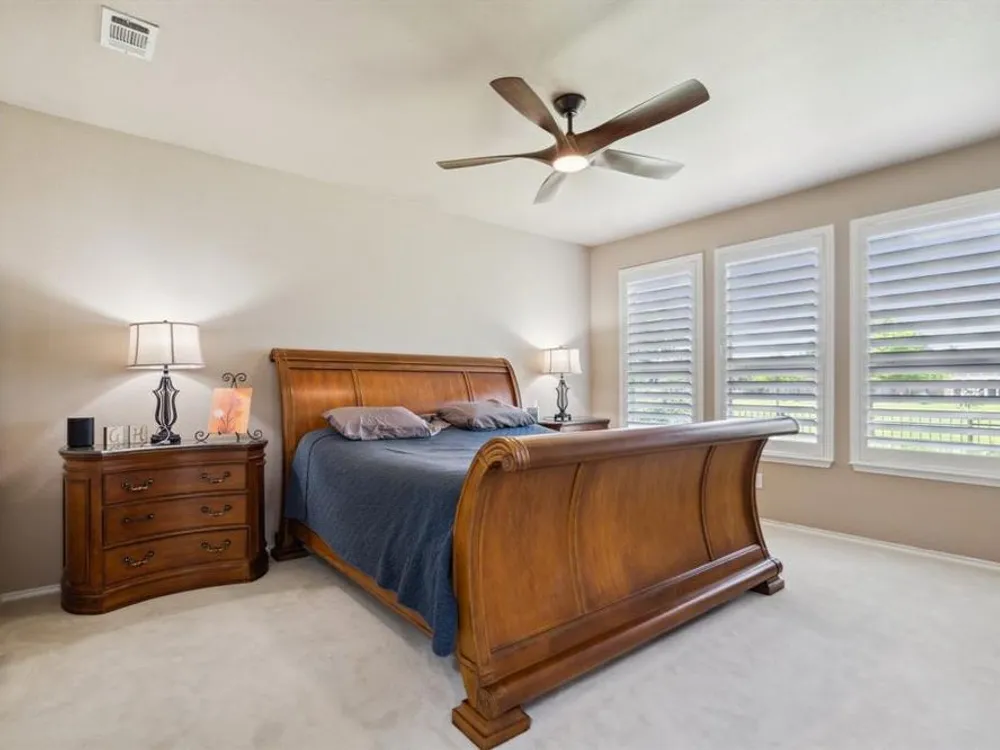 Immaculate and updated, this home is ready for its next owners! The well maintained entry beckons you in to the open kitchen, dining area and spacious living room. It's easily an entertainers dream but also perfect for cozy nights in. French doors elegantly open to the ample sized office. The generous bedrooms and baths are split, allowing for privacy in the primary suite and for guests. The extended back covered patio comes complete with a relaxing and therapeutic hot tub. The yard is fully fenced in and you are just steps to Lake Lewisville and walking trails. The gorgeous plantation shutters adorn the windows but with great privacy you'll hardly need them. The sweeping greenbelt view beyond the fence provides open space and is tranquil with beautiful lawn and trees yet it's all maintained for you! With renovated bathrooms, fresh paint, and many more upgrades there's nothing to do but move-in and begin enjoying your new active resort lifestyle in this top-rated 55+ adult community. Home is sold with new washer and dryer plus refrigerator and hot tub!