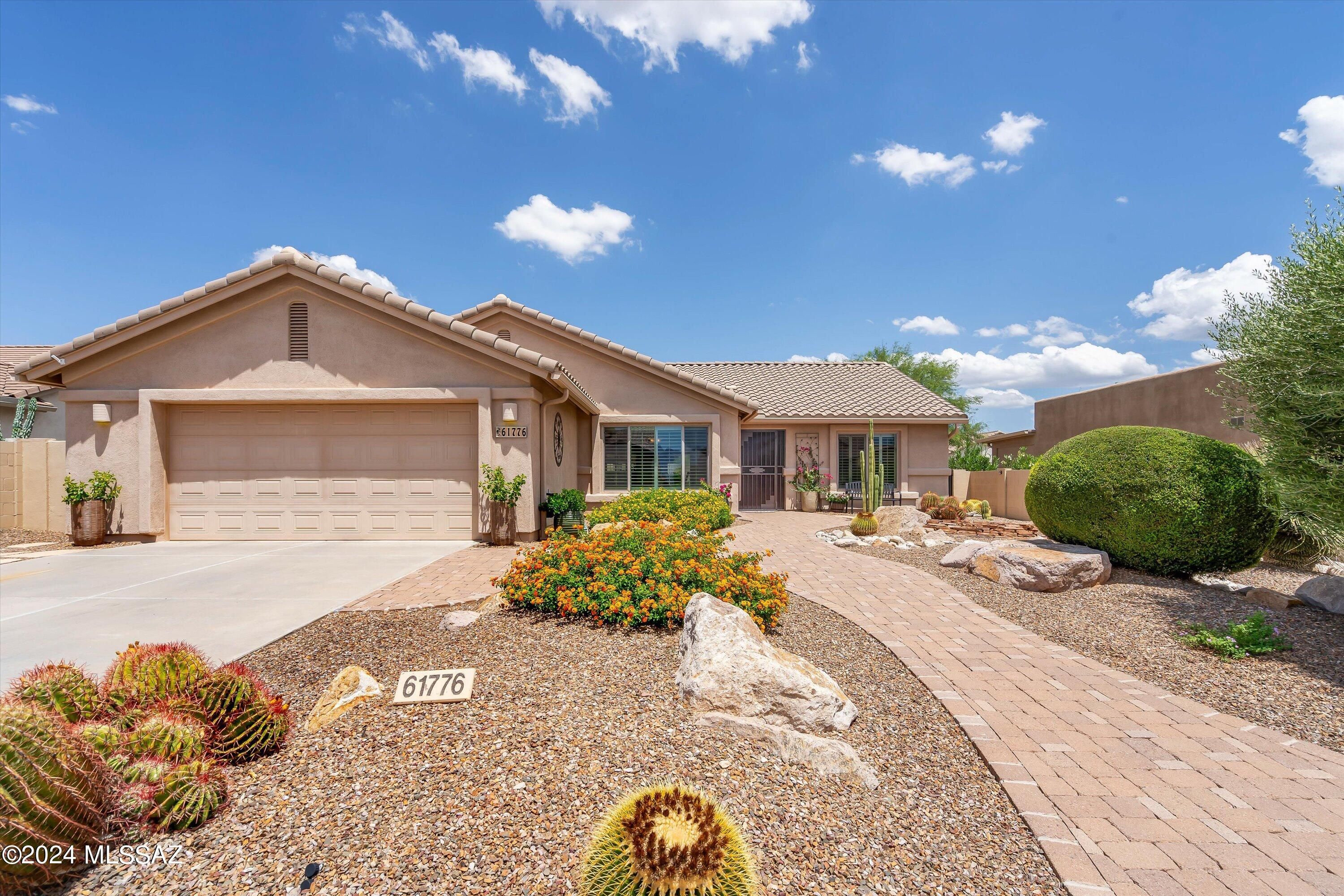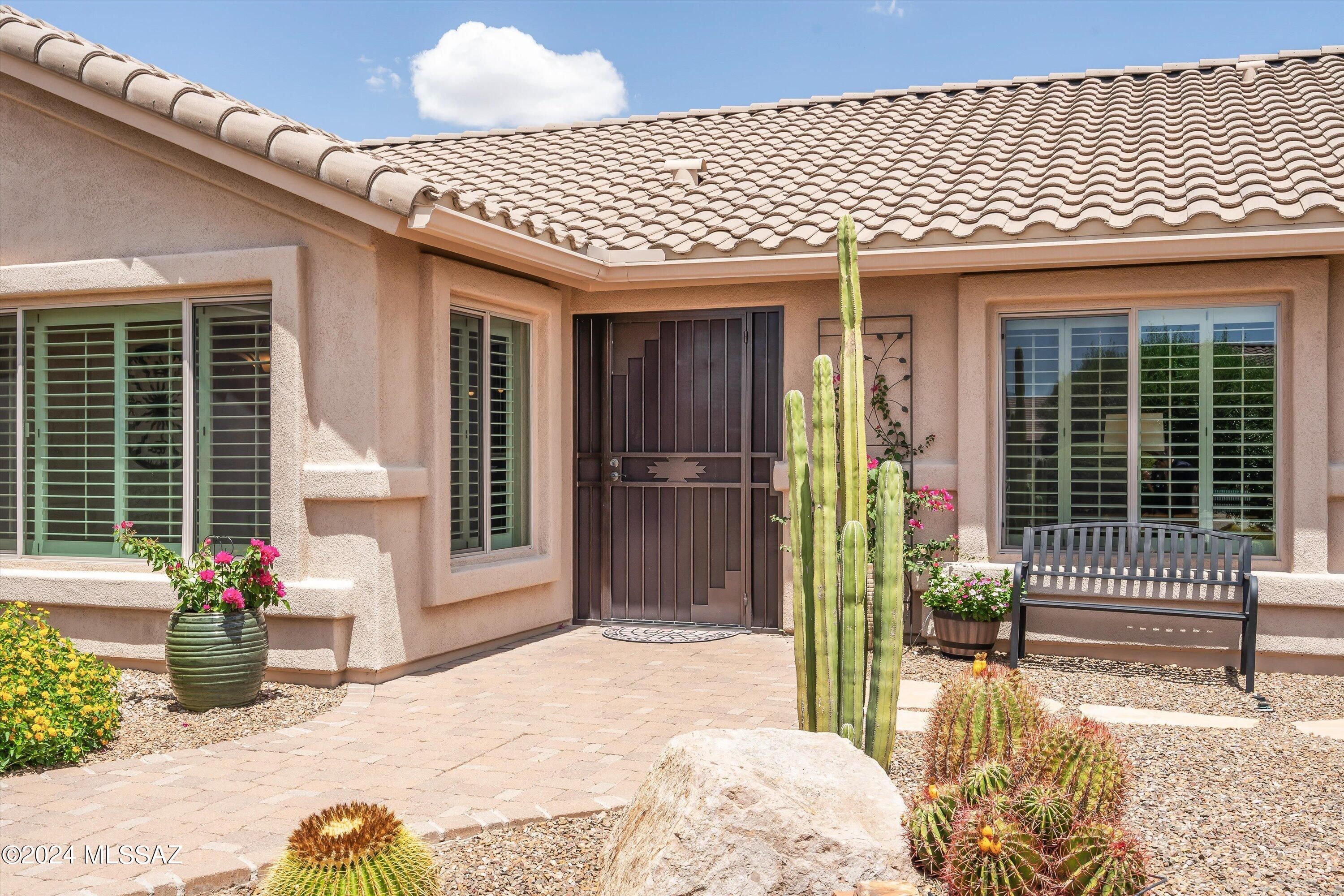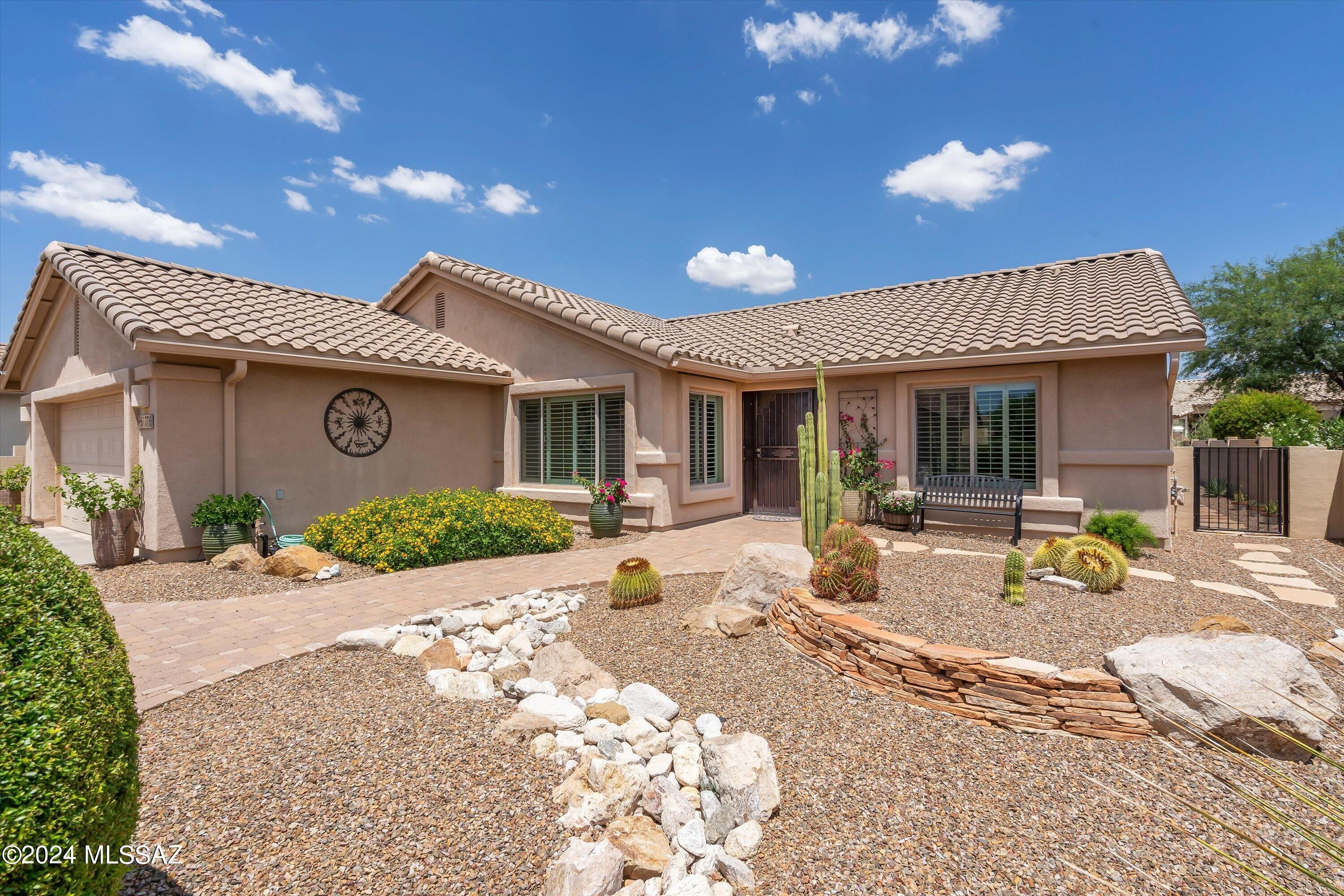 Lovely 2BD/2BA +Den (1,912 sq ft) popular Expanded Laredo floorplan with Mountain Views. Home has custom entry security doors, ceramic tile floors throughout, plantation shutters, & vaulted ceilings. Kitchen has breakfast bar, beautiful Quartz counters, sleek black appliances, & large breakfast nook w/bay window. Large great room encompasses spacious living/dining. Oversized primary bedroom has ensuite bath with walk-in shower and closet. Additional guest bedroom and den are near full hall bath. Laundry room, off garage with Epoxy coating, has added storage and extra counter space. Meticulously maintained, this home is in the sough-after SaddleBrooke (55+) Active Adult Community offering clubhouse, restaurant, fitness center, championship golf course, multiple sport courts and more!