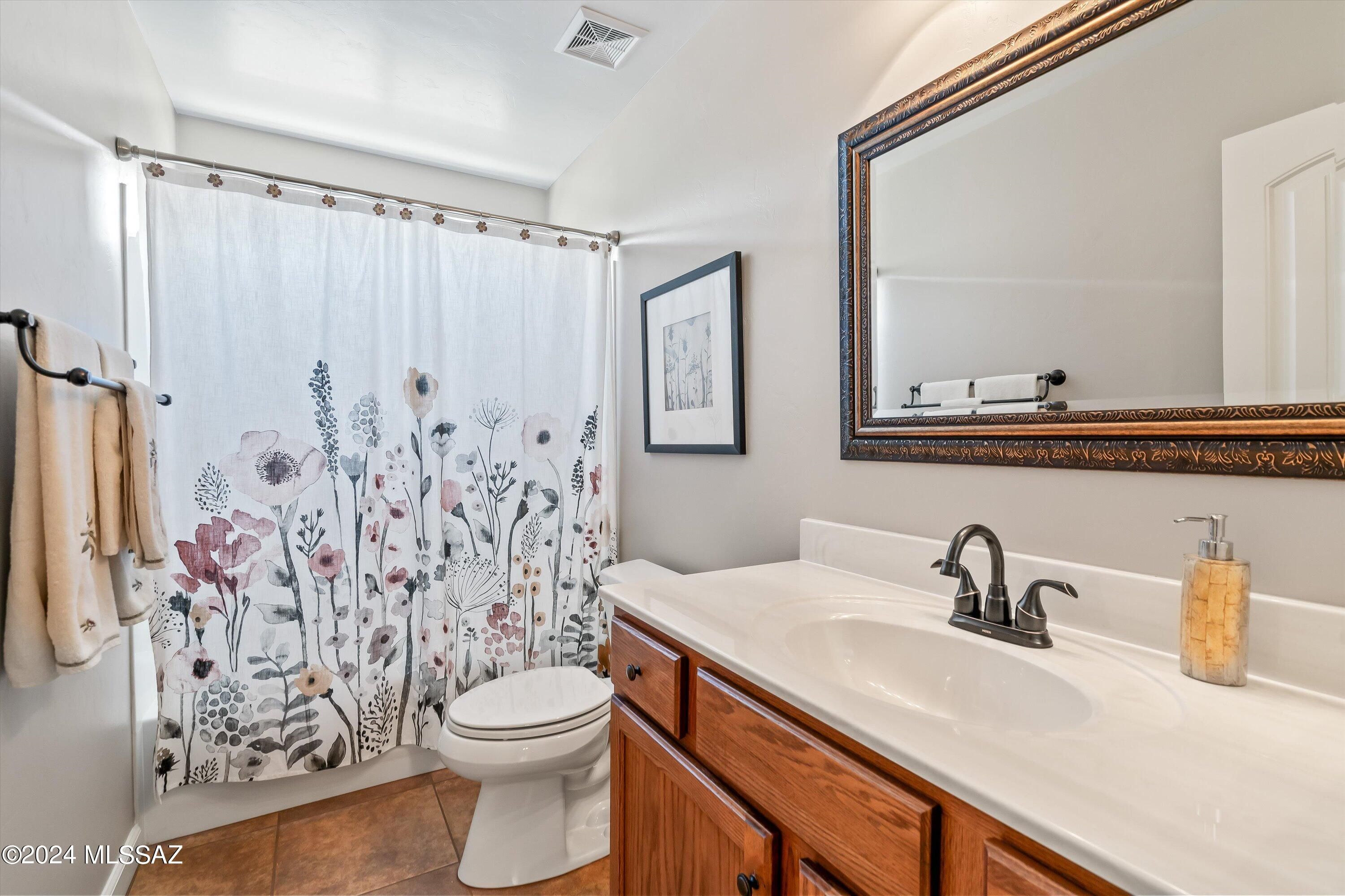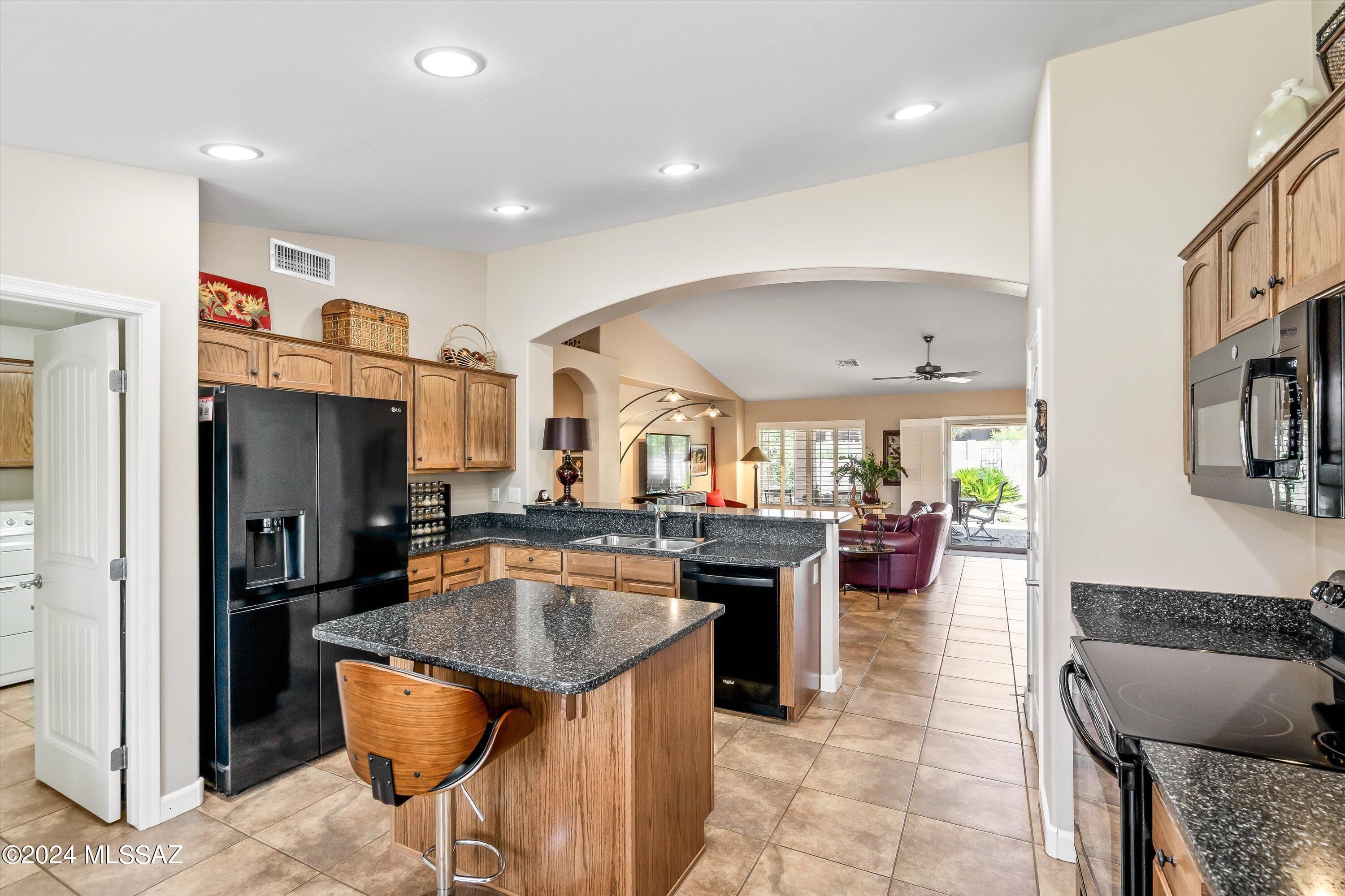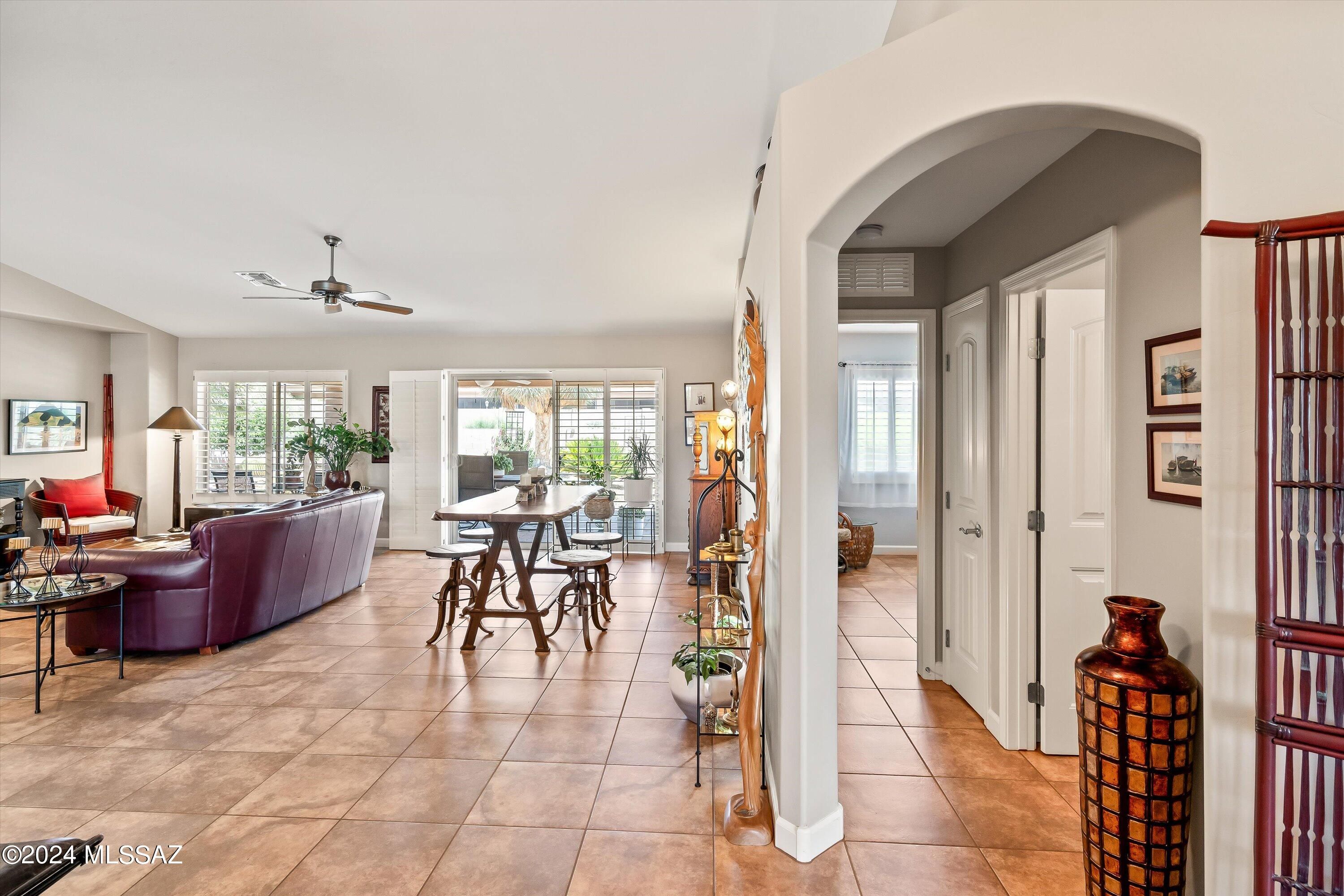 Lovely 2BD/2BA +Den (1,912 sq ft) popular Expanded Laredo floorplan with Mountain Views. Home has custom entry security doors, ceramic tile floors throughout, plantation shutters, & vaulted ceilings. Kitchen has breakfast bar, beautiful Quartz counters, sleek black appliances, & large breakfast nook w/bay window. Large great room encompasses spacious living/dining. Oversized primary bedroom has ensuite bath with walk-in shower and closet. Additional guest bedroom and den are near full hall bath. Laundry room, off garage with Epoxy coating, has added storage and extra counter space. Meticulously maintained, this home is in the sough-after SaddleBrooke (55+) Active Adult Community offering clubhouse, restaurant, fitness center, championship golf course, multiple sport courts and more!