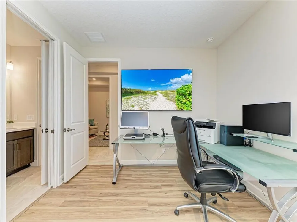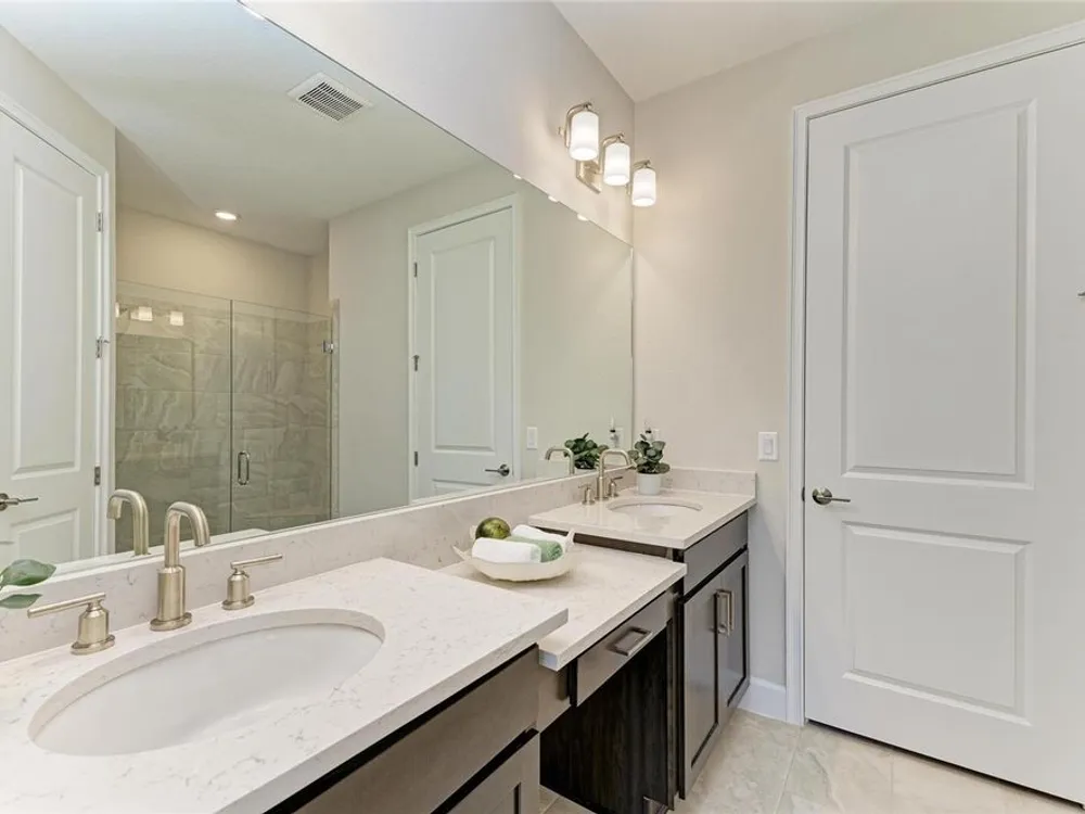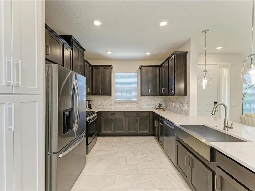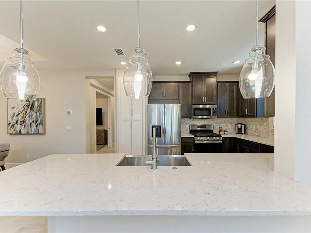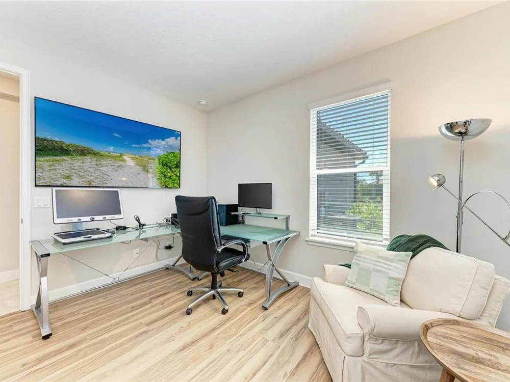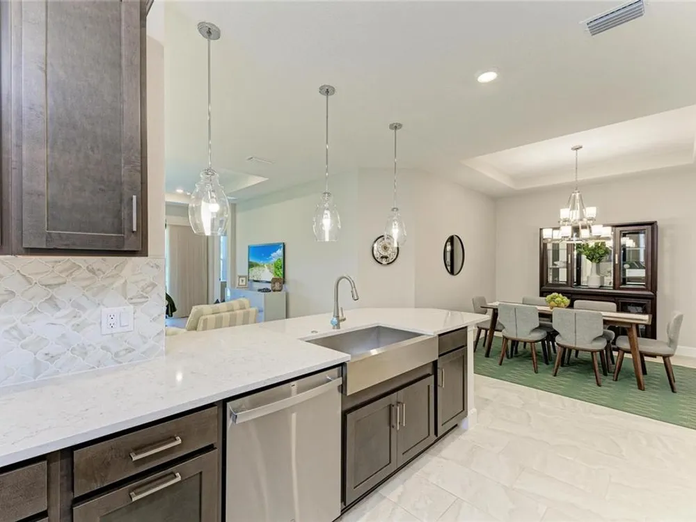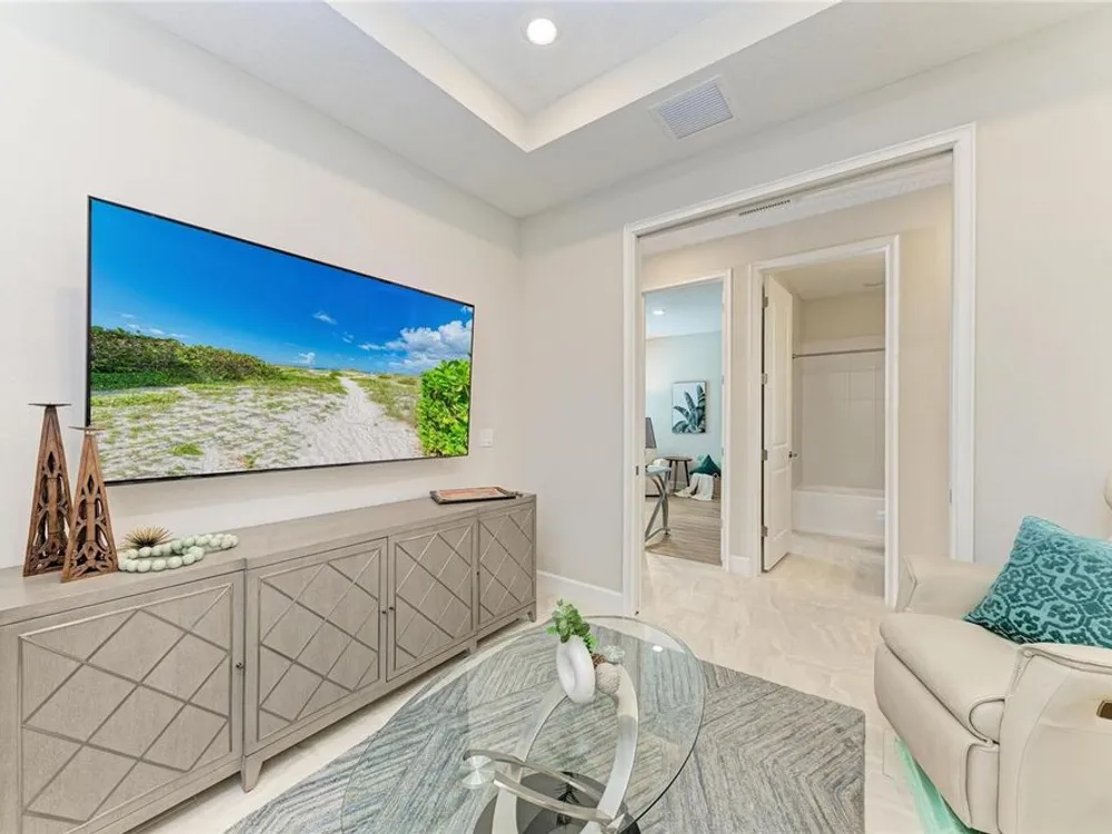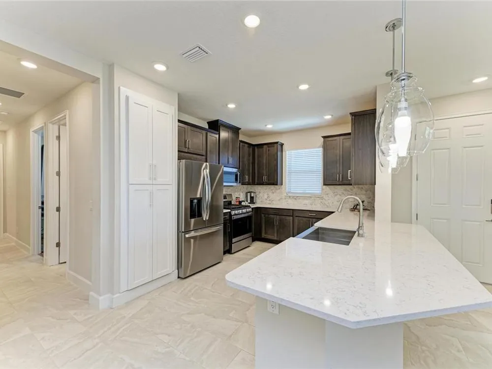 Embrace the best of Florida living in this beautifully crafted 2024-built villa, where timeless design and everyday comfort come together in the desirable, maintenance-free community of Esplanade at The Heights. Nestled within a gated neighborhood offering resort-inspired amenities and an unbeatable location, this popular Ibis twin villa by Taylor Morrison impresses with two bedrooms, two bathrooms, and a versatile study/den that can easily serve as a third bedroom. Thoughtfully selected upgrades throughout add comfort, sophistication, and functionality. For peace of mind, impact-resistant windows and sliding glass doors offer energy efficiency, a quiet interior, and protection without the need for storm shutters—perfect for seasonal residents or full-time homeowners alike. The Gathering Room welcomes you with abundant natural light, an elegant tray ceiling with recessed lighting, and sliders that open to an extended screened-in lanai overlooking tranquil preserve views—a perfect spot for morning coffee or evening relaxation. The chef’s kitchen is a showstopper with natural gas cooking, a charming farmhouse sink, quartz countertops, customized pantry closet, and pull-out drawers—all illuminated by sunshine from a picturesque window. The adjacent dining area, complete with a tray ceiling and stylish chandelier, is ideal for hosting family and friends. The primary suite offers a serene retreat at the rear of the home, featuring a tray ceiling, laminate flooring, and a spa-like en-suite bath with a frameless glass shower and spacious walk-in closet. The guest bedroom, also with laminate flooring, includes a private en-suite bath and is conveniently located near the study/den, which boasts pocket doors and recessed lighting for privacy and versatility. Additional highlights include a well-appointed laundry room with a sink, storage cabinet, and newer washer and dryer units; 8-foot doors; smart home features; and chic pendant lighting over the breakfast bar. The two-car garage is equally impressive, featuring epoxy flooring and a reinforced storm-rated garage door. Life at Esplanade at The Heights is all about enjoying every day. The community’s clubhouse offers a full-service spa, fitness center, and on-site Lifestyle Manager who curates engaging events and social gatherings. Outdoor amenities include a resort-style heated pool, cabana, and lighted courts for tennis, pickleball, and bocce ball. Residents can also enjoy picturesque trails on Mount Tumalo, fitness stations, a Bark Park, and numerous clubs and activity groups. Perfectly located near top-rated schools, UTC shopping and dining, downtown Sarasota and Bradenton, I-75, and Gulf Coast beaches—and with no CDD fee—this home delivers the best of Florida’s relaxed, luxury lifestyle.