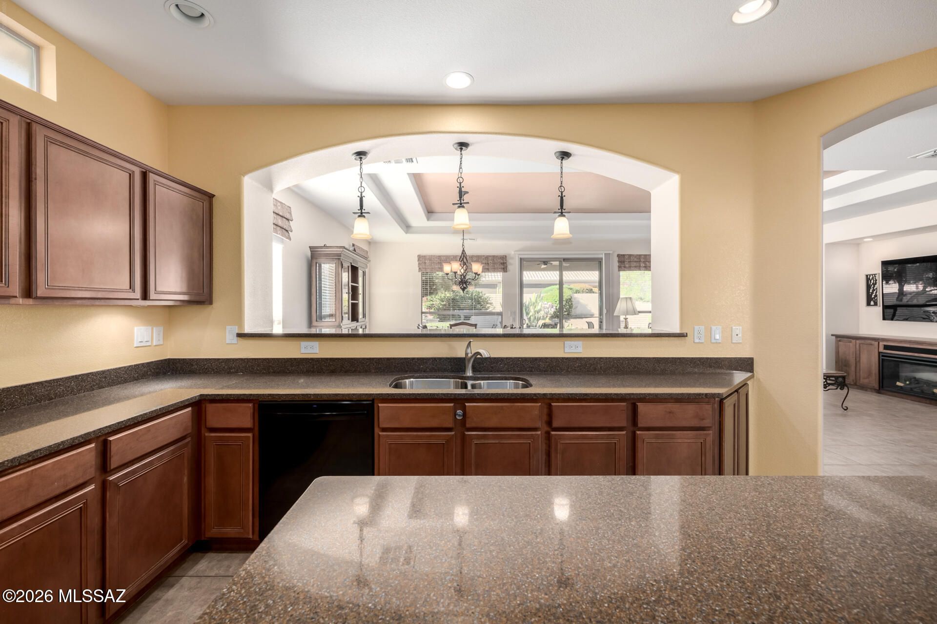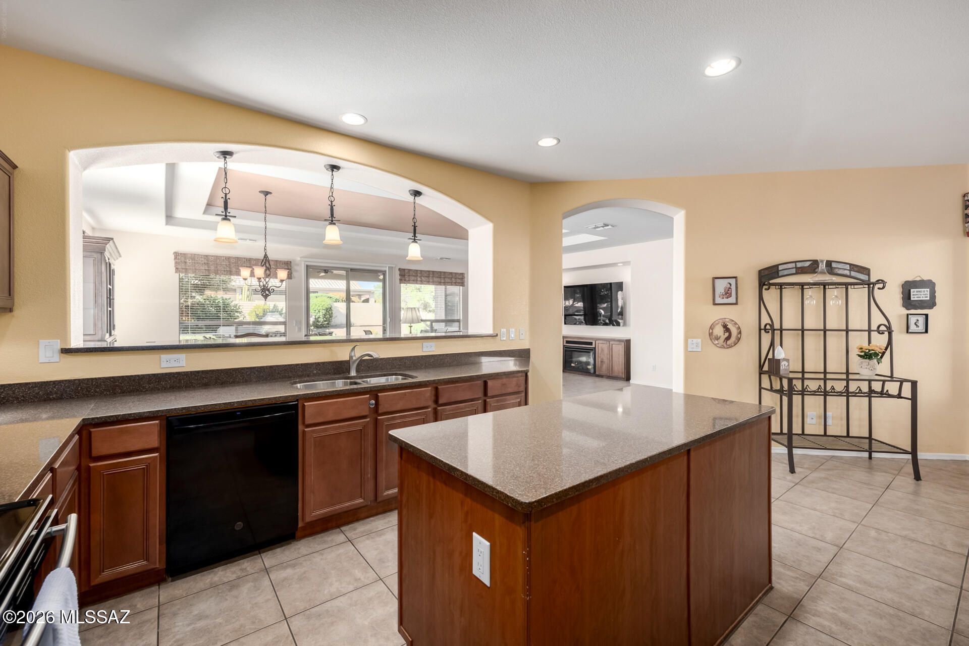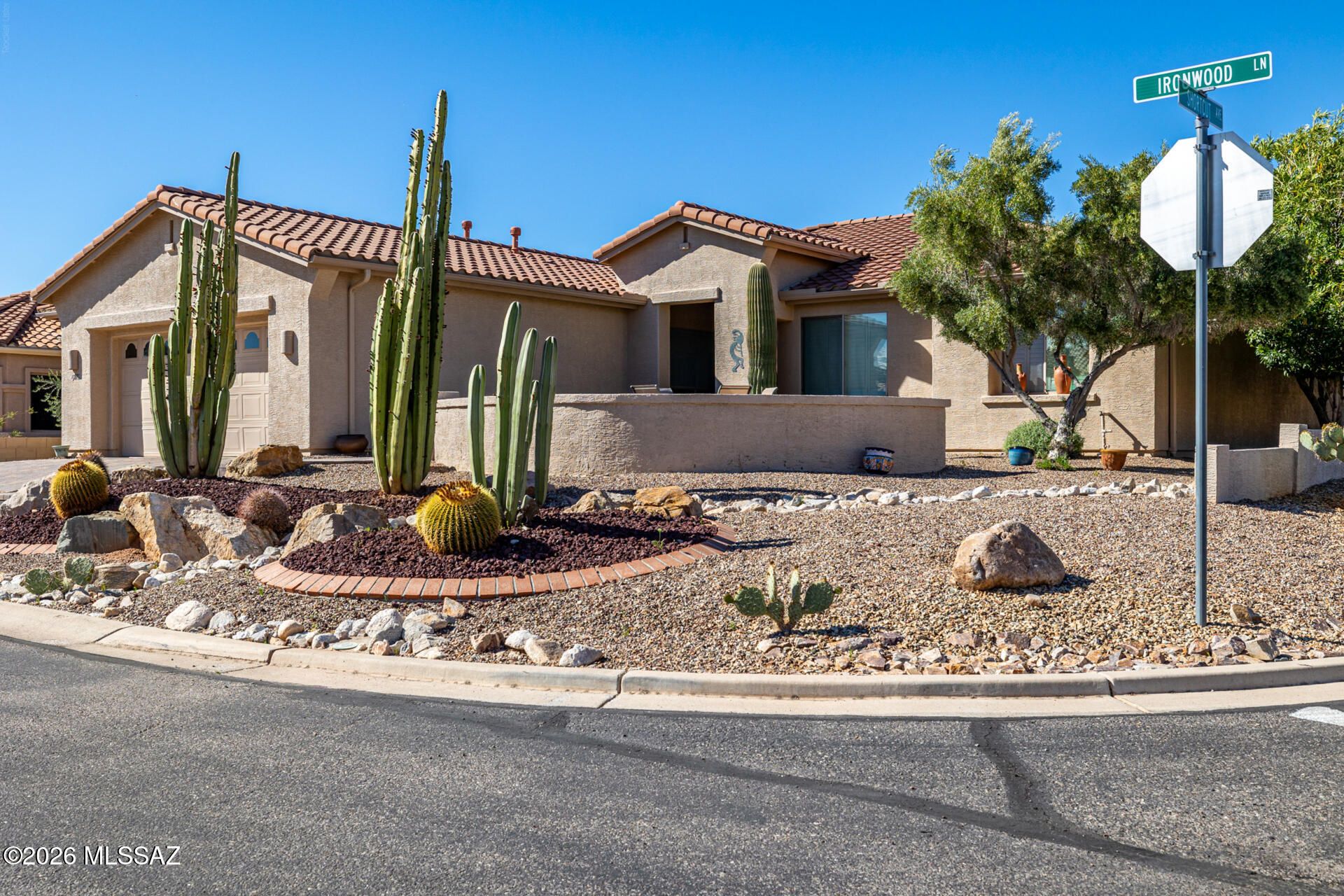 Prepare to be amazed! Check out this fantastic 2 bed, 2 bath with a den property now for sale in Saddlebrooke! Nestled on a premium corner lot and featuring great curb appeal, a low-maintenance desert landscape, a 2-car garage, and a paver driveway. Step inside to discover a spacious great room with a custom palette throughout--perfect for entertaining. The fabulous kitchen is equipped with ample cabinetry, granite countertops, recessed lighting, built-in appliances, a center island, serving window, and a cozy breakfast nook. You'll love the primary suite, boasting elegant wood-look flooring, a carpeted walk-in closet, and a private bath with dual vanities.