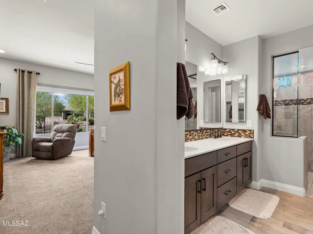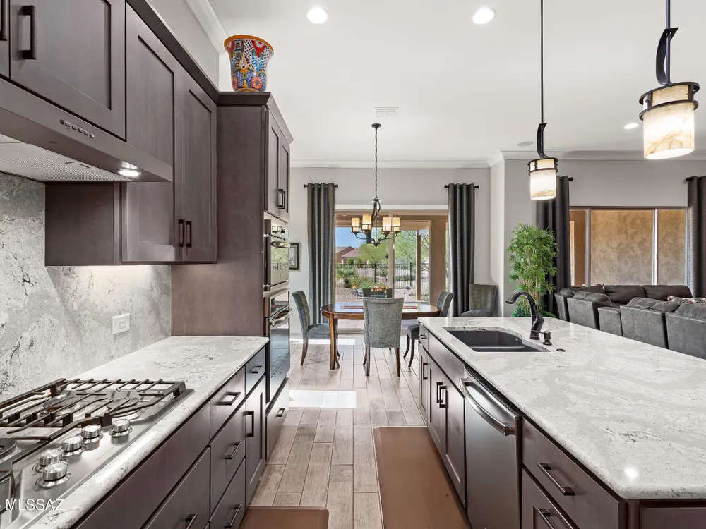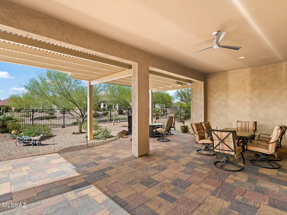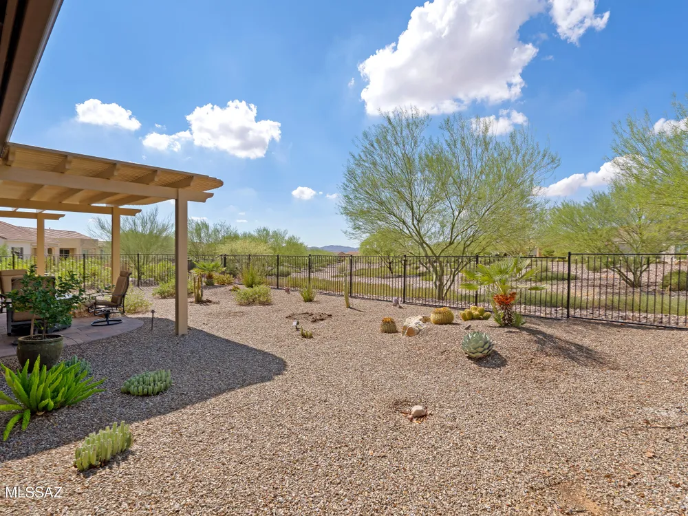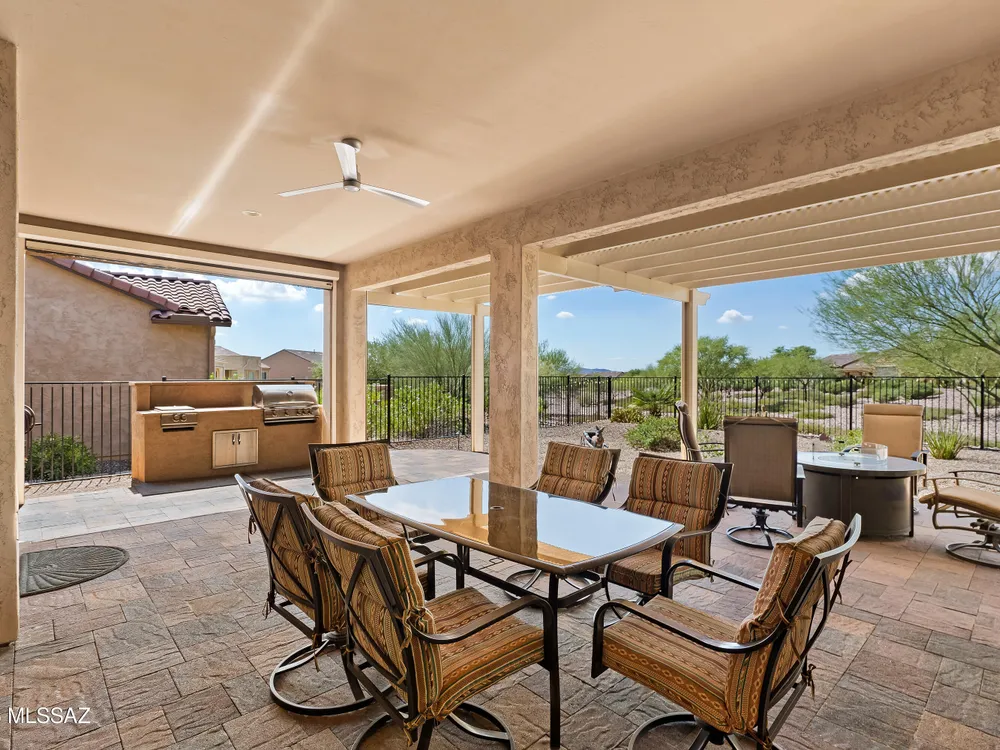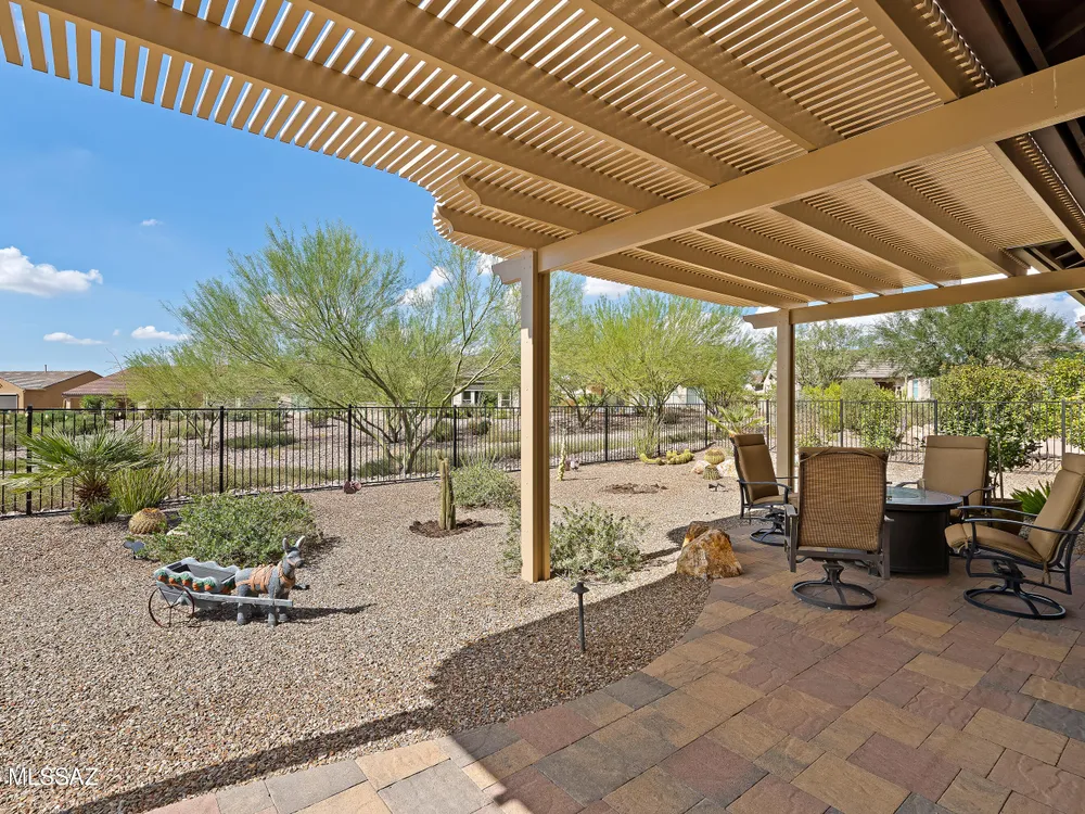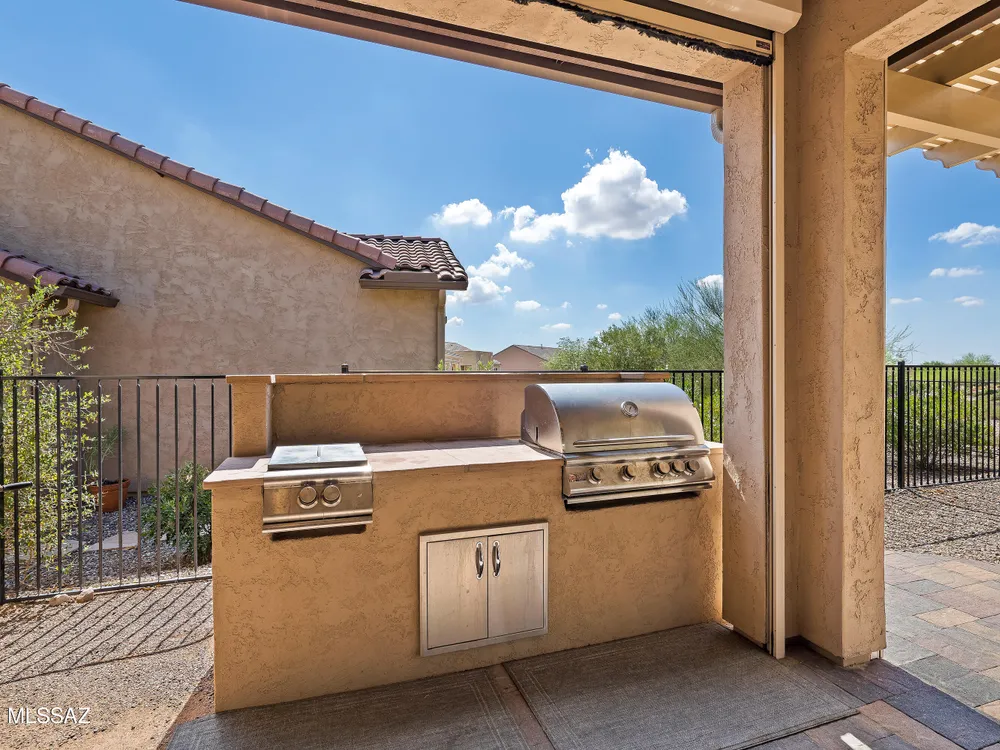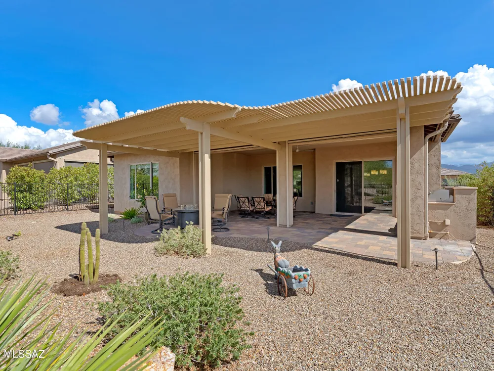 Discover the Popular Alora Model in SaddleBrooke Ranch! Step into this beautifully upgraded and meticulously maintained Alora home, perfectly located in the vibrant, resort-style community of SaddleBrooke Ranch. Designed for both comfort and entertaining, this residence boasts a chef's kitchen complete with stainless steel appliances, quartz countertops, and upgraded cabinetry--all seamlessly flowing into a spacious great room ideal for gatherings. The dedicated dining area opens to an extended covered patio with built-in BBQ and convenient rolling shades, perfect for indoor-outdoor living. The backyard is fully fenced and boasts an amazing pergola. Retreat to the private owner's suite, featuring a luxury walk-in shower, a custom-organized walk-in closet, and a peaceful atmosphere.