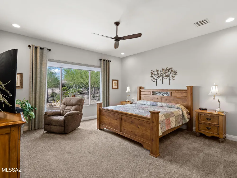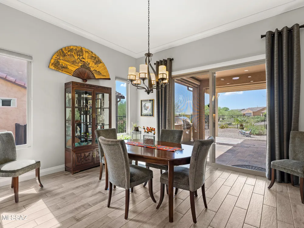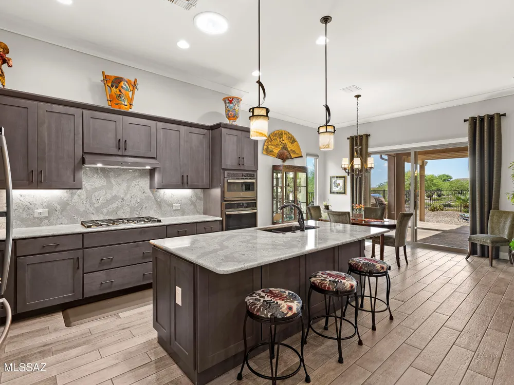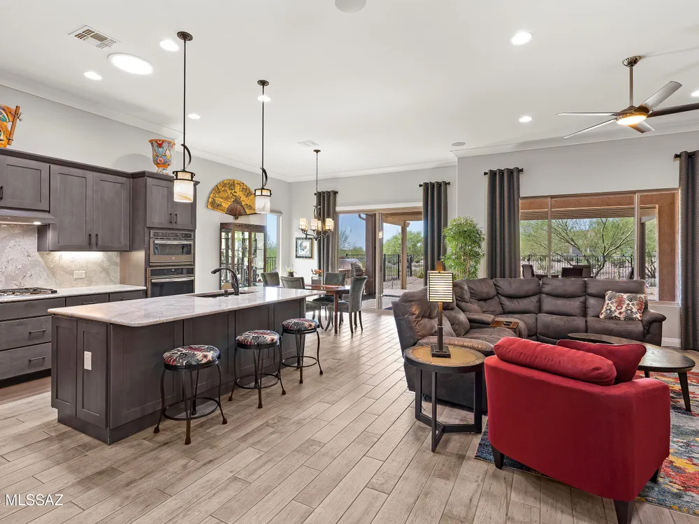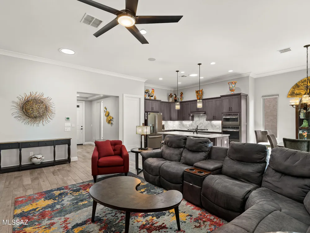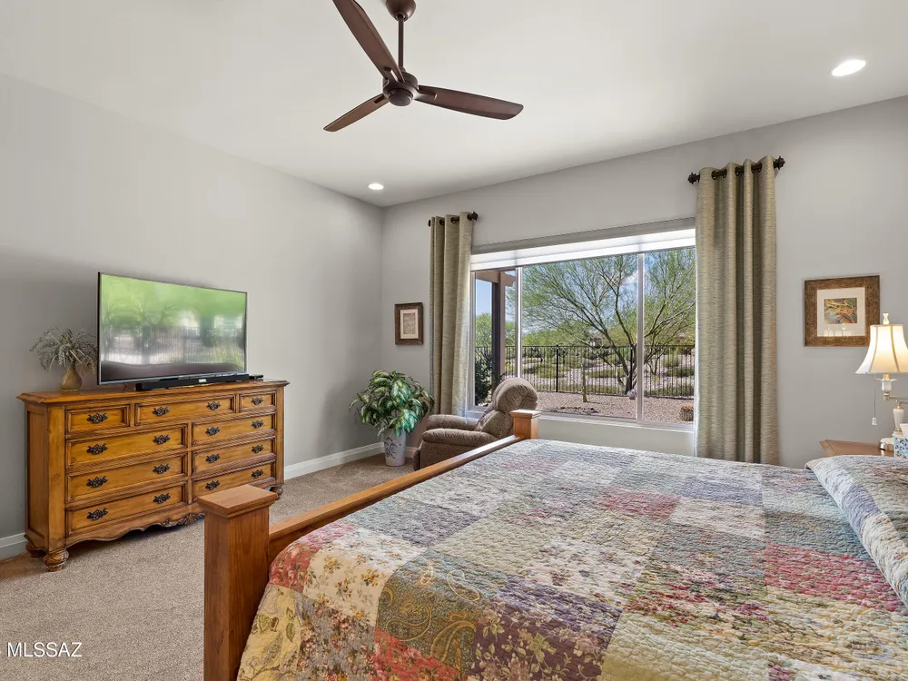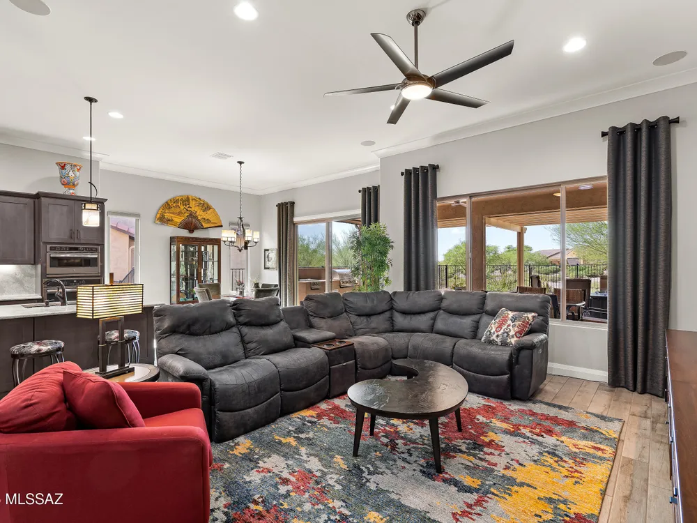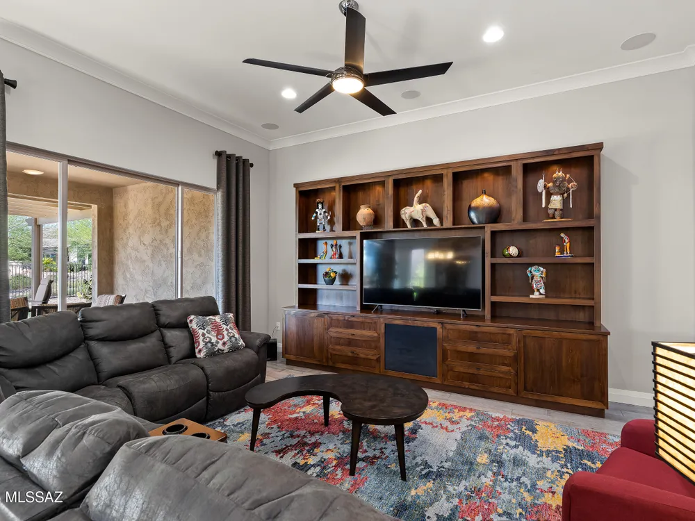 Discover the Popular Alora Model in SaddleBrooke Ranch! Step into this beautifully upgraded and meticulously maintained Alora home, perfectly located in the vibrant, resort-style community of SaddleBrooke Ranch. Designed for both comfort and entertaining, this residence boasts a chef's kitchen complete with stainless steel appliances, quartz countertops, and upgraded cabinetry--all seamlessly flowing into a spacious great room ideal for gatherings. The dedicated dining area opens to an extended covered patio with built-in BBQ and convenient rolling shades, perfect for indoor-outdoor living. The backyard is fully fenced and boasts an amazing pergola. Retreat to the private owner's suite, featuring a luxury walk-in shower, a custom-organized walk-in closet, and a peaceful atmosphere.