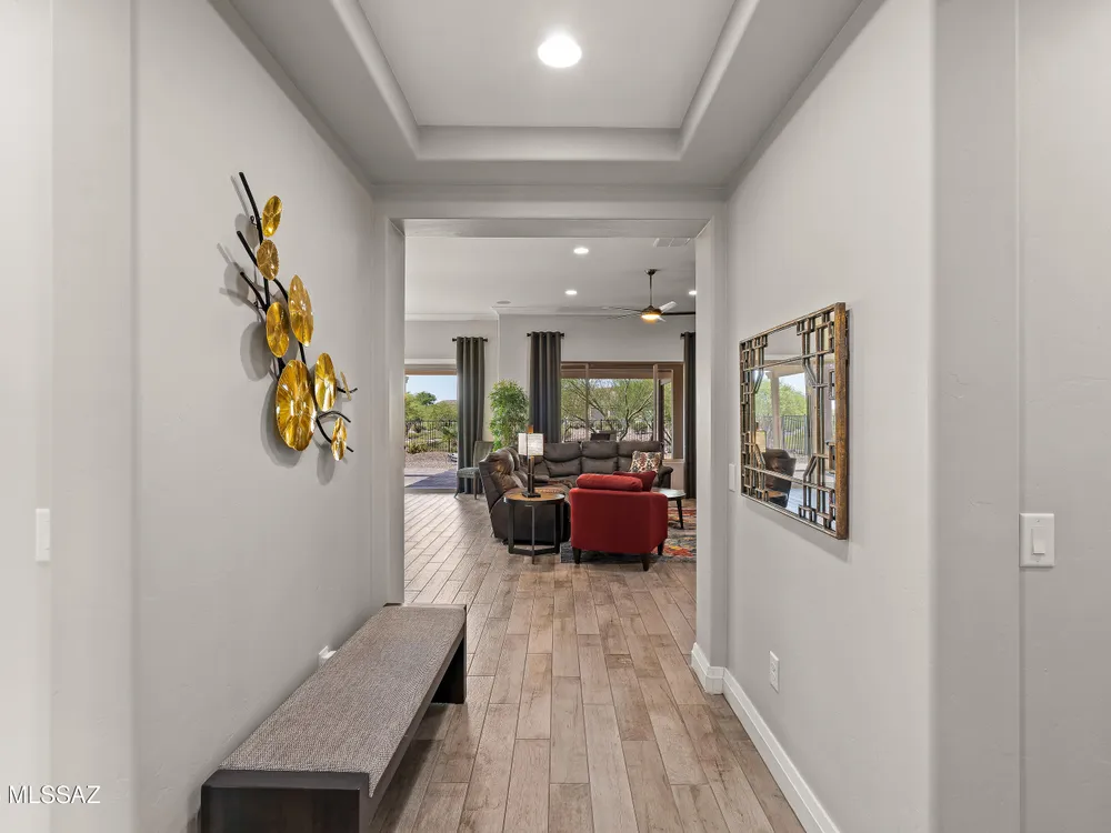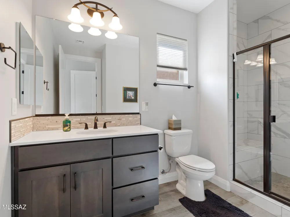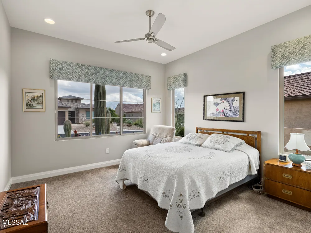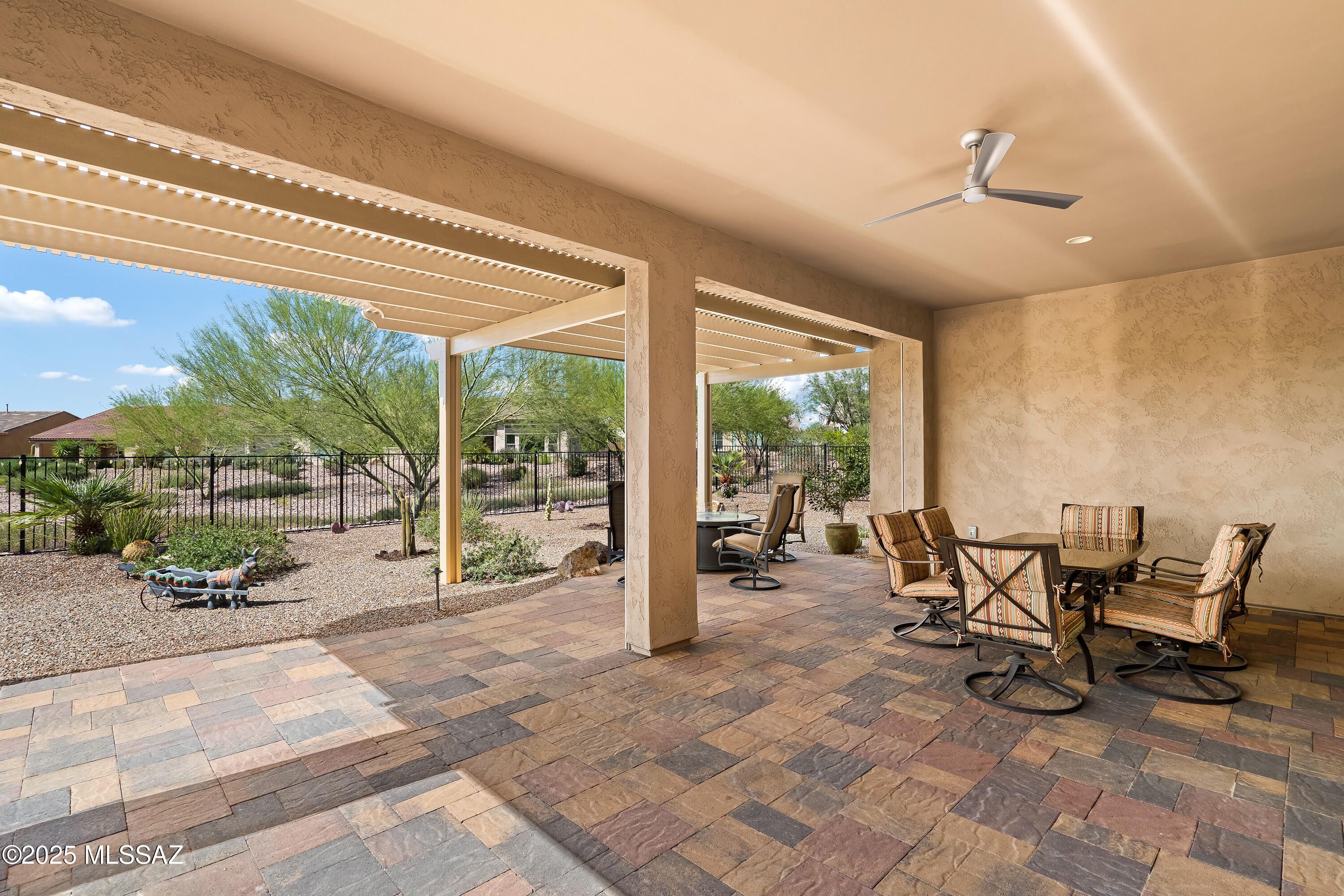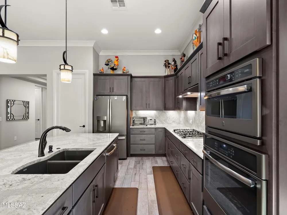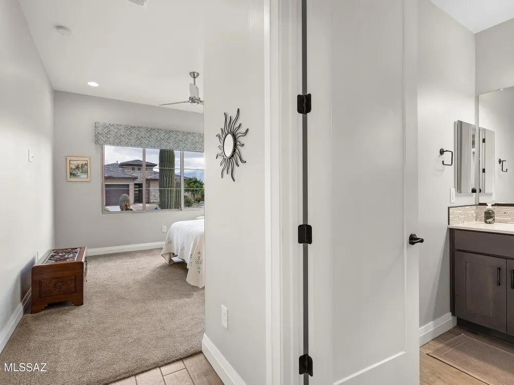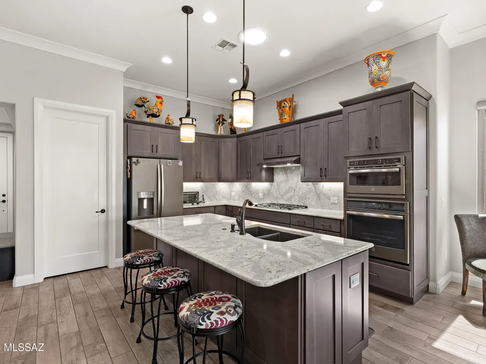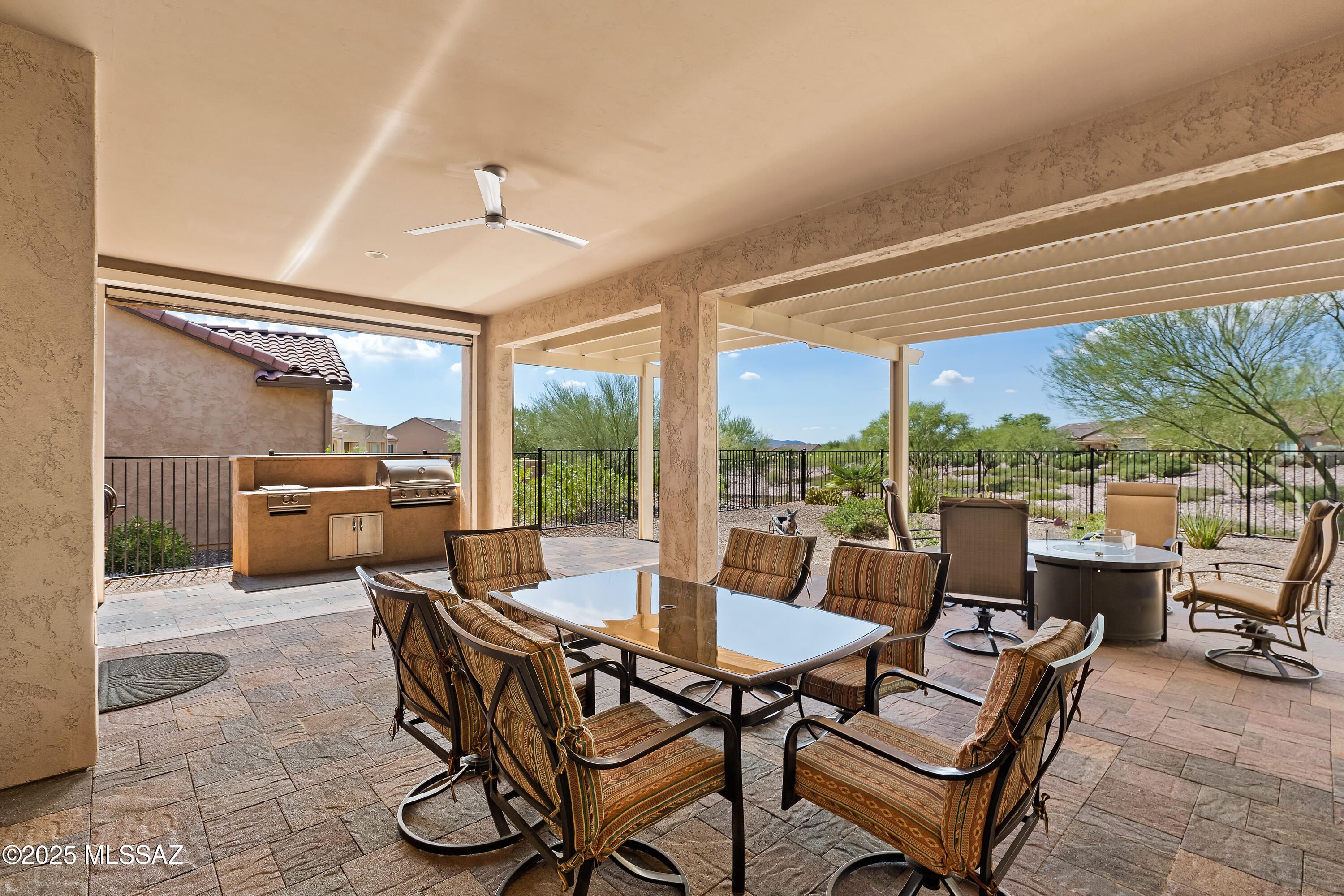 Discover the Popular Alora Model in SaddleBrooke Ranch! Step into this beautifully upgraded and meticulously maintained Alora home, perfectly located in the vibrant, resort-style community of SaddleBrooke Ranch. Designed for both comfort and entertaining, this residence boasts a chef's kitchen complete with stainless steel appliances, quartz countertops, and upgraded cabinetry--all seamlessly flowing into a spacious great room ideal for gatherings. The dedicated dining area opens to an extended covered patio with built-in BBQ and convenient rolling shades, perfect for indoor-outdoor living. The backyard is fully fenced and boasts an amazing pergola. Retreat to the private owner's suite, featuring a luxury walk-in shower, a custom-organized walk-in closet, and a peaceful atmosphere.