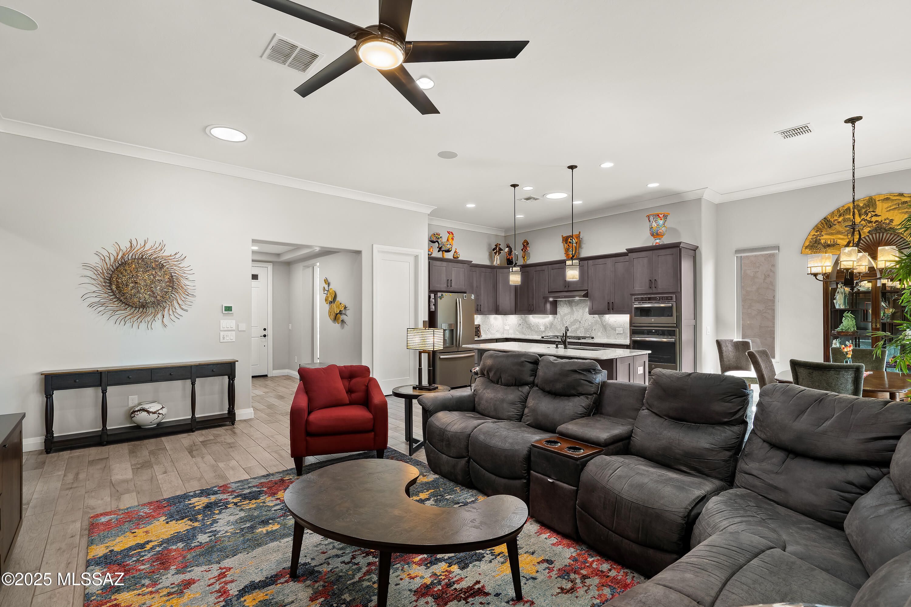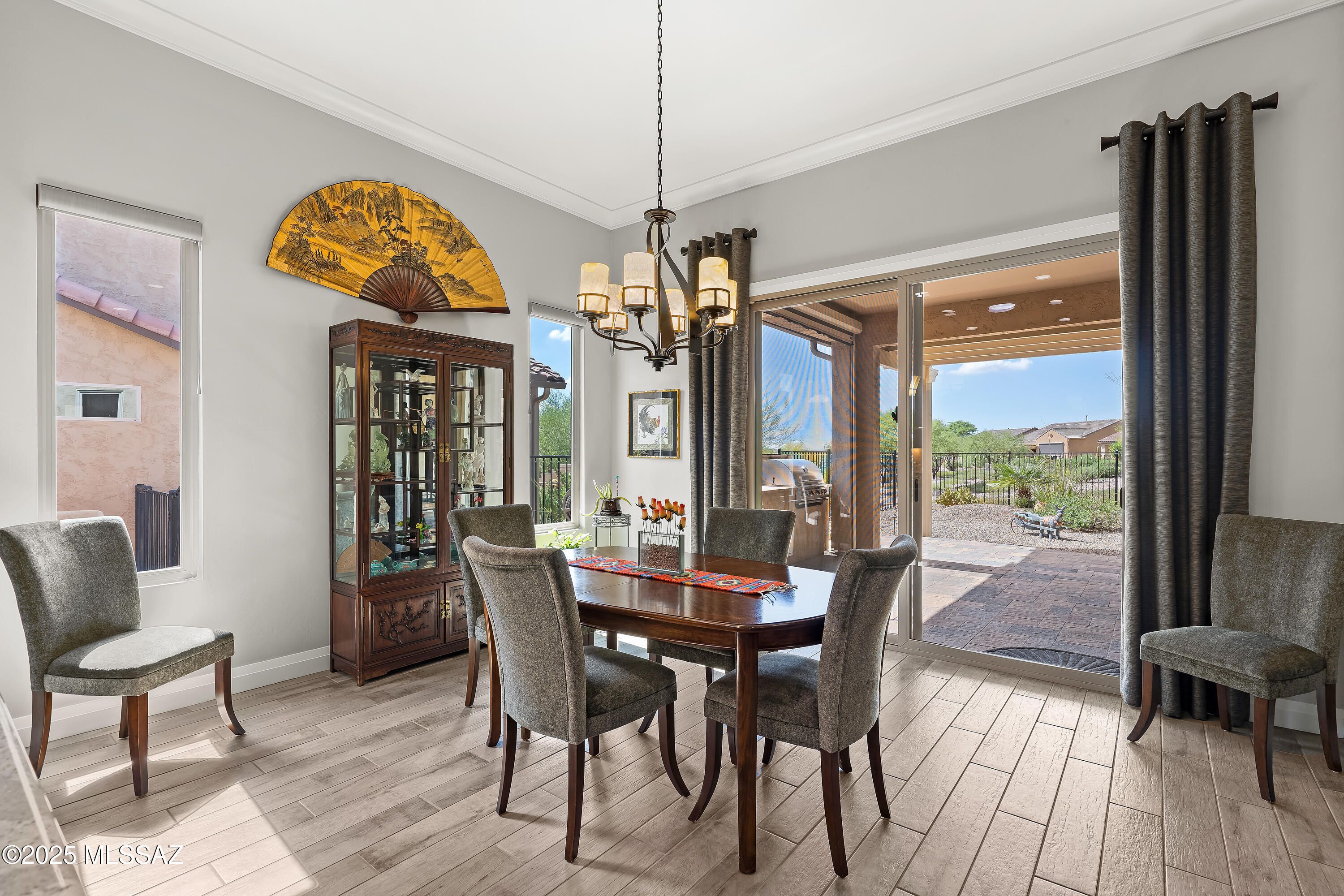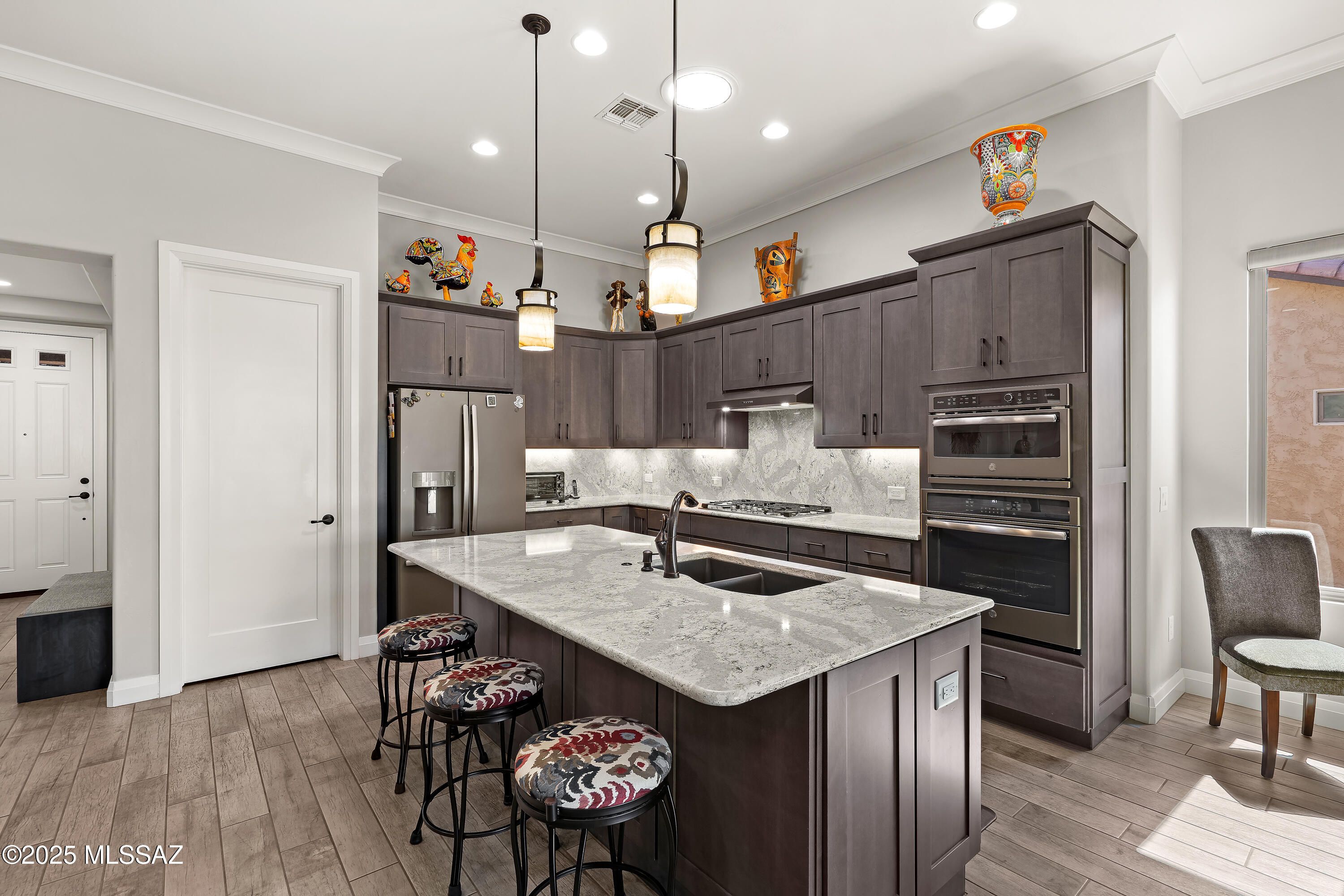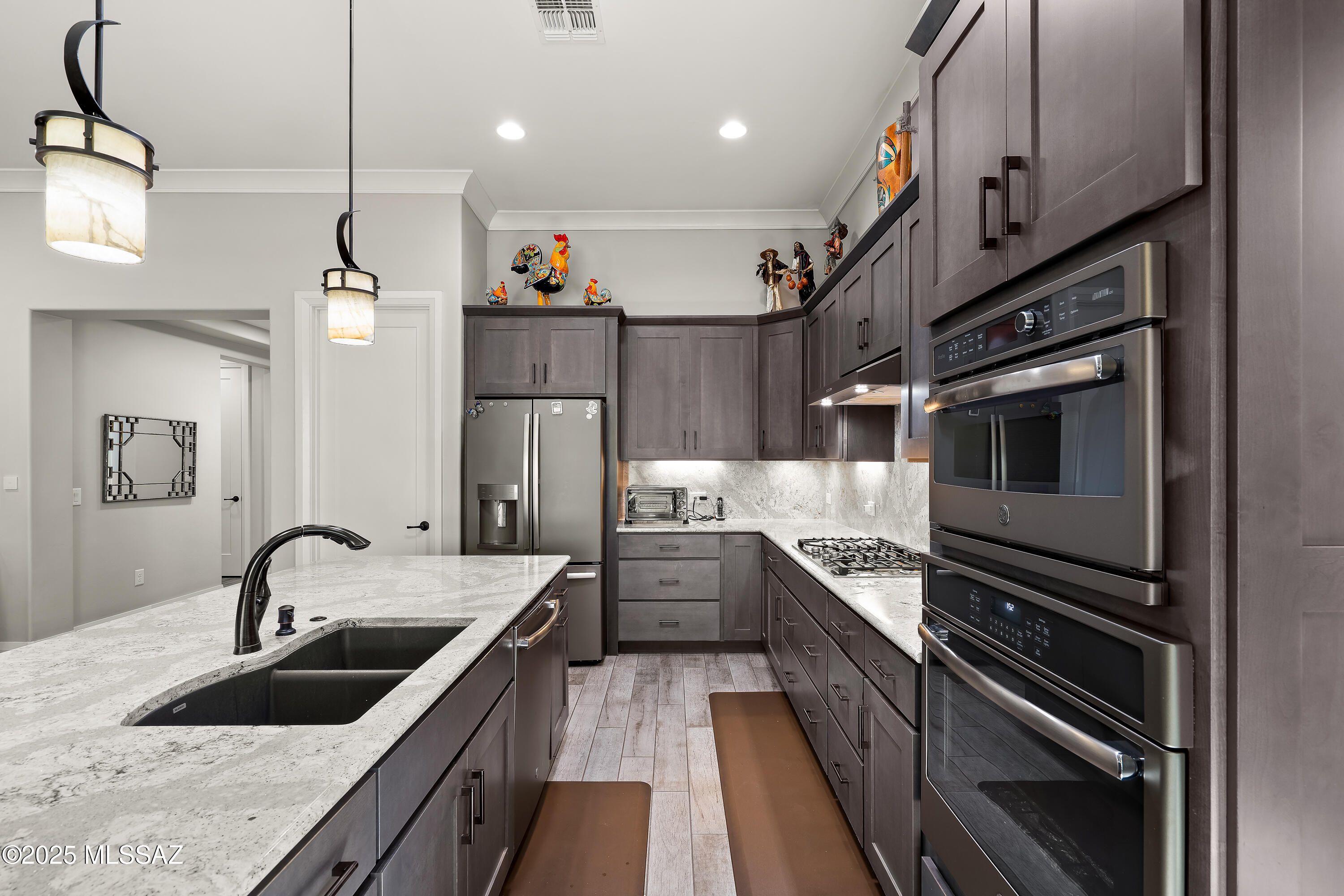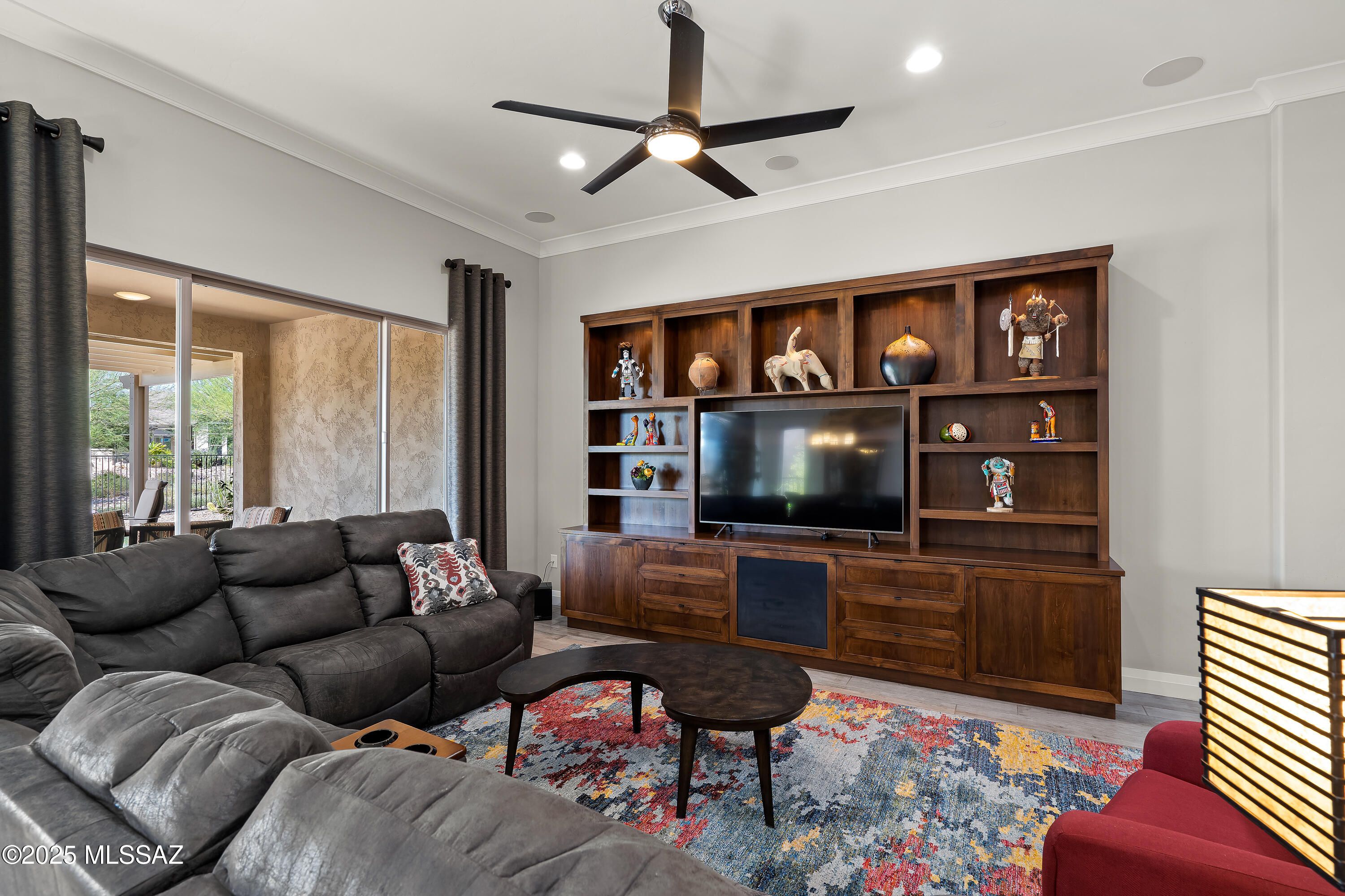 Discover the Popular Alora Model in SaddleBrooke Ranch! Step into this beautifully upgraded and meticulously maintained Alora home, perfectly located in the vibrant, resort-style community of SaddleBrooke Ranch. Designed for both comfort and entertaining, this residence boasts a chef's kitchen complete with stainless steel appliances, quartz countertops, and upgraded cabinetry--all seamlessly flowing into a spacious great room ideal for gatherings. The dedicated dining area opens to an extended covered patio with built-in BBQ and convenient rolling shades, perfect for indoor-outdoor living. The backyard is fully fenced and boasts an amazing pergola. Retreat to the private owner's suite, featuring a luxury walk-in shower, a custom-organized walk-in closet, and a peaceful atmosphere.