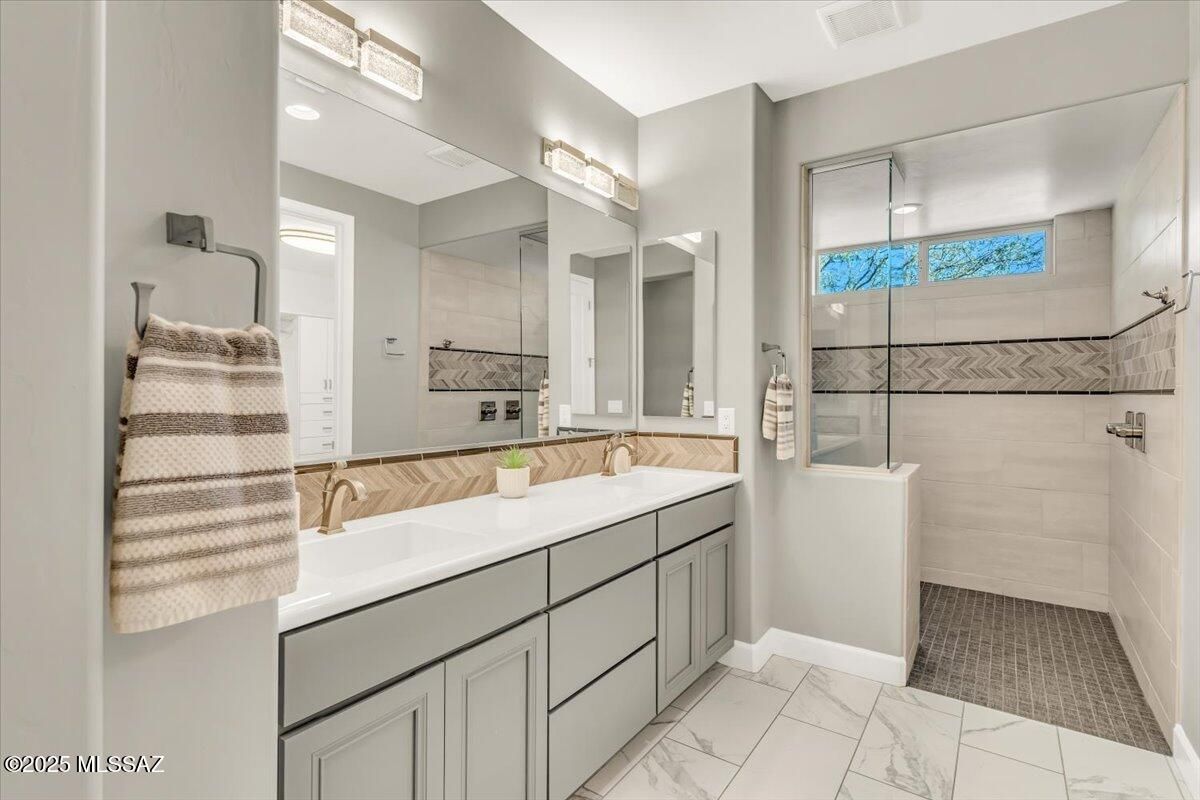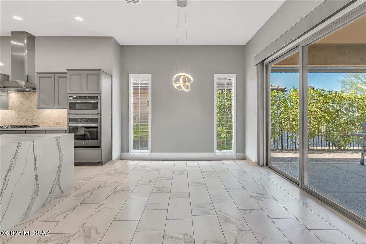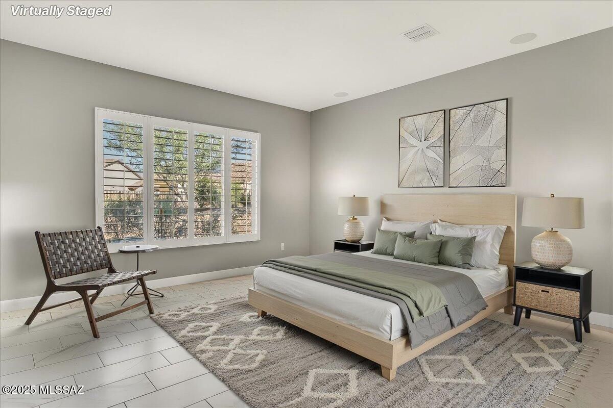 Newly painted interior! This Alora model home in Saddlebrooke Ranch is overloaded with add-ons and upgrades including a home audio system, central vacuum, and security system. And with a private back yard, it will be your perfect retreat or entertaining space. The focal point of the chef's kitchen is the large island with a waterfall quartz countertop. It also features a convection wall oven, gas cooktop, stainless vent hood, walk-in pantry, and tile backsplash - perfect for all your culinary adventures. The primary suite is practically its own wing of the house and has a curbless custom-tiled shower and a custom organizing system in the huge walk-in closet. The guest suite is on the opposite end of the home and is filled with light. It has its own bathroom with custom-tiled shower. The